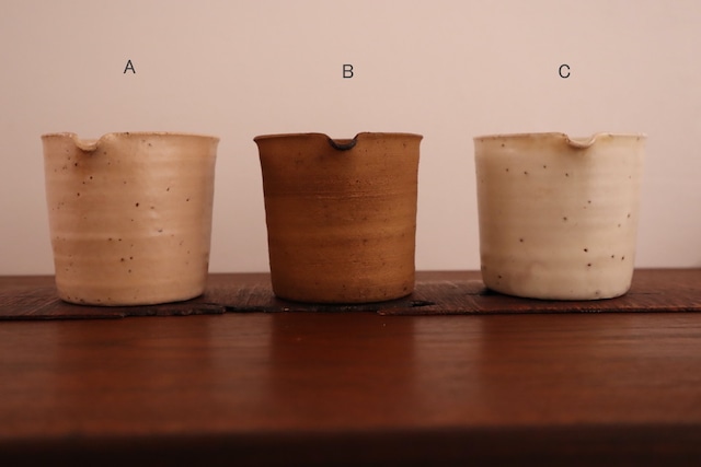 少し歩くと小田原の穏やかな海が見える工房で製作をしている上田浩一さんです 陶胎漆器の茶海3種類です 3種類異なる色合いの茶海は本焼きした陶器に薄めた漆を塗って焼きつけたり、釉薬を掛けた後に漆を塗って焼きつけています、本焼きをした後に塗った漆は低めの温度で焼きつけます 写真AとC 素焼き後に釉薬を掛けて本焼き 漆を塗って低音で焼きつけたもの 写真B 本焼き後に薄めた漆を塗って低温で焼きつけたもの どれも水切れが良く心地よく使っていただけます。 湯冷ましやお酒の片口にもぜひお使いください 口径9,5(口まで)x9cm 高さ8cm 適量で全て200cc 重さ AとC 230グラム B 200グラム