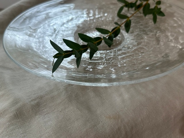 ICYという名前の大皿です 吹いたばかりの熱いガラスのお皿をお水に入れて急冷させることでガラスにヒビを入れます 通常1回で終わらせるそうなのですが、細かいヒビにすることで肌触りも良く、氷のようなひんやりキラキラとした感じを表現するため、温めて冷やすを3回繰り返しています。仕上げに窯の中で焼くことで表面は滑らかな手触りになります。中心から外側に向かって緩やかに立ち上がっています。中心の吹き竿がついていた部分の約径2センチ弱が少し凹凸があります フルーツ、焼き菓子、オードブルのお皿にも、テーブルに置くだけで爽やかな雰囲気になります 今なら黄色いミモザをのせてみたい!! 光を映す大きめなガラスの器は季節を問わず空間を楽しむ手助けをしてくれます 高台があるためにテーブルから浮いたようにも見えます 径28センチ 高さ4,2センチ 高台の径8センチ 高台の高さ約1,2センチ 重さ約780グラム
