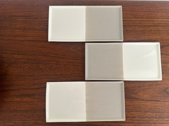 軽井沢の工房で製作している松野彰宏さんは白磁作家さんです 松野さんの器は、品と軽やかさがあり、薄めなのですが使っていて安心感があります 白磁に収縮度の違う色土を重ねるという難しい技法で作品制作をされています 写真の角皿は二色使い 表面の半分は艶のある白い磁器土をそのまま、半分にグレーの土で色化粧をしてマットに仕上げています デザート、一品盛り付けも、前菜にも 数枚重ねても重なりが美しいです サイズ 21x10,5センチ 高さ1センチ 内側は19,2x9センチ 重さ 約173g