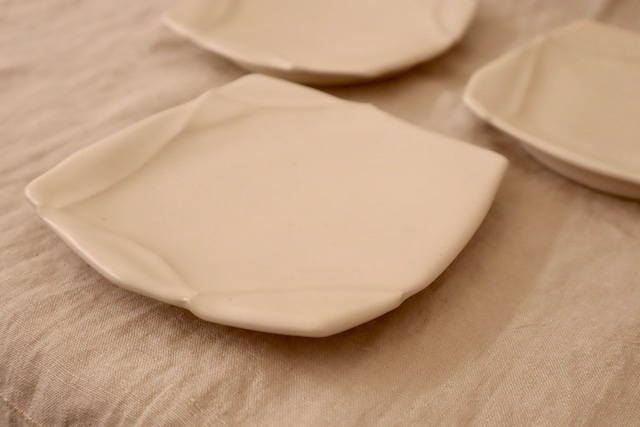 大阪で制作されている松平彩子( ayako matsudaira)さんの磁器角皿です 石川県の磁器土を使い、釉薬の調合で湿地りとした風合いになっています 日本の白をイメージした温かみのあるマットな白 模様は余白のバランスを考えながら全て手彫りをしています。きっちりとした角ではなく、成形後に丸みのある四角にCUTしています。 高台がしっかりあり、手にとった時の安心感、食卓においた様子も美しいです。 お菓子皿、取り皿、一品料理なども引き立ててくれる角皿です 磁器ですので吸水性はありませんので洗ってそのままお使いください ご使用後はなるべく手洗いをお願い致します サイズ 155x155x高さ25ミリ 重さ約280グラム