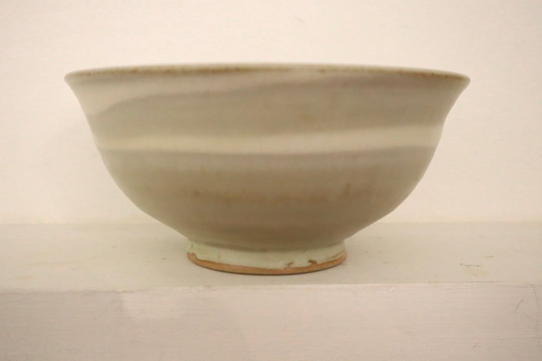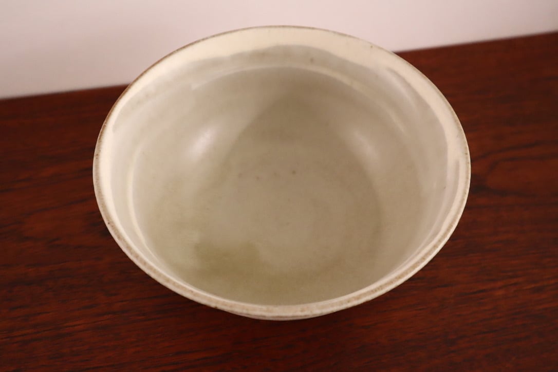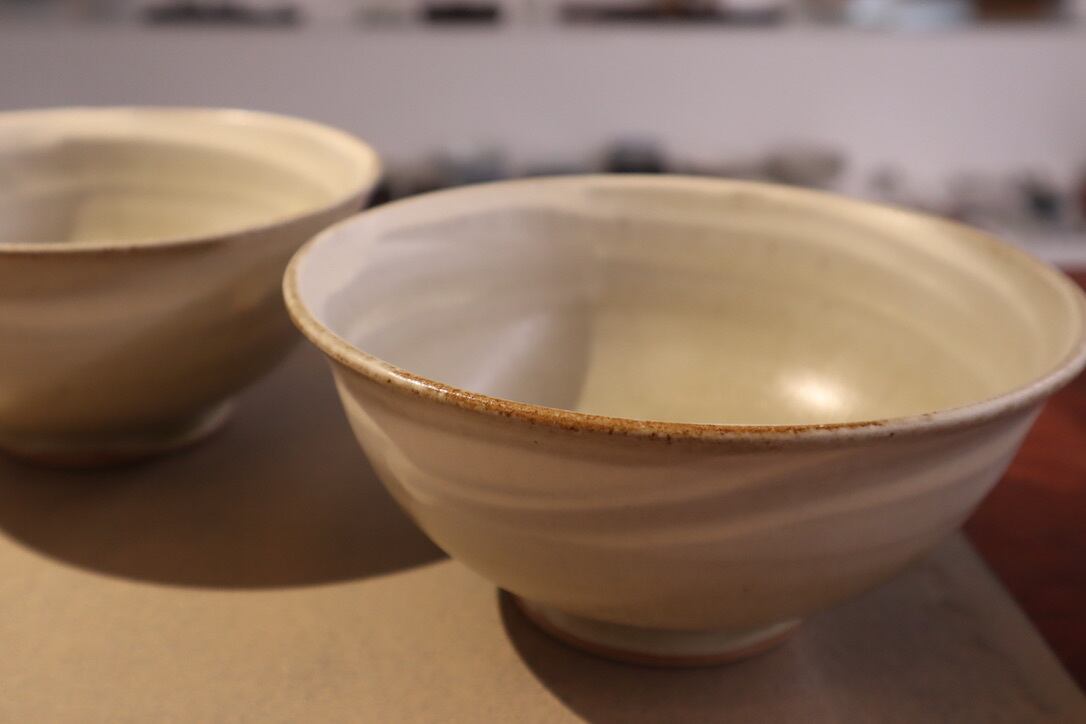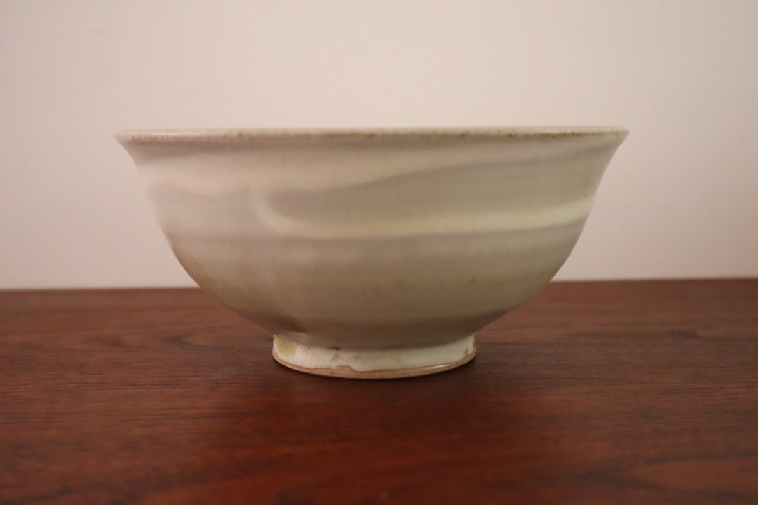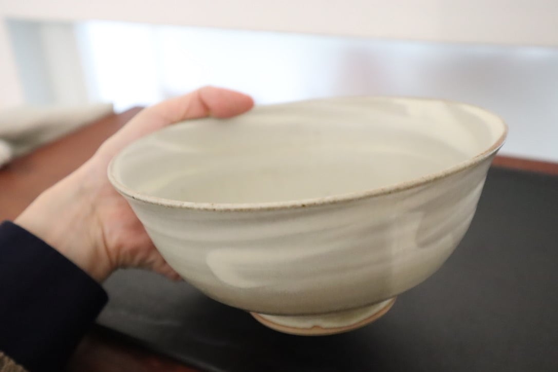秋谷さんの粉引は、無農薬でりんごを育てているりんご農家さんから譲って樹の灰を釉薬に使っています。どんぶり全体に白化粧をした後、りんご釉をかける前に指で直接内側と外側に模様を描いたどんぶりです。一つずつ指で描いているので微妙に描かれた線の動きが違っています