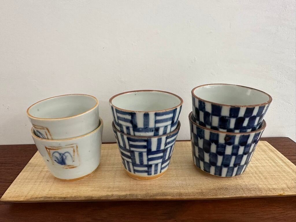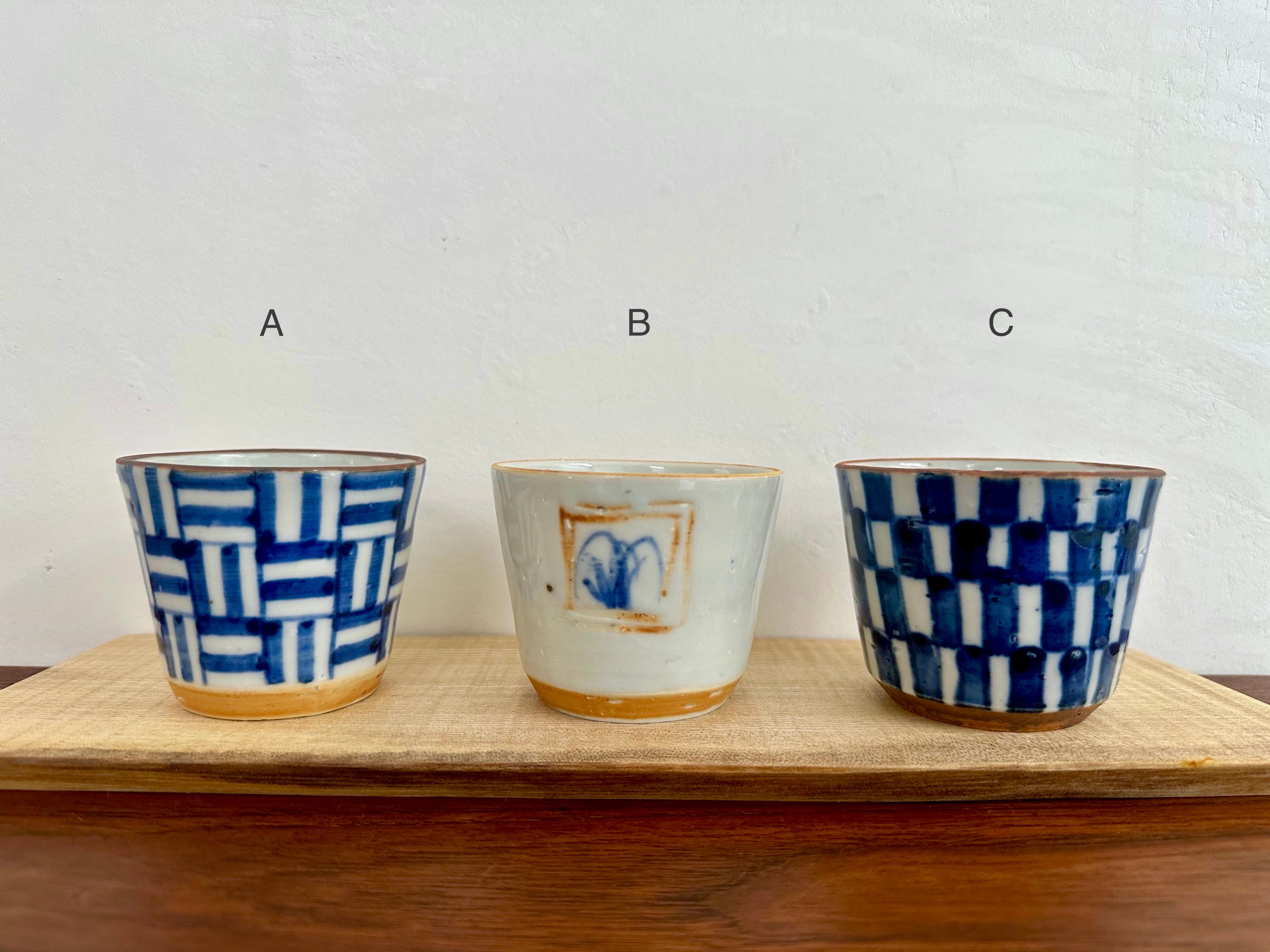 A)染付割付文そば猪口 口径7,5センチ 高さ6センチ 重さ約100g 満水で150cc