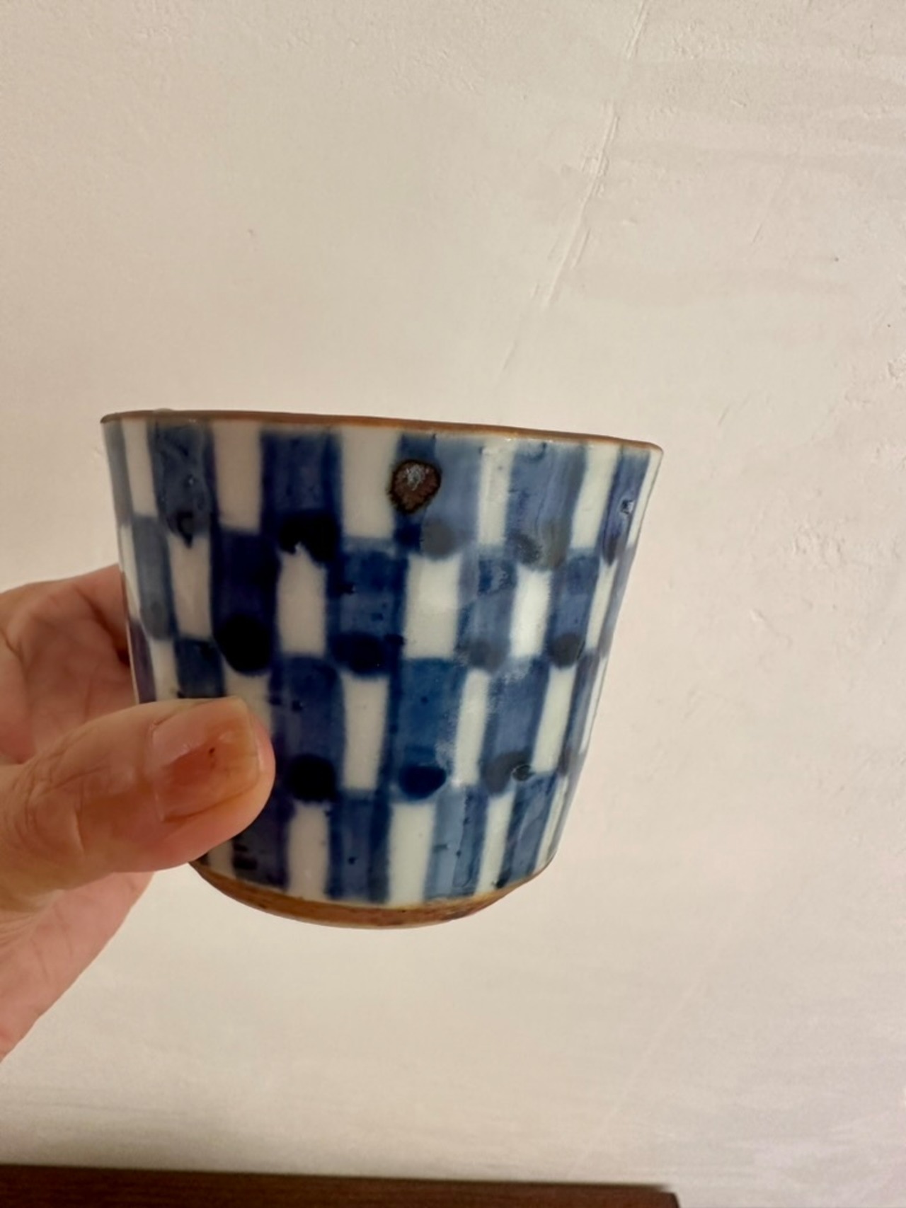 C)染付江戸格子文そば猪口 口径8センチ 高さ6,3センチ 重さ約140g 満水で150cc