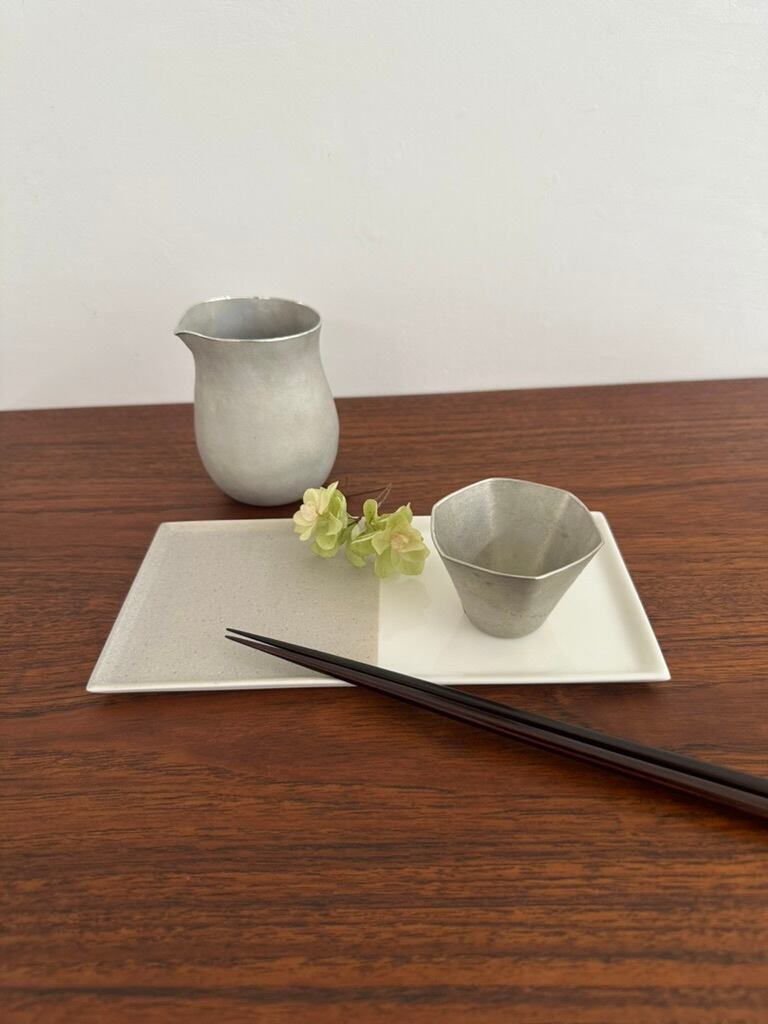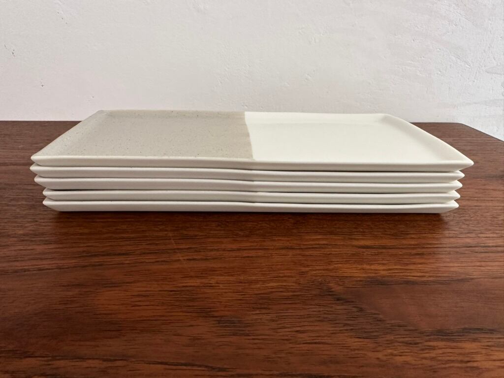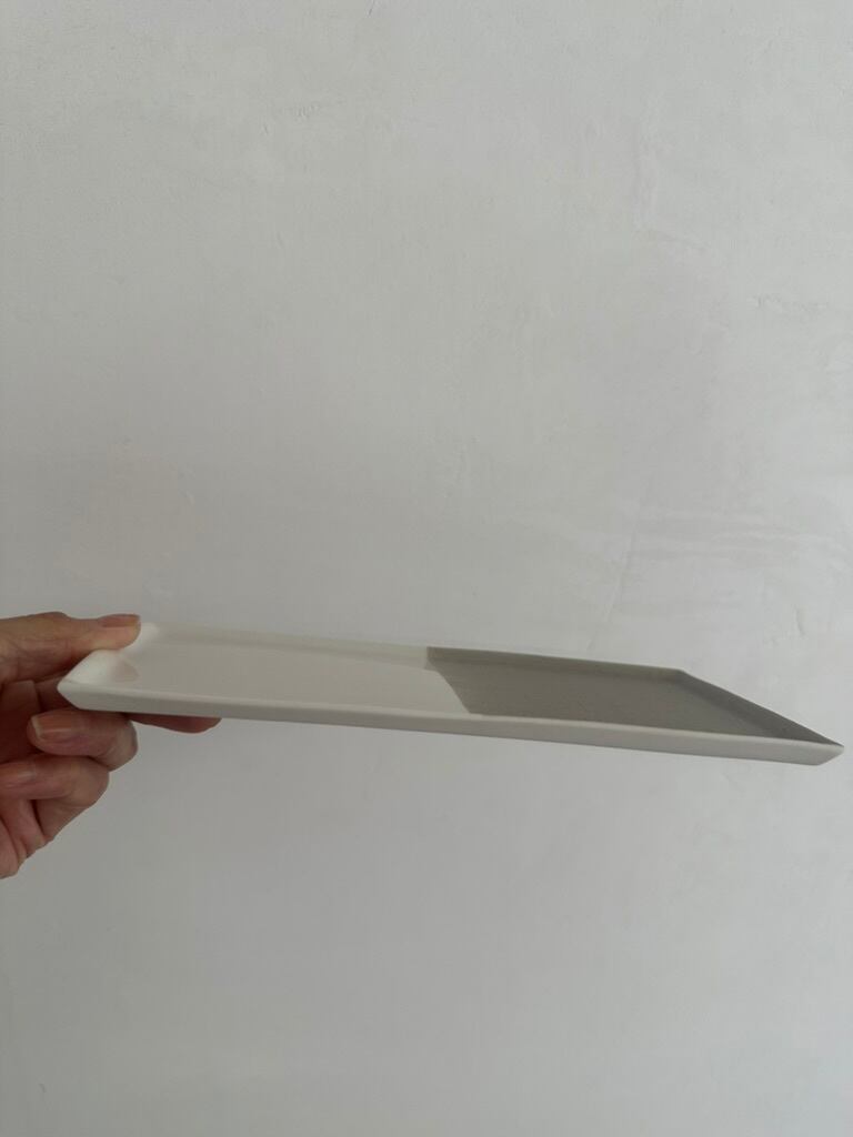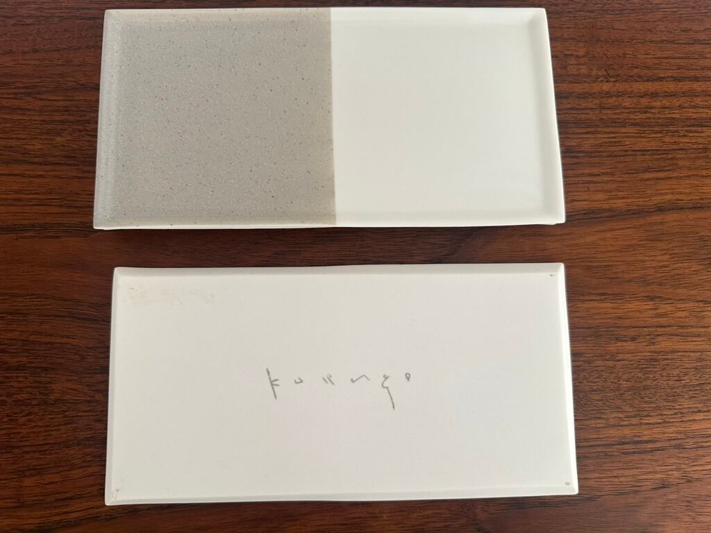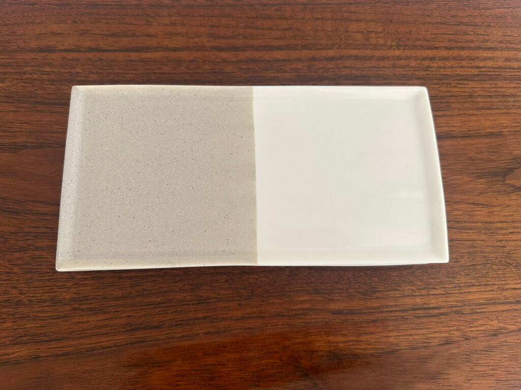 写真の角皿は二色使い 表面の半分は艶のある白い磁器土をそのまま、半分にグレーの土で色化粧をしてマットに仕上げています