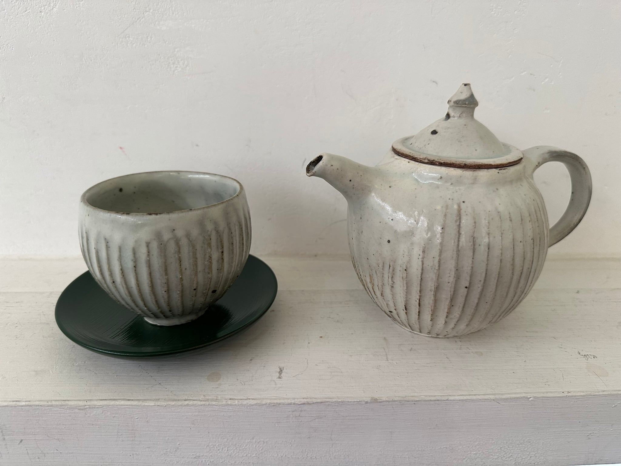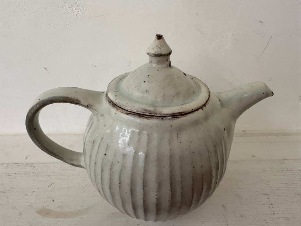粉引にかけられた灰釉も良い表情をしている鎬のポットです