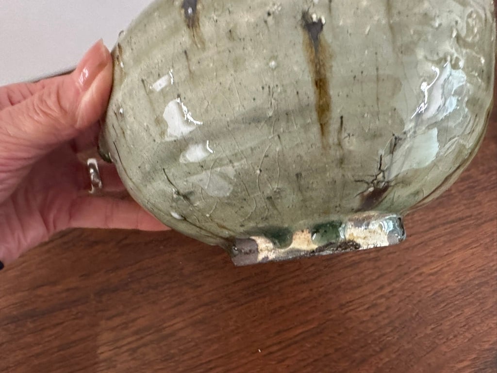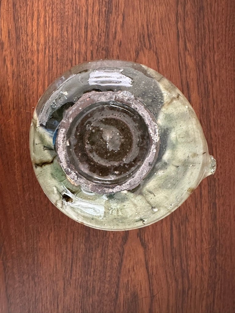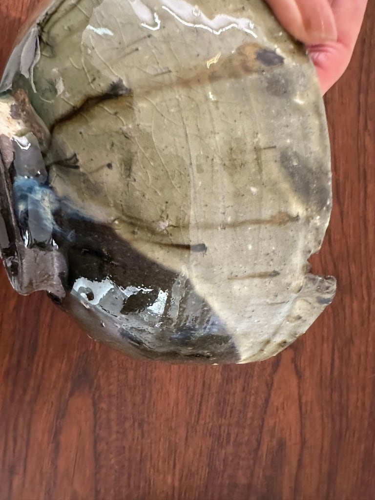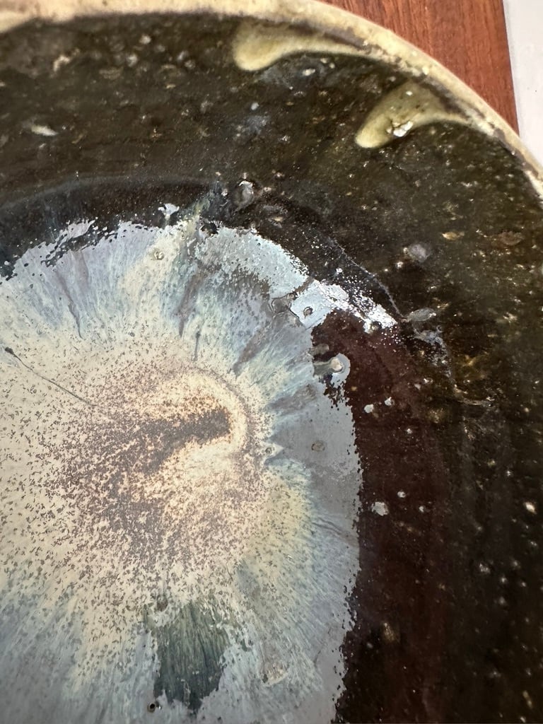 全体に艶があり、内と外の釉の色が違うことにまず驚きます。たっぷりかけられた釉薬の流れた色、溜まった色、焼くことで石粒が押し出されて飛び出していたりと 見れば見るほど発見があって楽しめます。内側の底に何層にも重なった釉の色に引き込まれそうに魅力があります