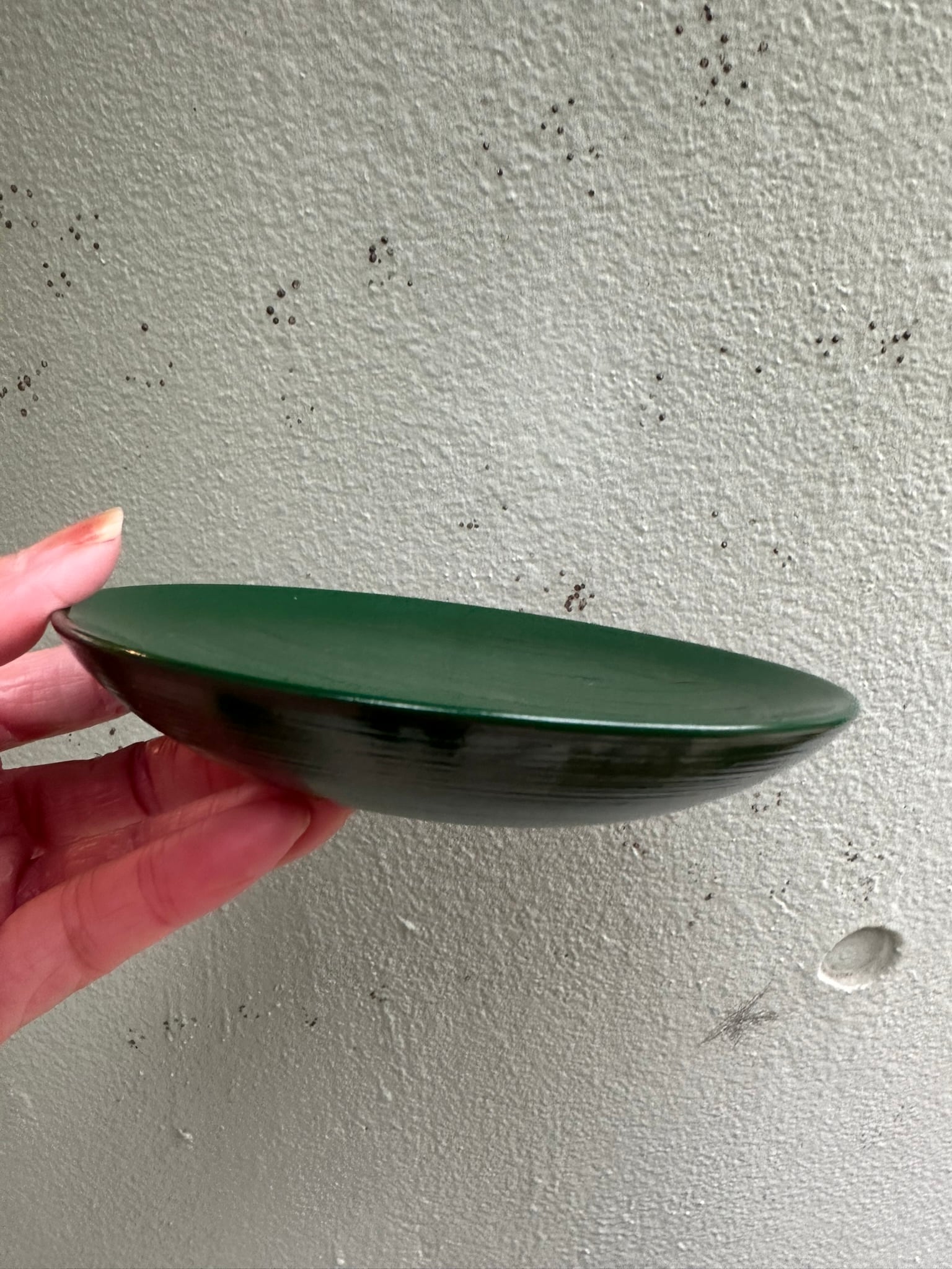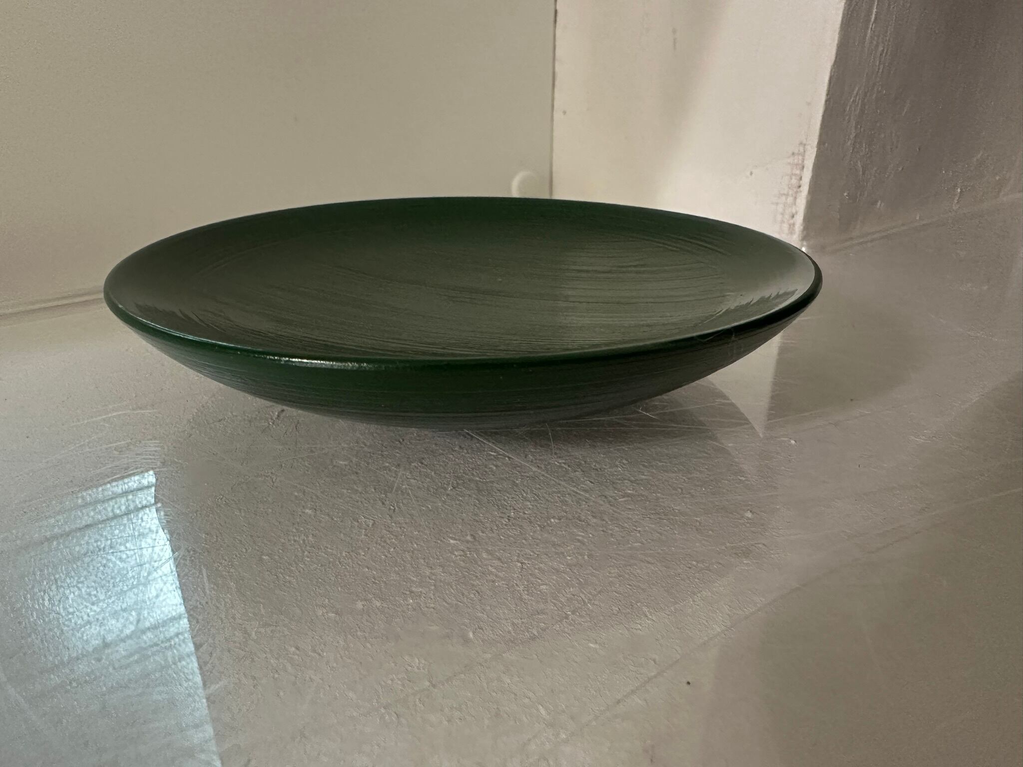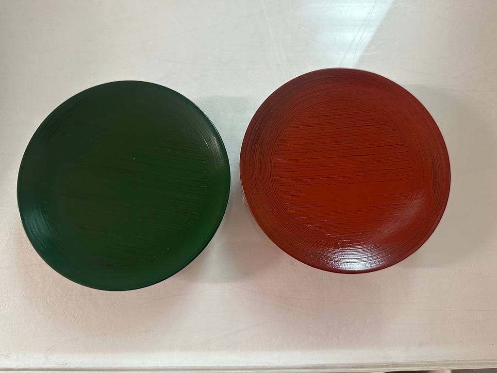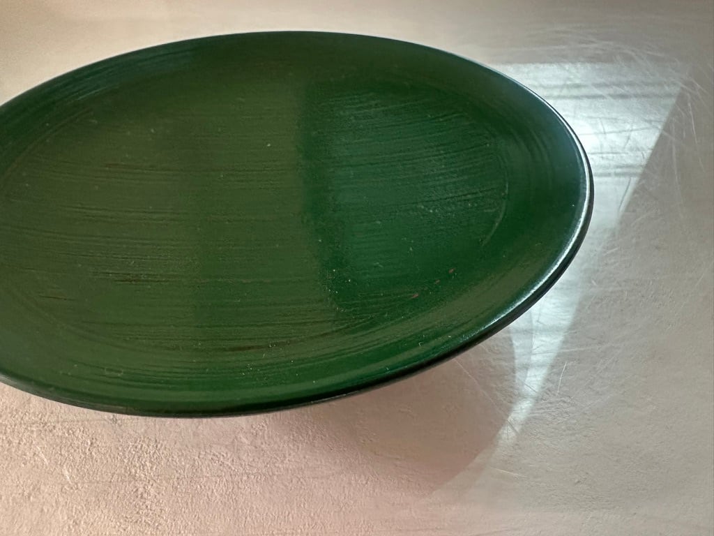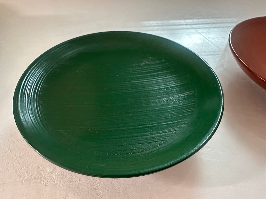 青根来木皿は赤漆の上から緑色の漆を重ね、下の赤漆の色が見えるように塗ってあります。