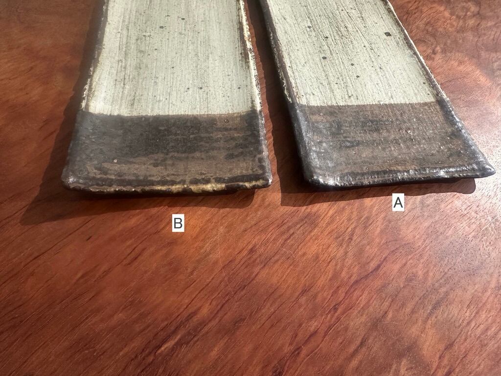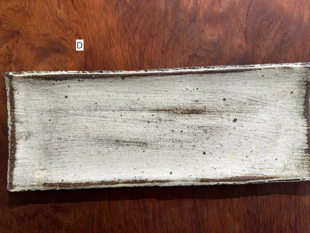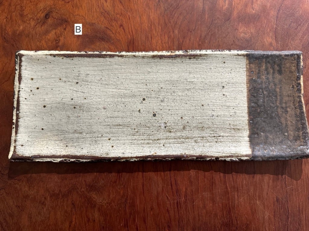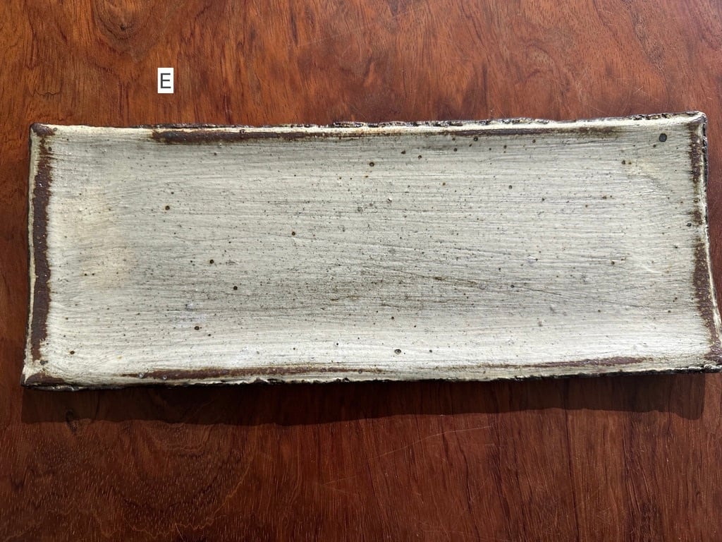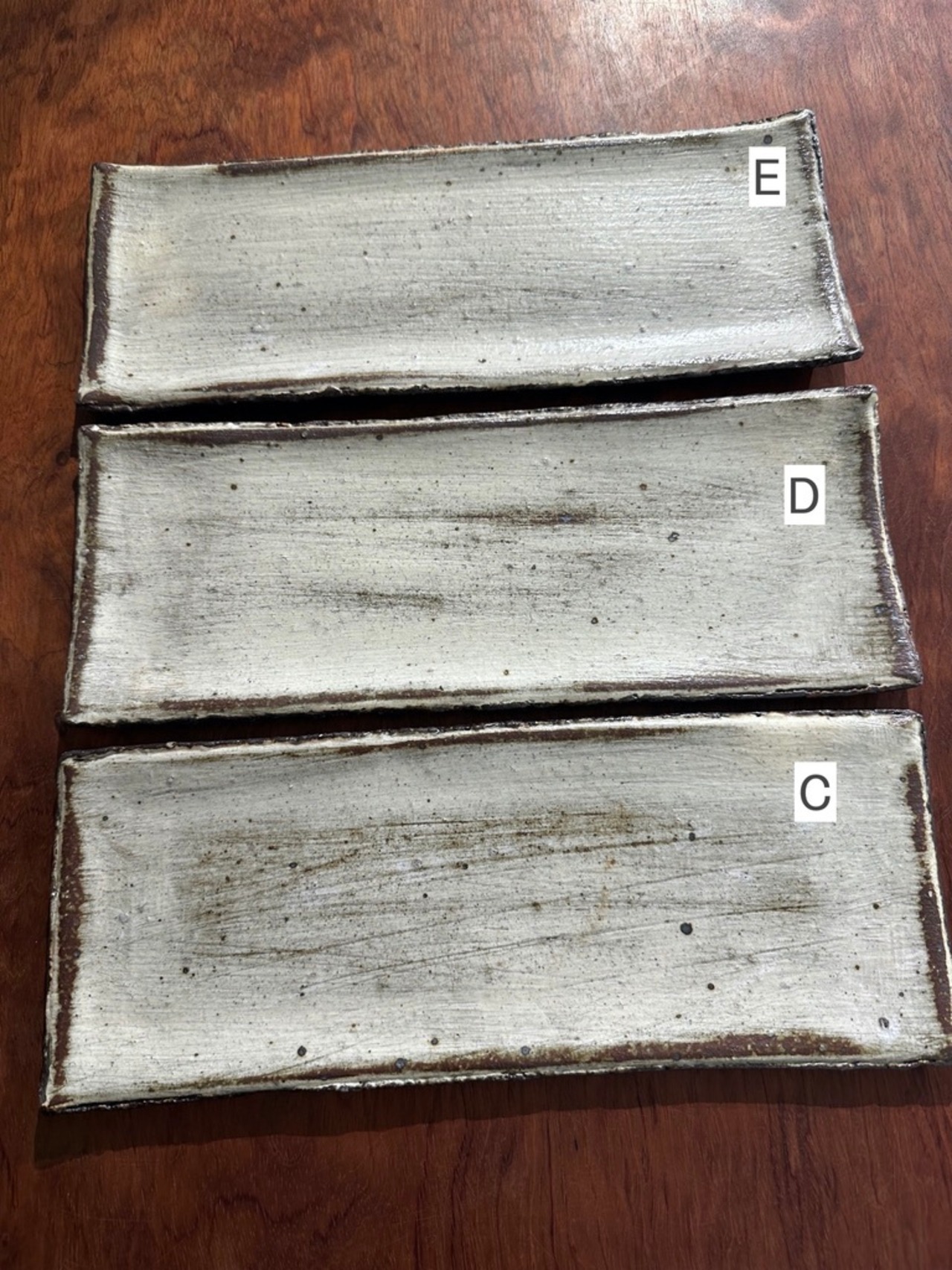 長皿はその時々でサイズ違いを作られています。今回は長いお皿のお願いをしていましたので、フラットでかたつきがなるべく減らして安定の良いもの、そして表情に面白みあるお皿に仕上げることに時間がかかってしまわれたそうです。
