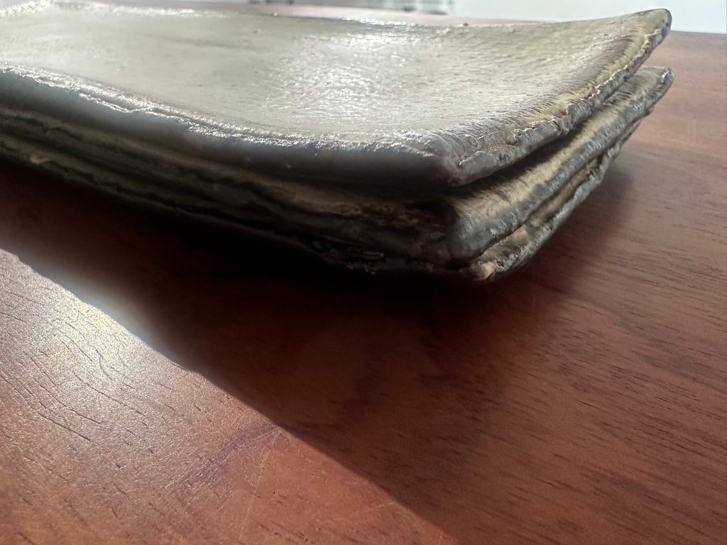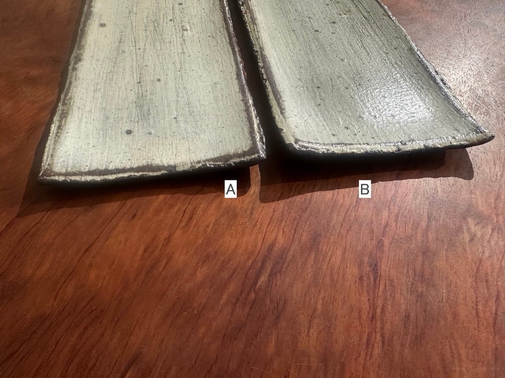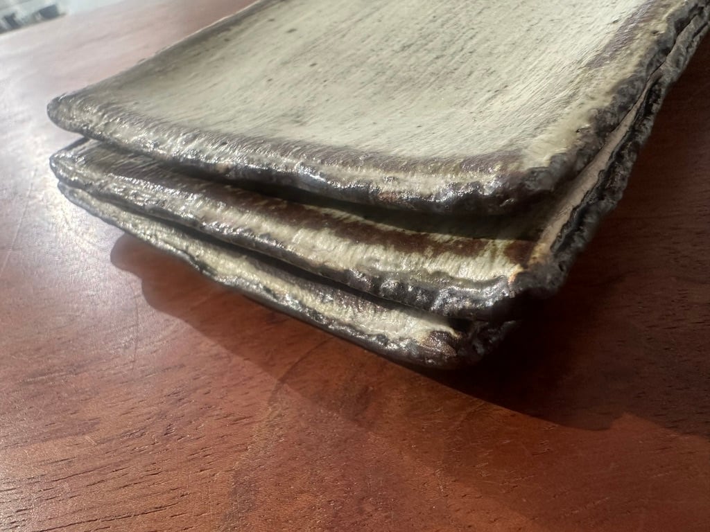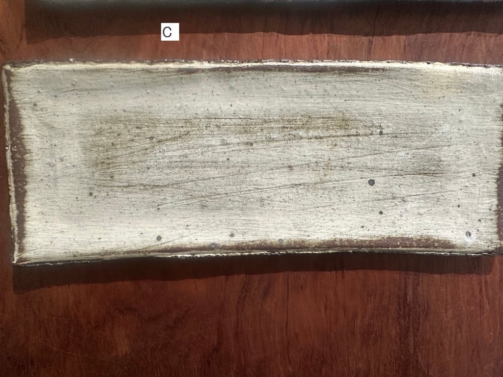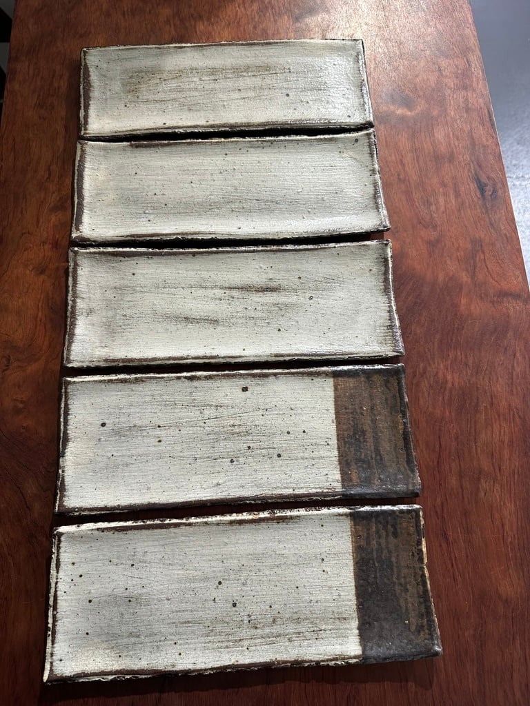 長皿はその時々でサイズ違いを作られています。今回は長いお皿のお願いをしていましたので、フラットでかたつきがなるべく減らして安定の良いもの、そして表情に面白みあるお皿に仕上げることに時間がかかってしまわれたそうです。