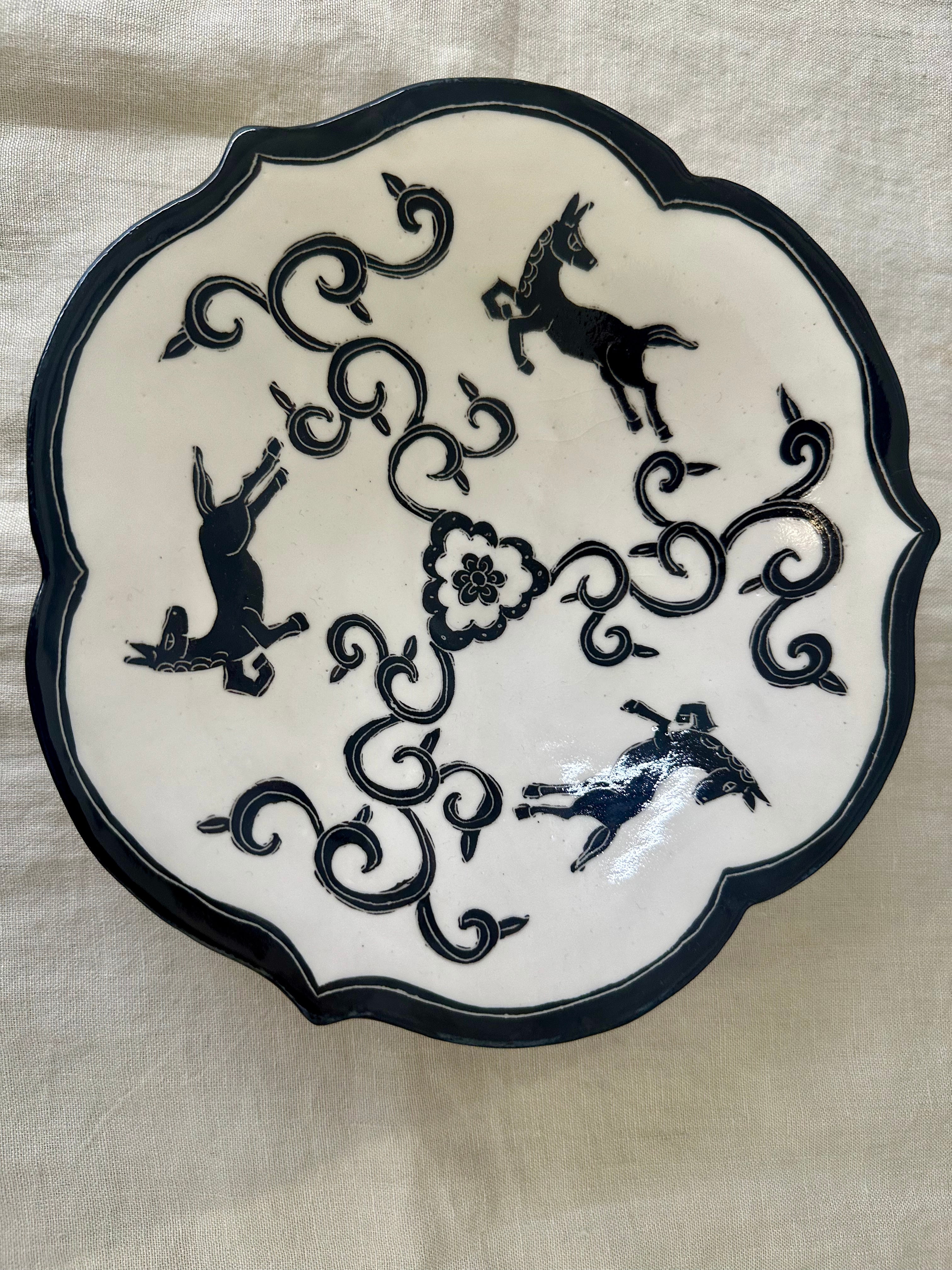 掻き落としで動物が描かれた輪花鉢です来年の干支の馬も描いてくださいました