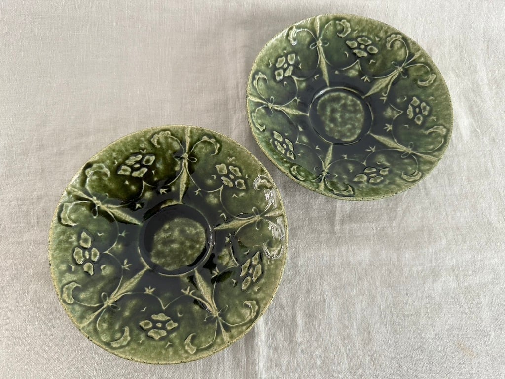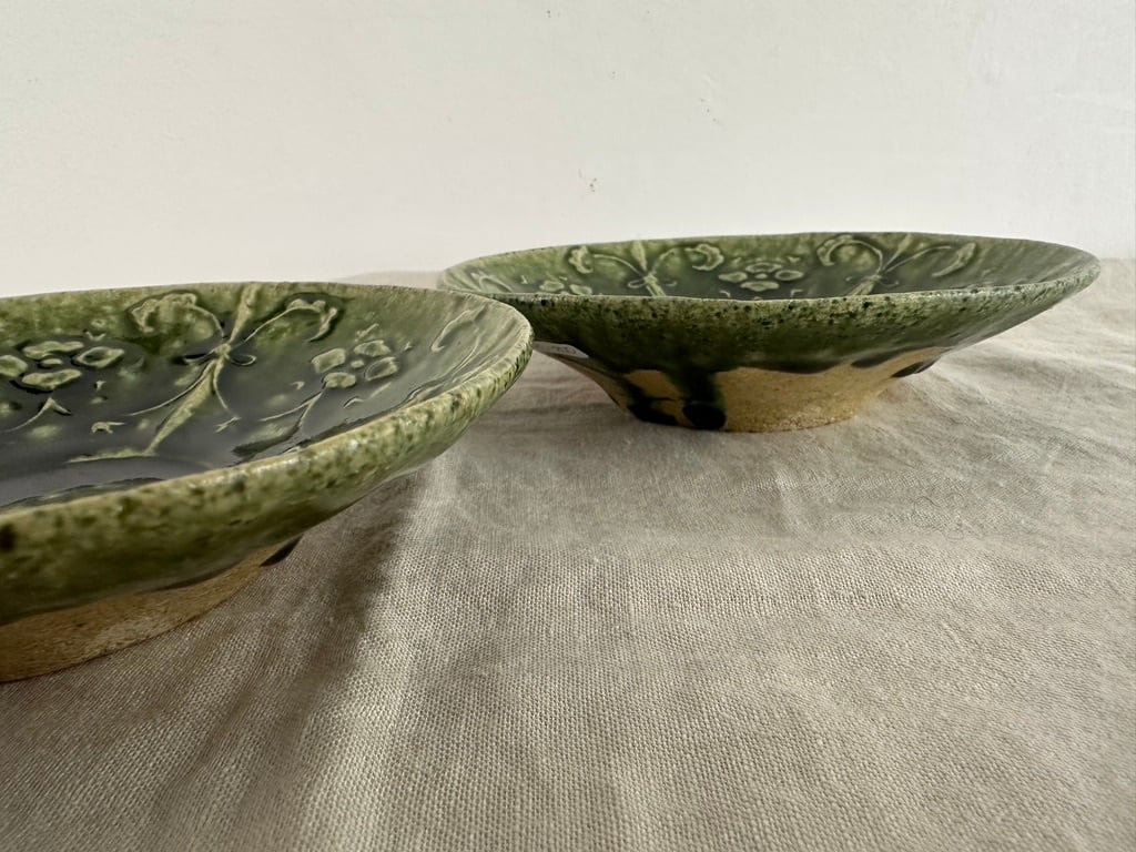落ち着いた織部釉の色と型でつけられている文様が馴染み中心に向かって色が濃くなっているのも味わいがあります