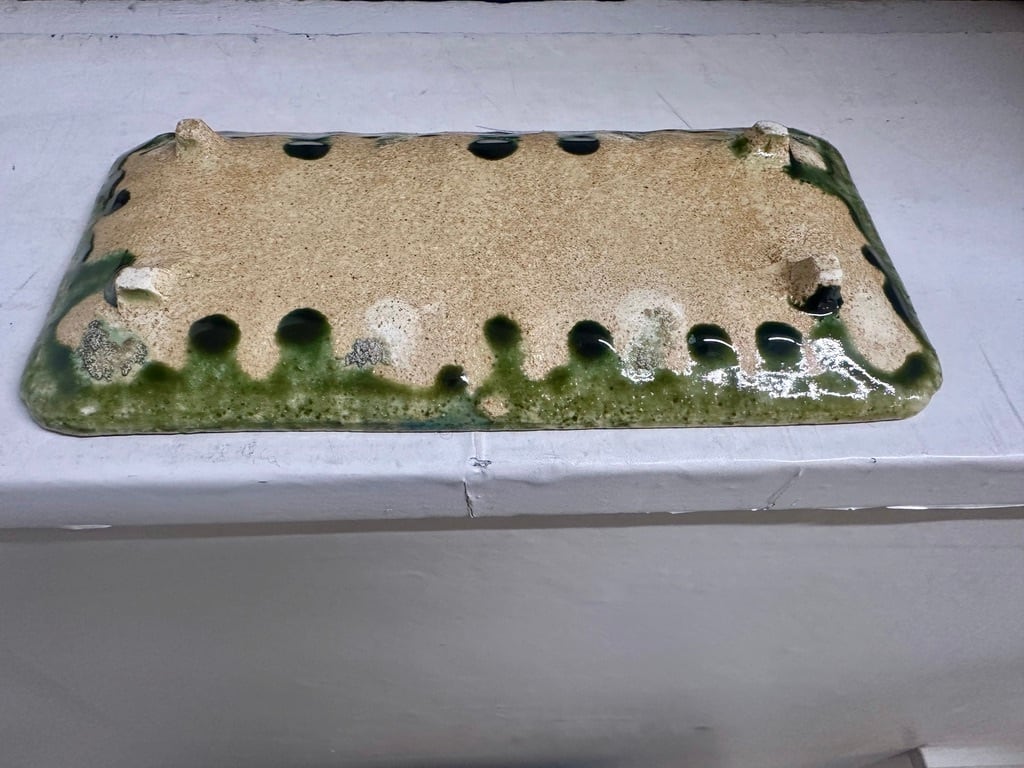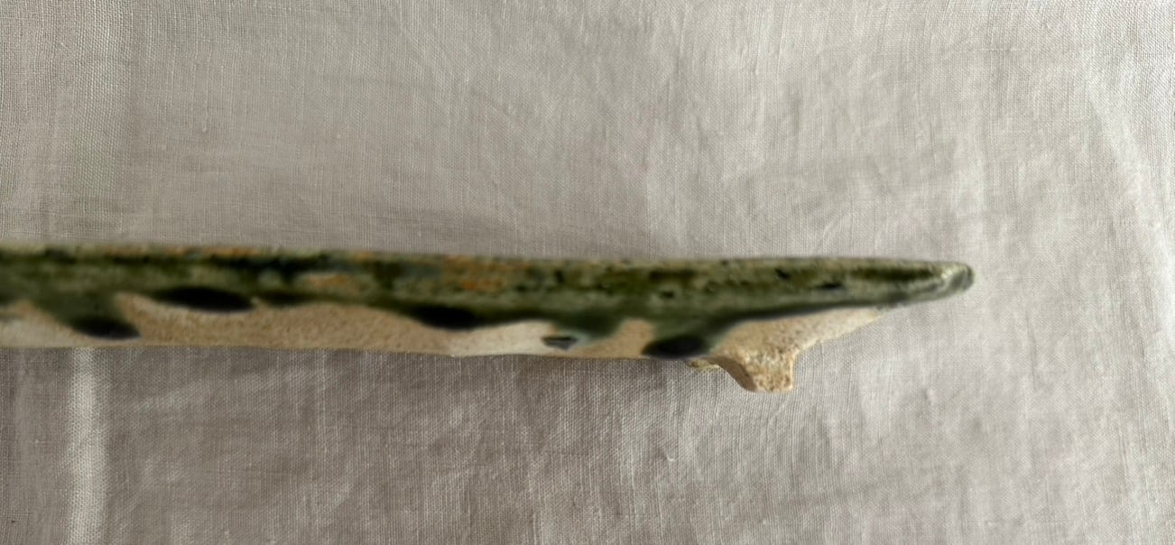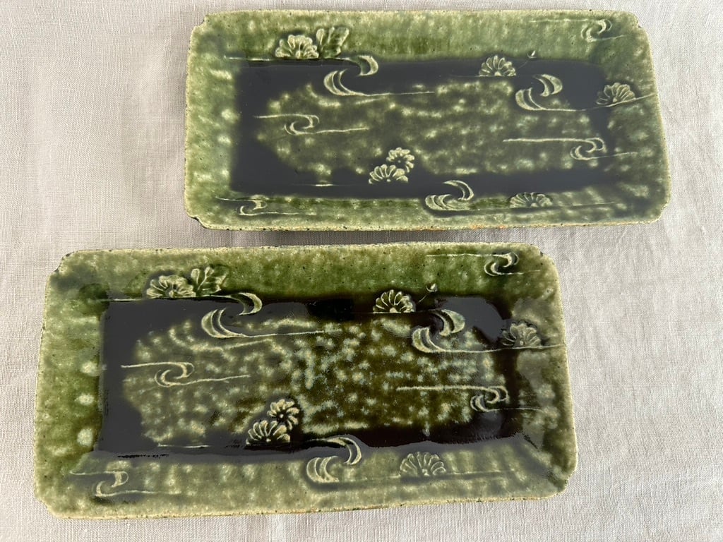 型に彫った文様から作られている長皿は織部釉の緑色が深い色になったところも美しい菊文様になっています。