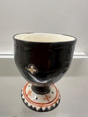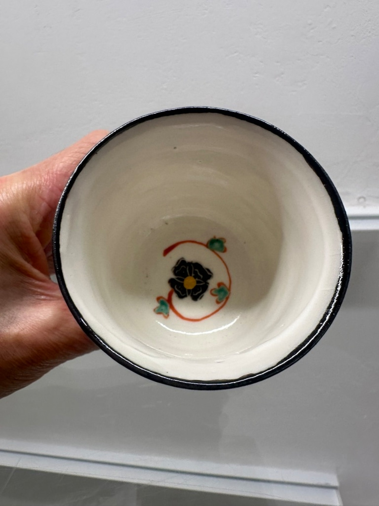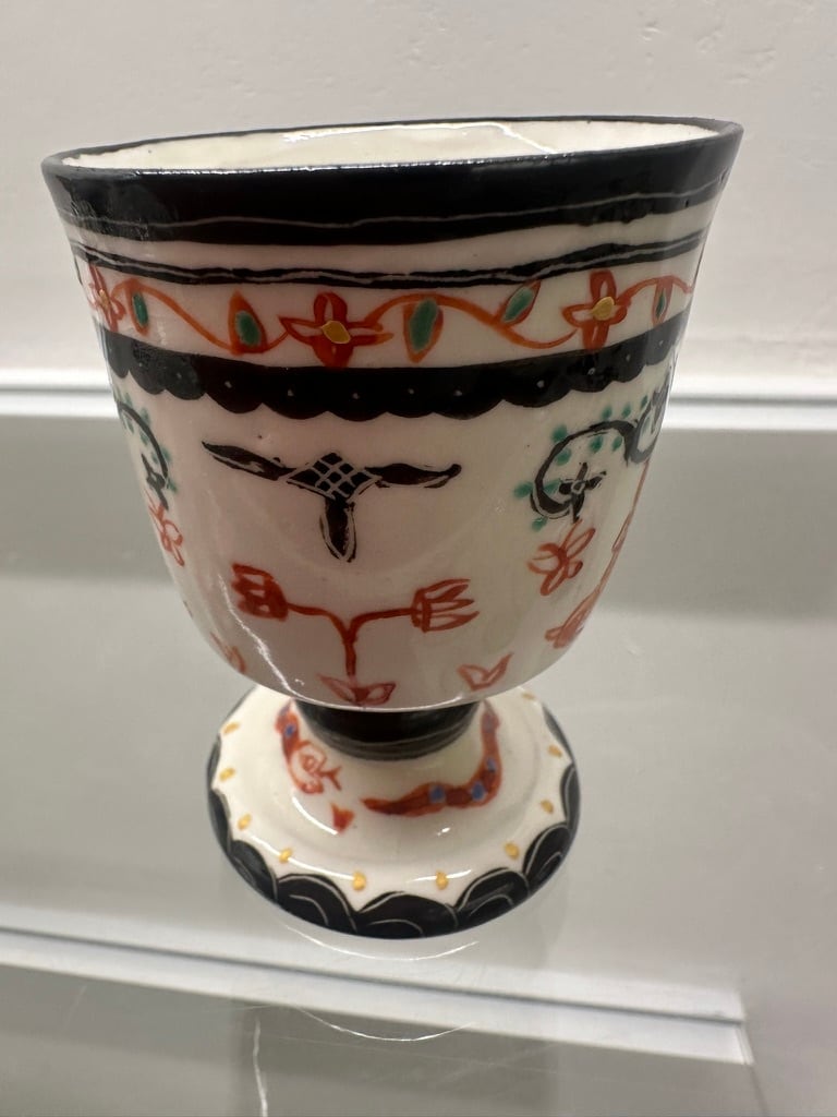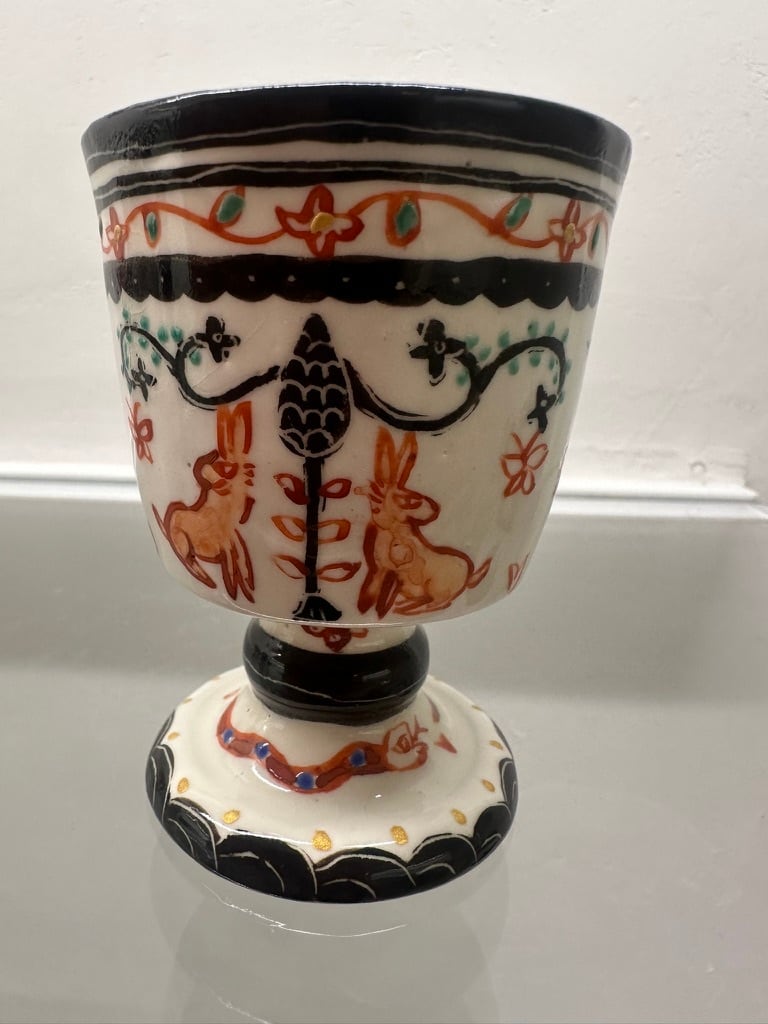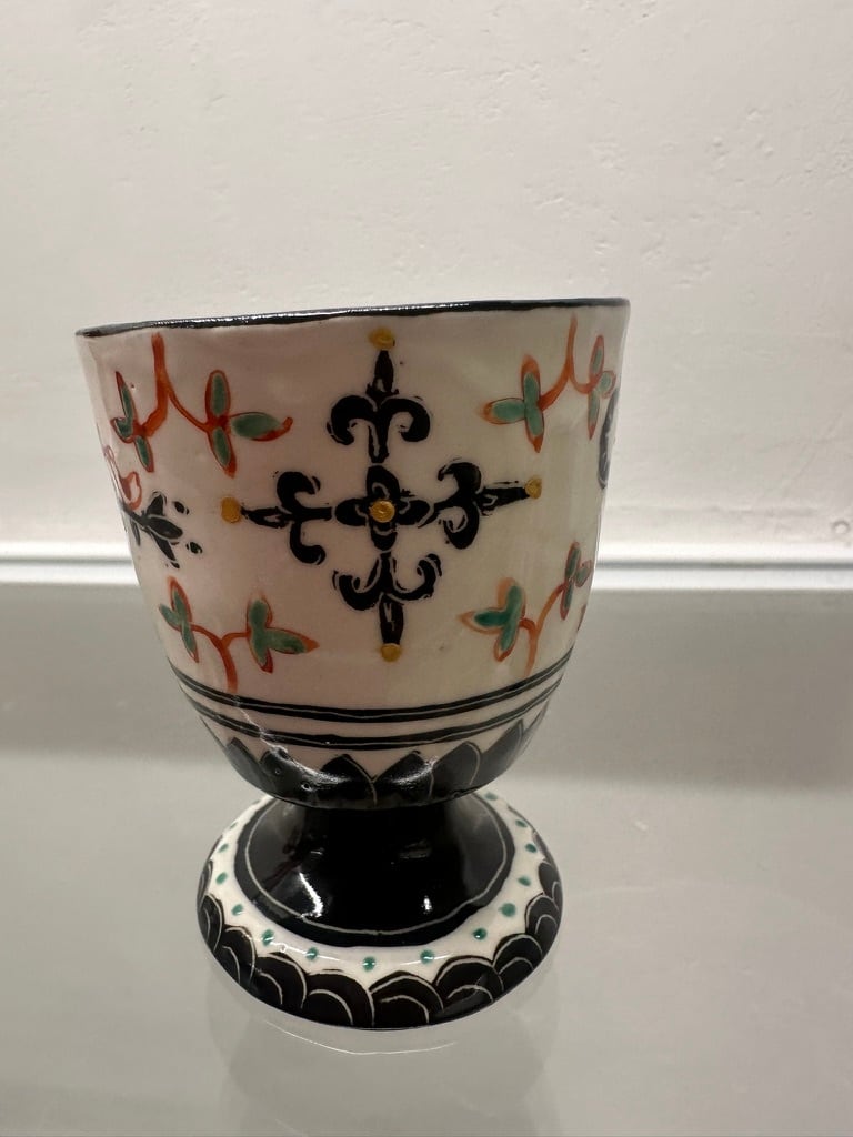 黒と白の掻き落としで文様をつけた上に赤や金、緑の絵具で上絵付けした高台杯です
