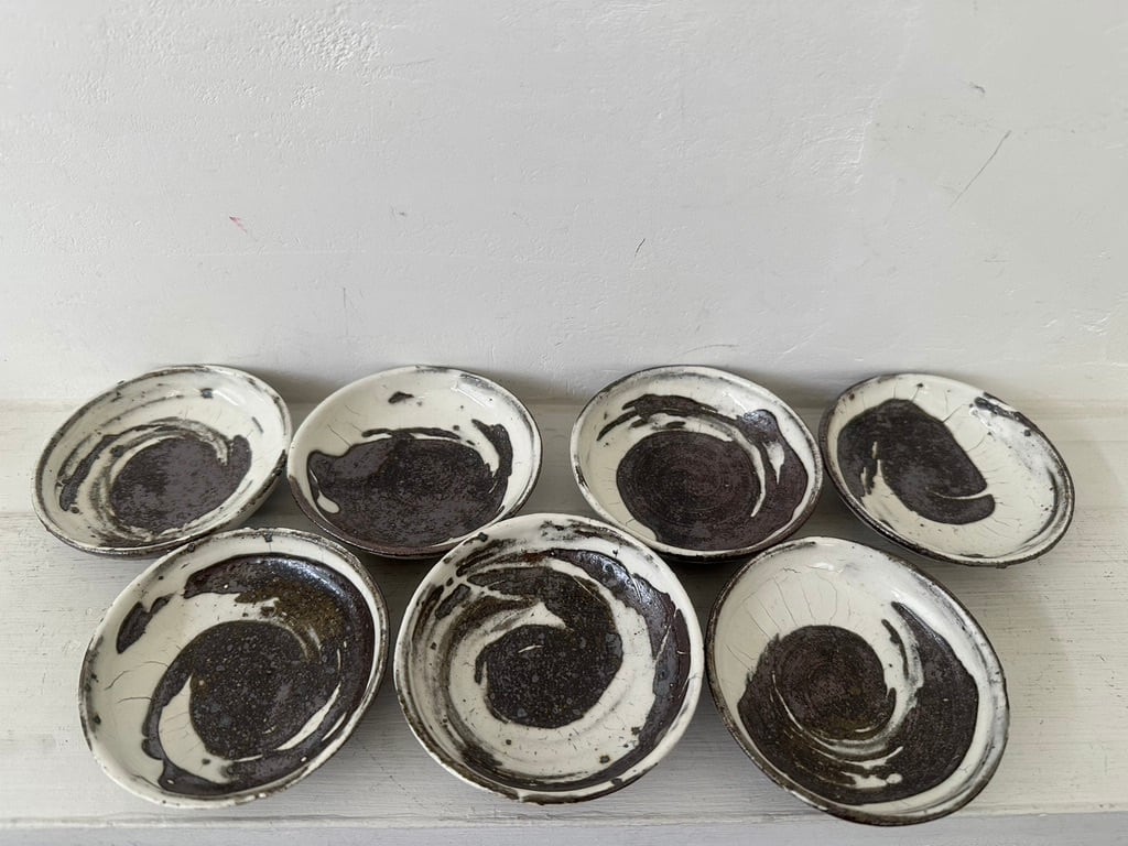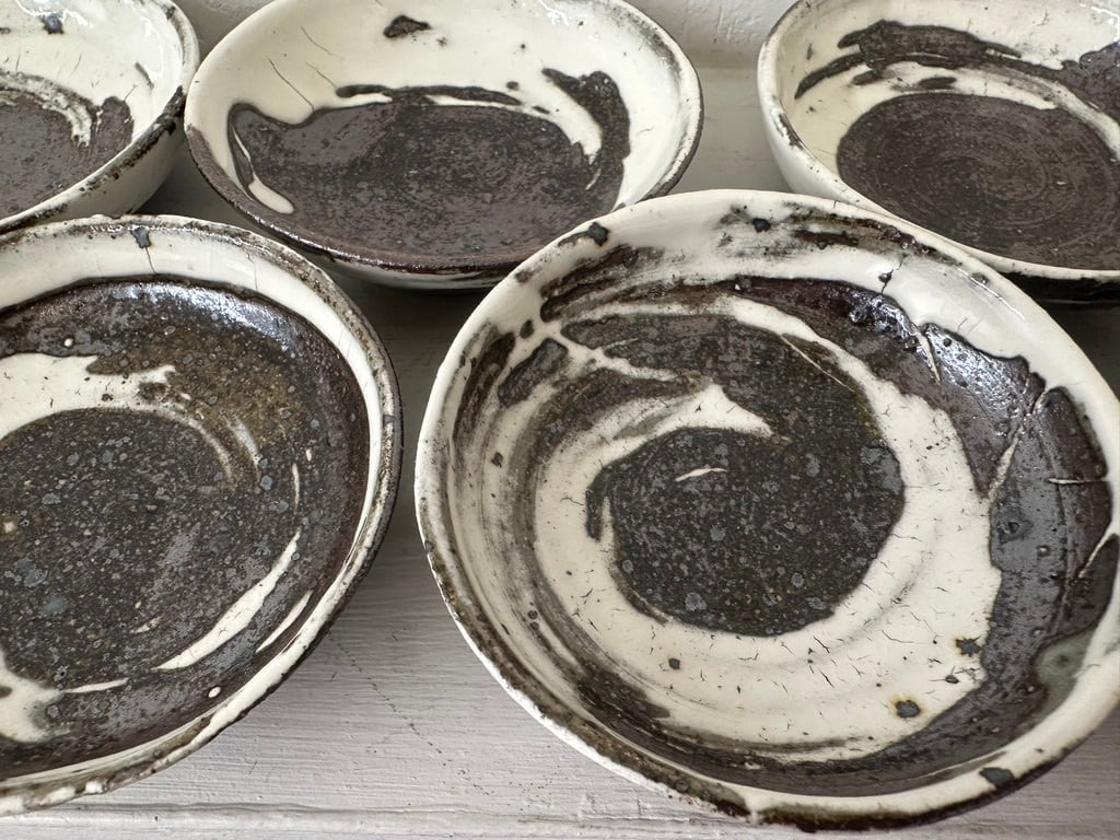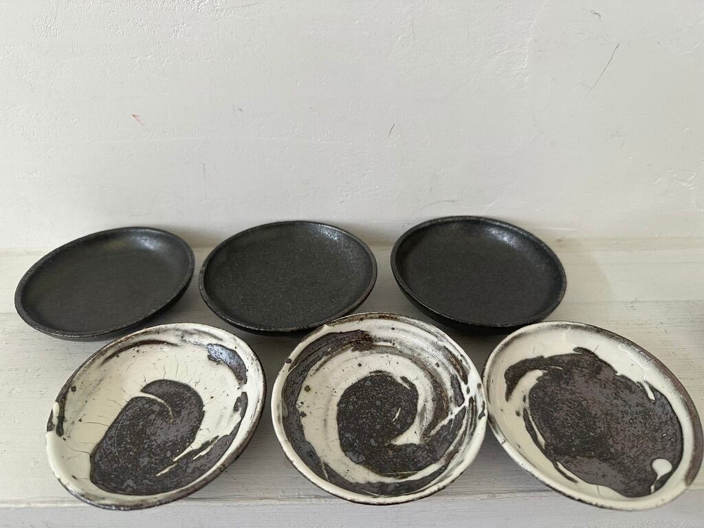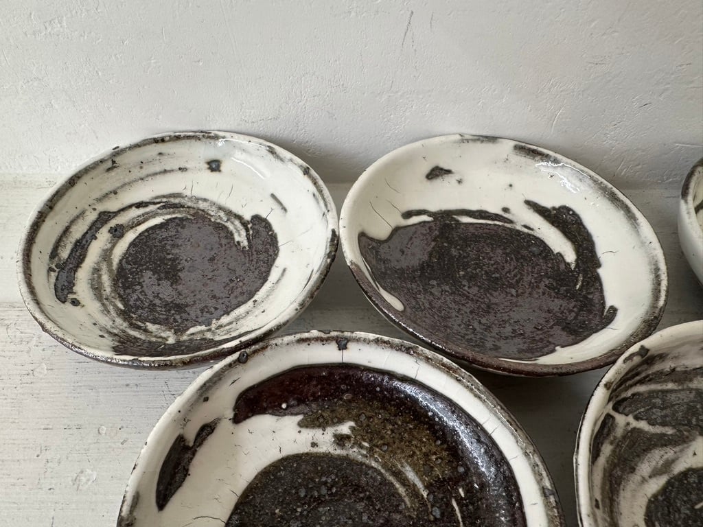 小さいながら一枚ずつ刷毛目模様の勢いがあります。内側、外側どちらにも刷毛の模様を施しています。鉄釉小皿同様にお醤油皿、オリープオイル皿や薬味皿など 小皿を組み合わせていろいろな種類のおつまみをちょっとずつ盛り付けたら楽しそうです