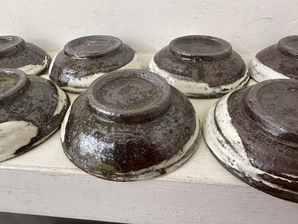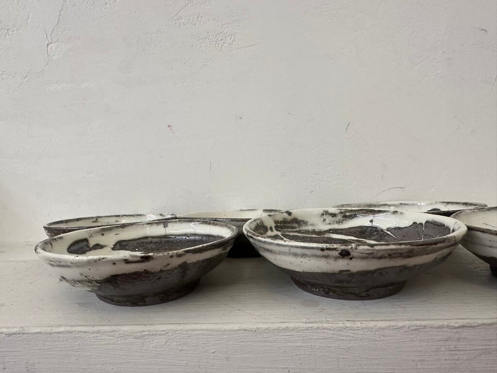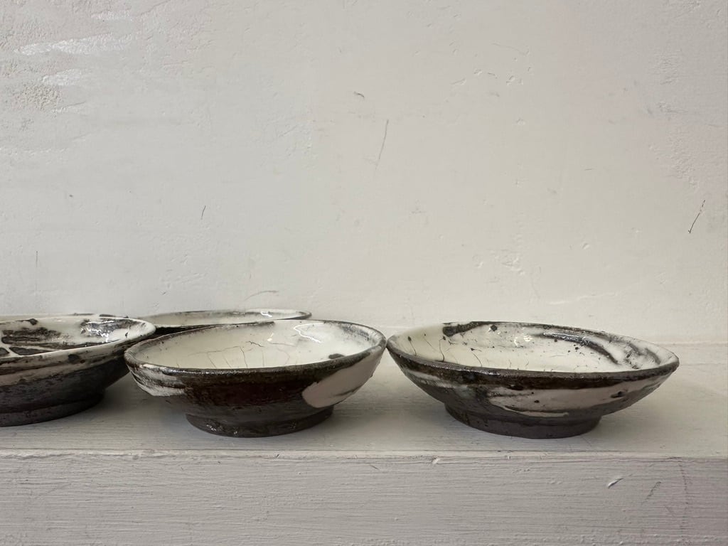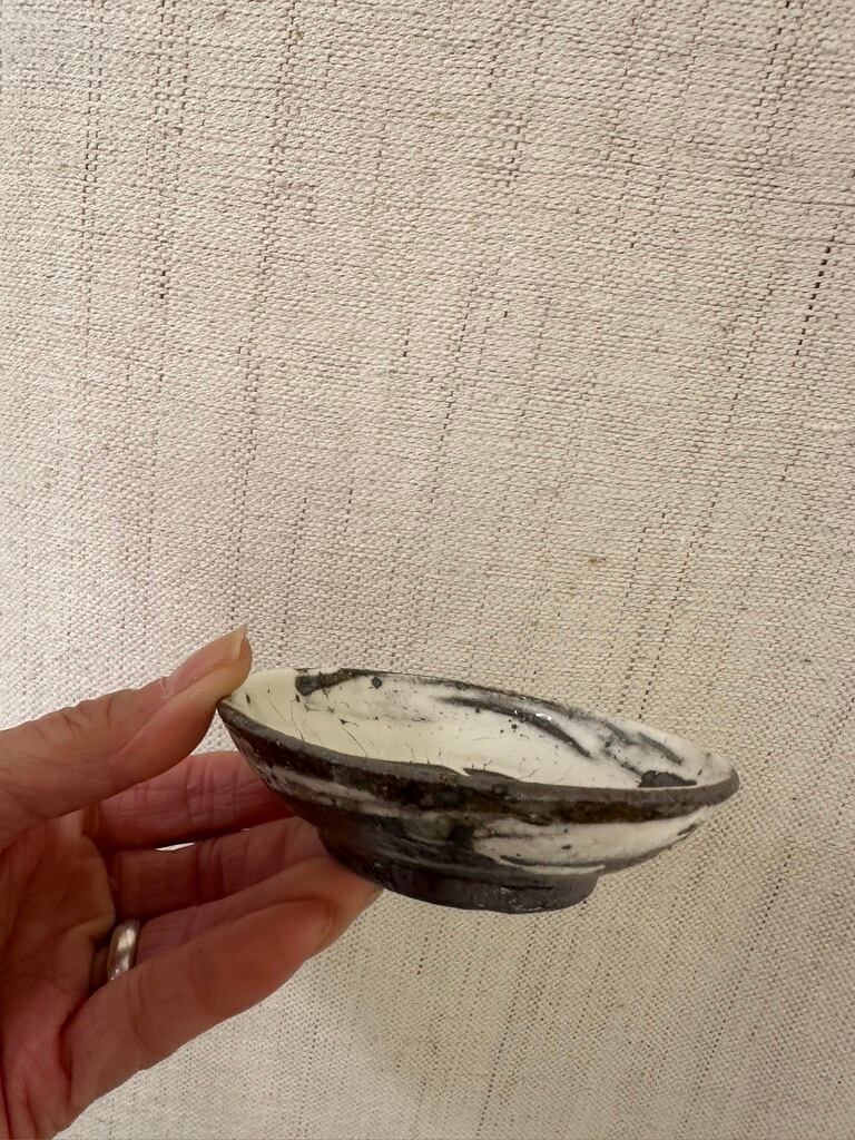 小さいながら一枚ずつ刷毛目模様の勢いがあります。内側、外側どちらにも刷毛の模様を施しています。鉄釉小皿同様にお醤油皿、オリープオイル皿や薬味皿など 小皿を組み合わせていろいろな種類のおつまみをちょっとずつ盛り付けたら楽しそうです