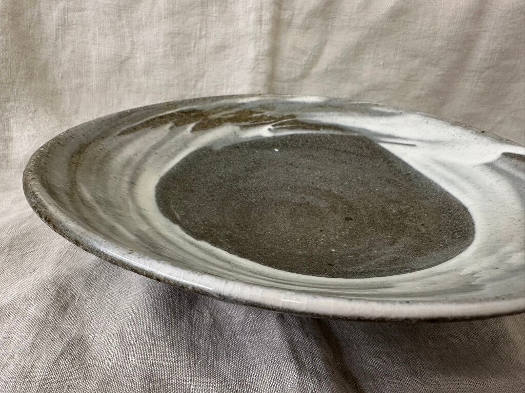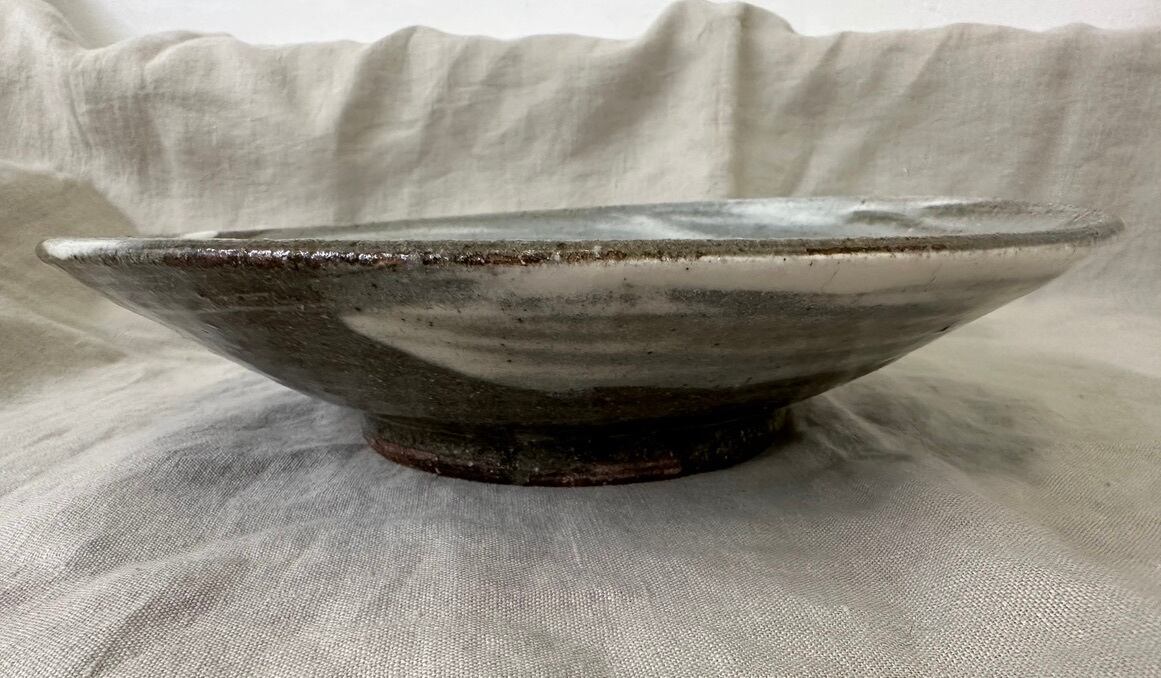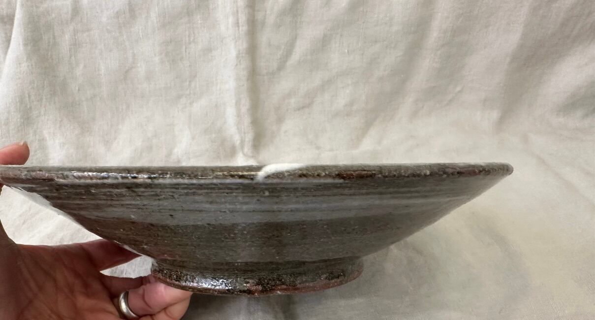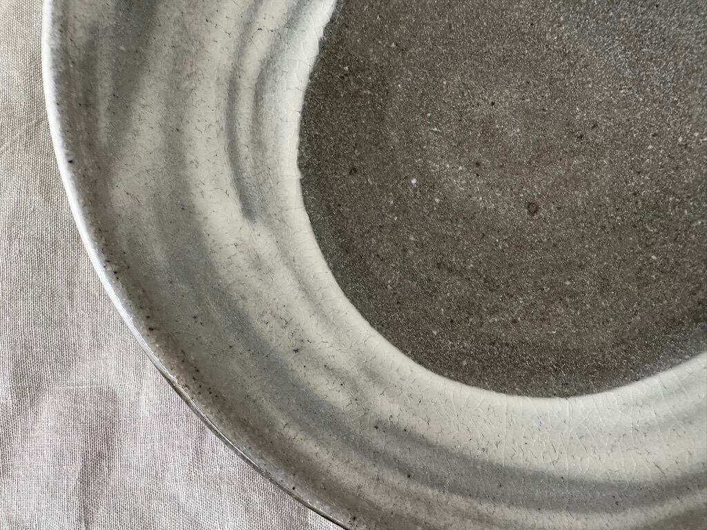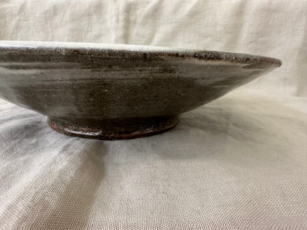 こちらの鉢は鉄分の多い黒い土に刷毛目を施しています。浅い大ぶりな鉢になります。真上からも横から眺めてもそれぞれに刷毛目の模様が面白く飽きない一点ものの鉢です