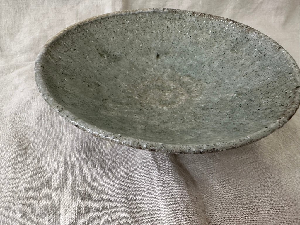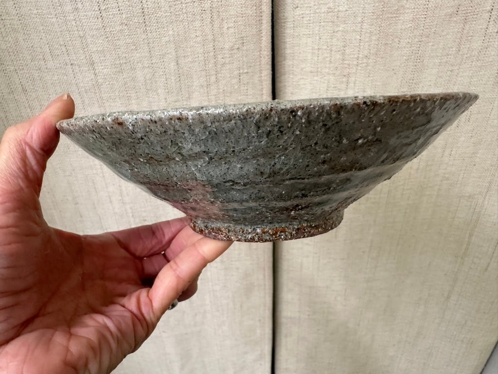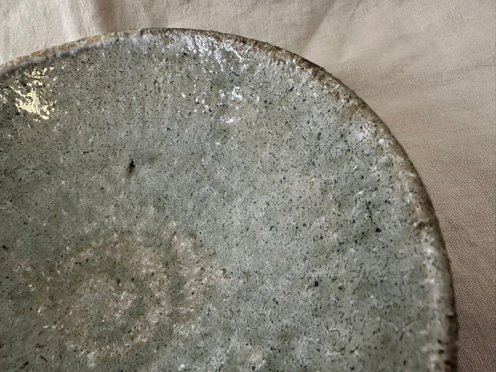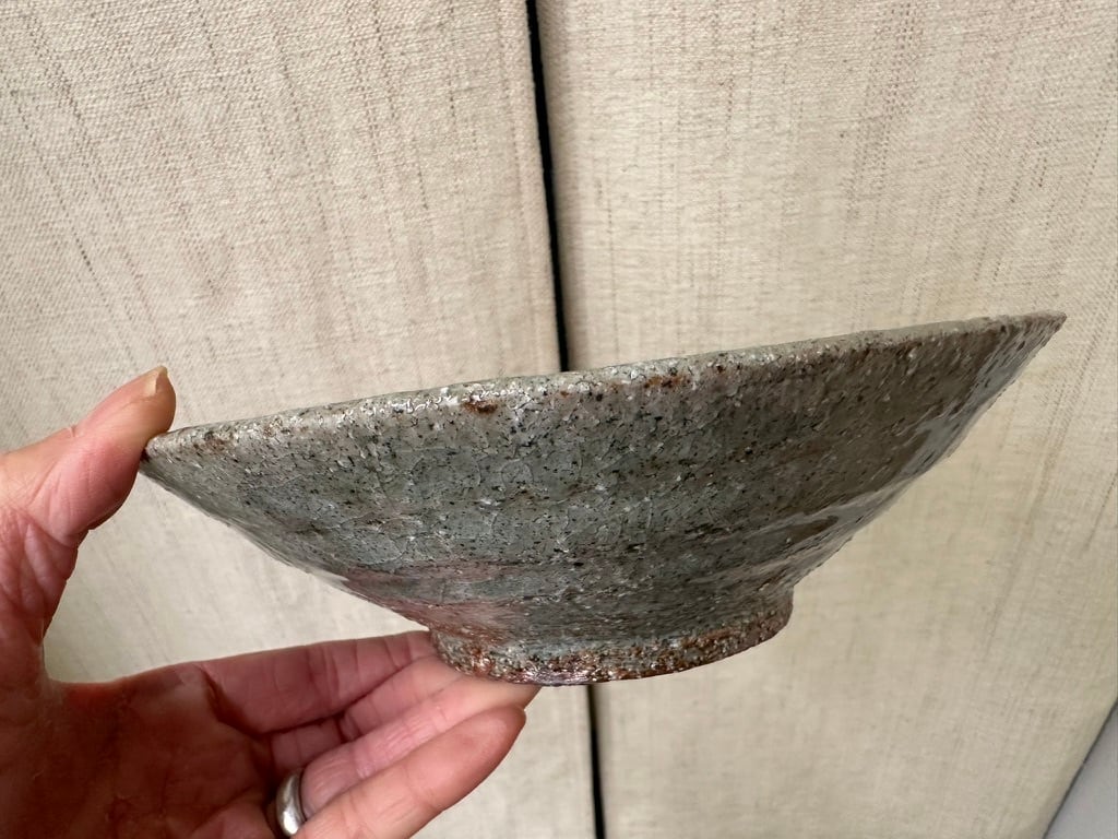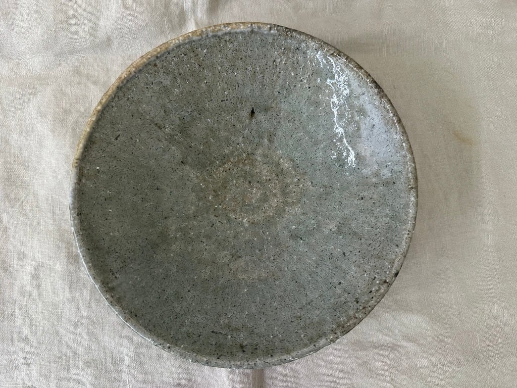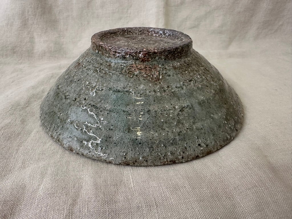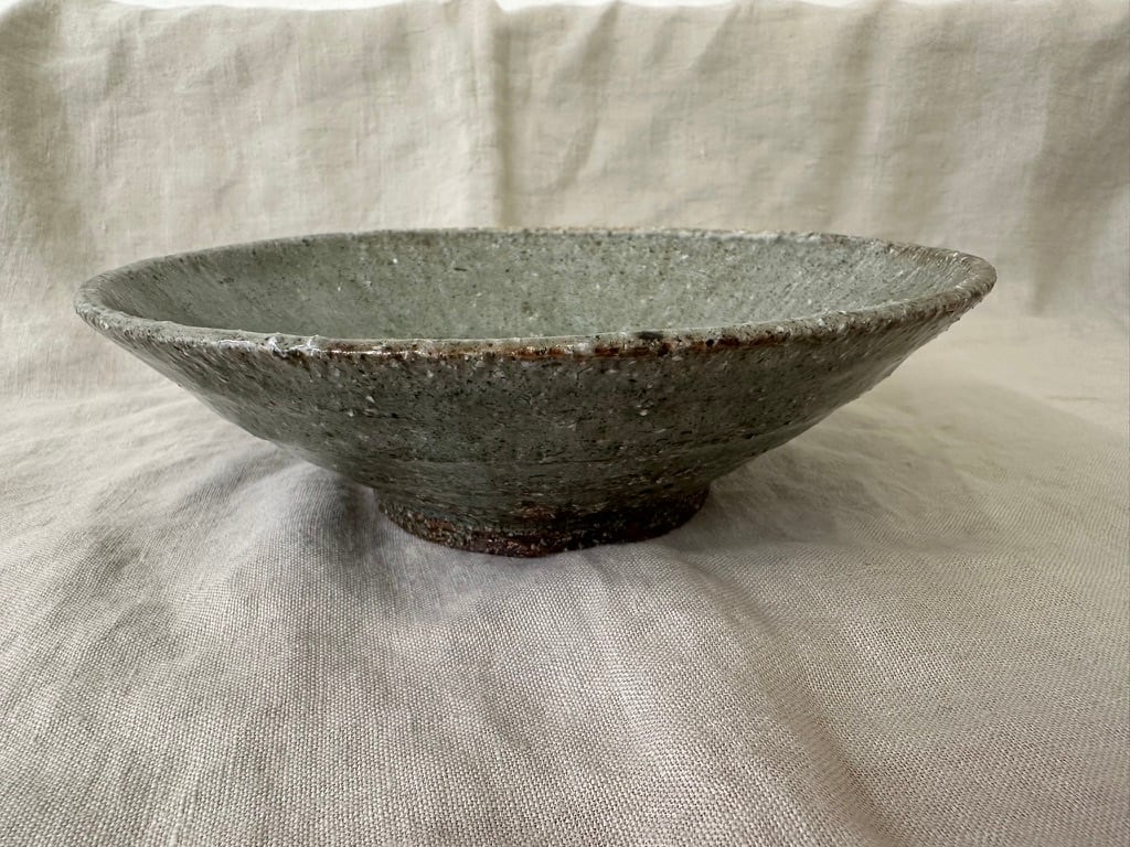 八百津町に移ってから出会った土を使った小ぶりな鉢です。粗いつちに灰の釉薬を掛け、薪窯で焼きました。外側はろくろ目を残しています。一点ものですが、美しい表情の小ぶりな鉢は食卓で活躍しそうです。ひじきや切り干し大根の煮物などにも