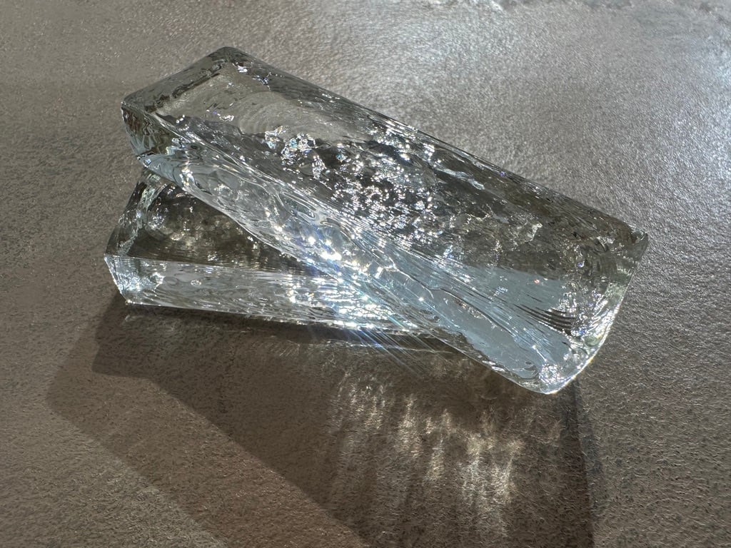 無色透明の溶けたガラスに茶色のガラスカレットを加えて一緒に溶かすことで柔らかい琥珀色のガラスを作ります。吹きガラスの器、この箸置きのように型に吹き込んで成形する仕事もされています。型に当たった面に揺らぎができてまるで水面のような表情になります