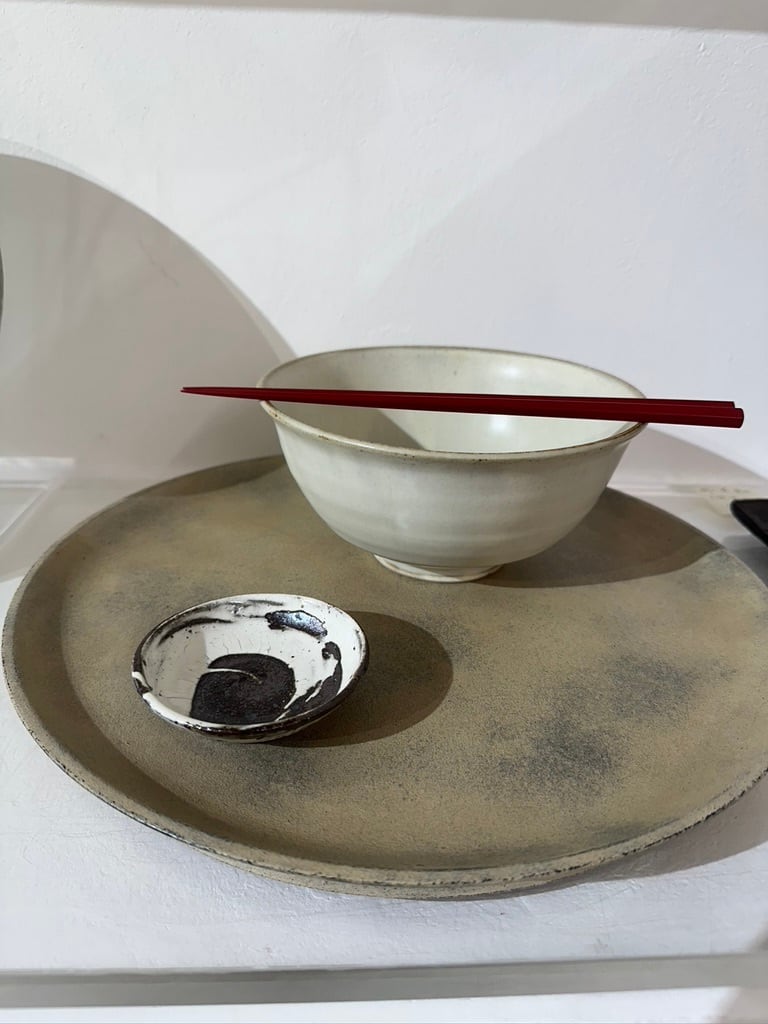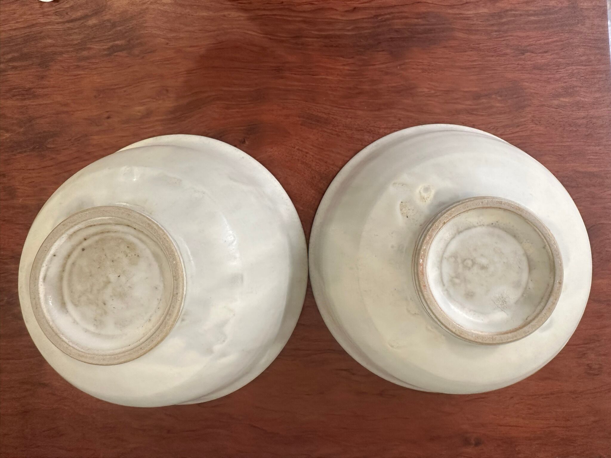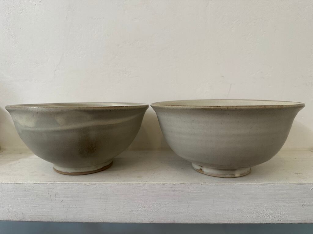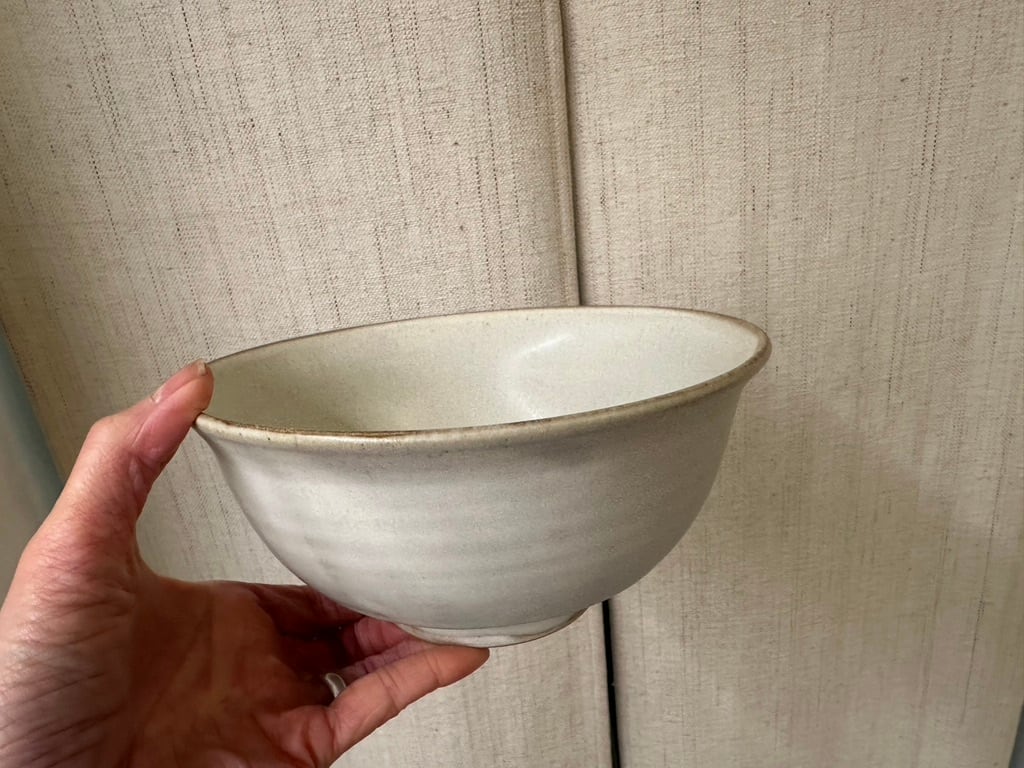 粉引どんぶり りんごの木を燃やして作った灰釉を掛けることで釉薬が流れてたまった部分(内側の底)が淡いあわい黄色に仕上がっているのが特徴です。全体の柔らかな白がより温かみを感じるどんぶりです。最後の写真はりんご釉指描どんぶりと並べました。サイズや形状はほぼ同じになります (左が指描どんぶりです)