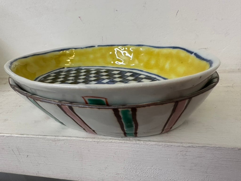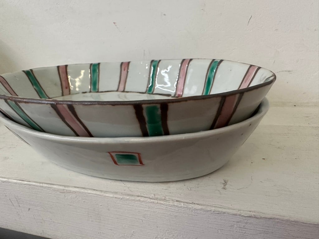 黄巻格子文楕円深皿・桃緑トクサ楕円深皿 【中尾万作】
