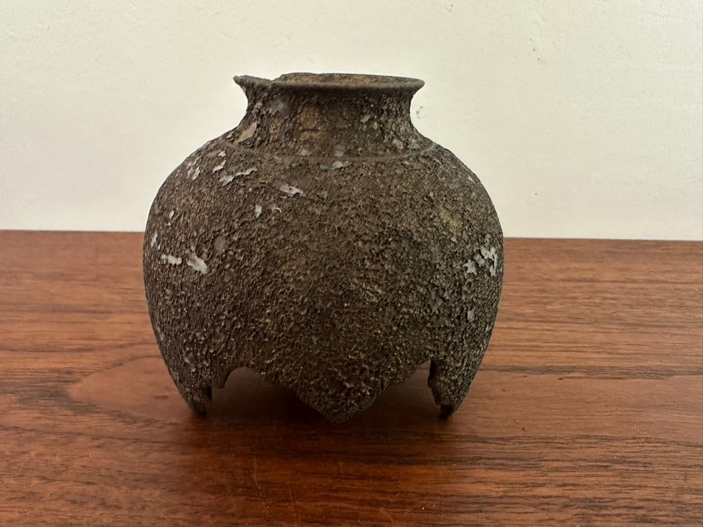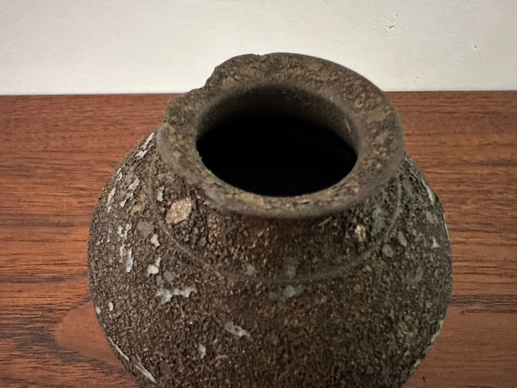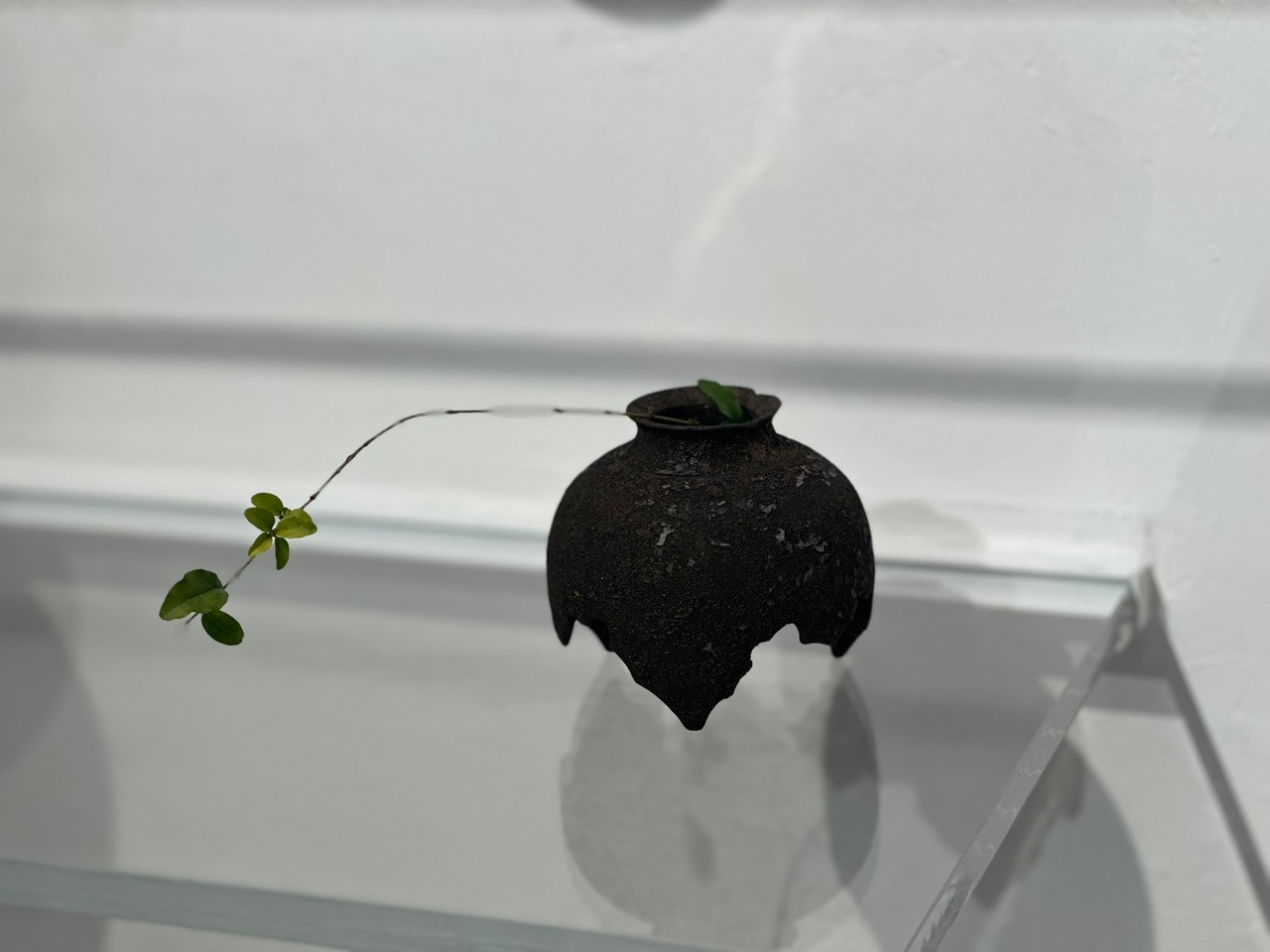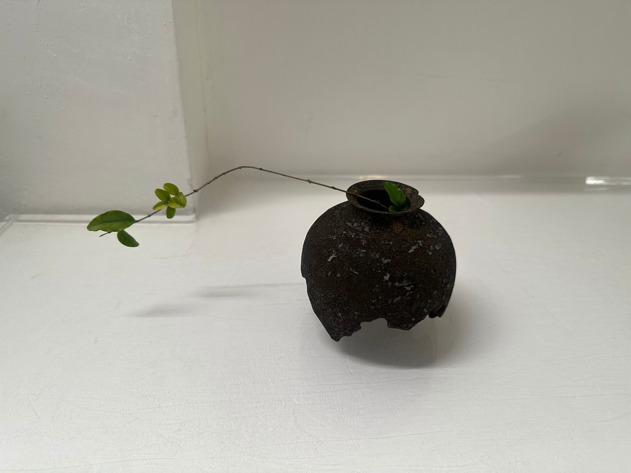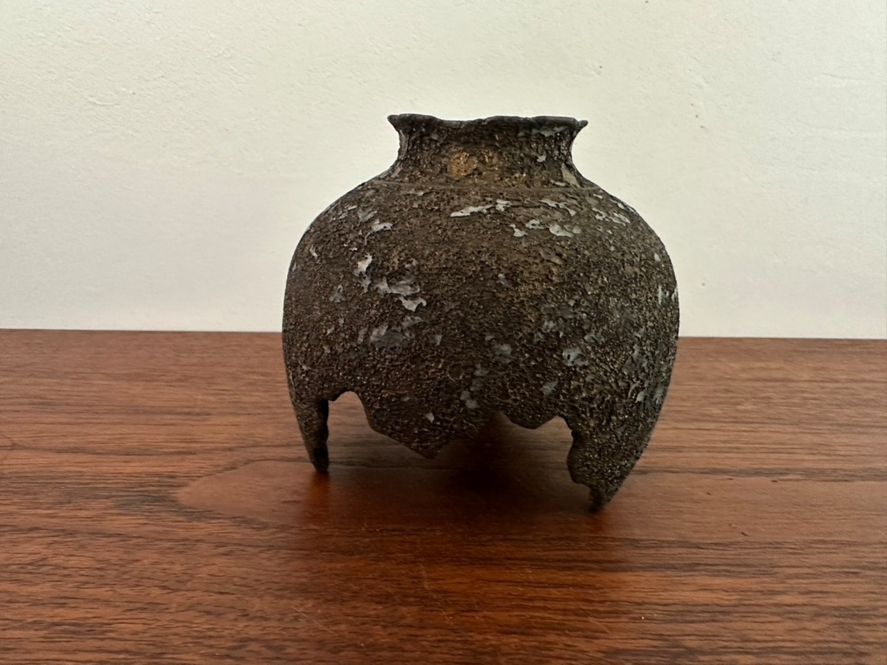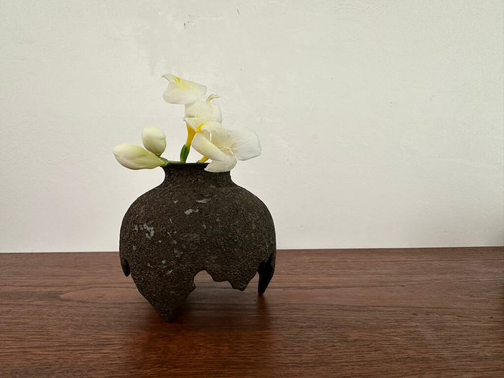 金属が朽ちていく過程を形に留めている時間を止めてしまっような花器でありオブジェでもあります。肌のテクスチャーも金属や石が入っているように見え不思議な佇まいです