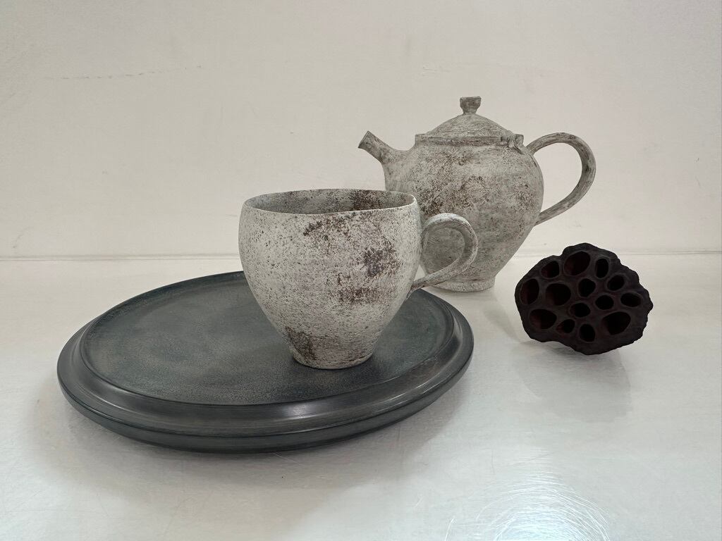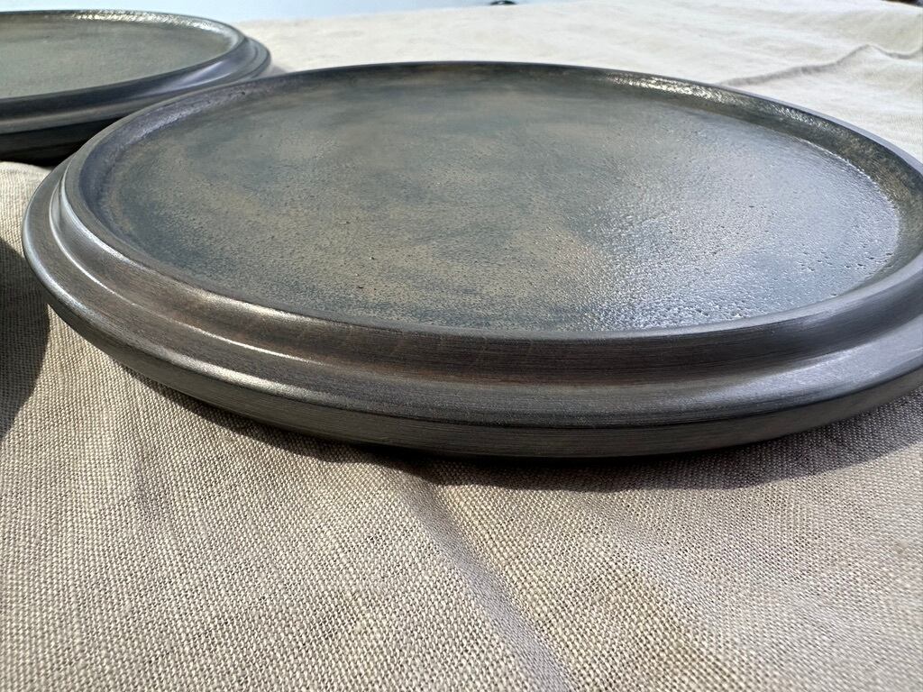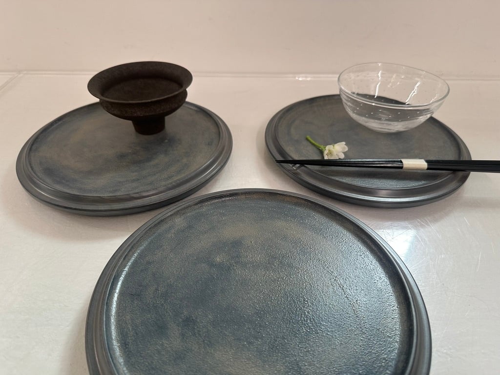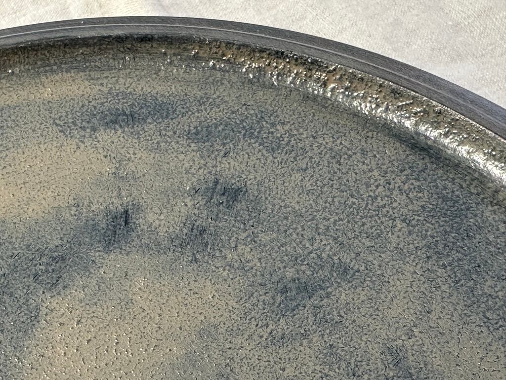 陶器のような見た目ですが、非常に軽いホウノキを使っているため、持ち上げると軽さに驚きます。蒔地仕上げのため、表面は硬く傷が目立ちにくく、水や油もしっかり弾くので、どんなお料理でもあまり気にせずに使えますし、トレーとしてもどうぞ使ってみてください。表面がざらっとしているのが特徴です。白漆仕上げで全体がグレイッシュな色味はカジュアルな食卓にも似合います