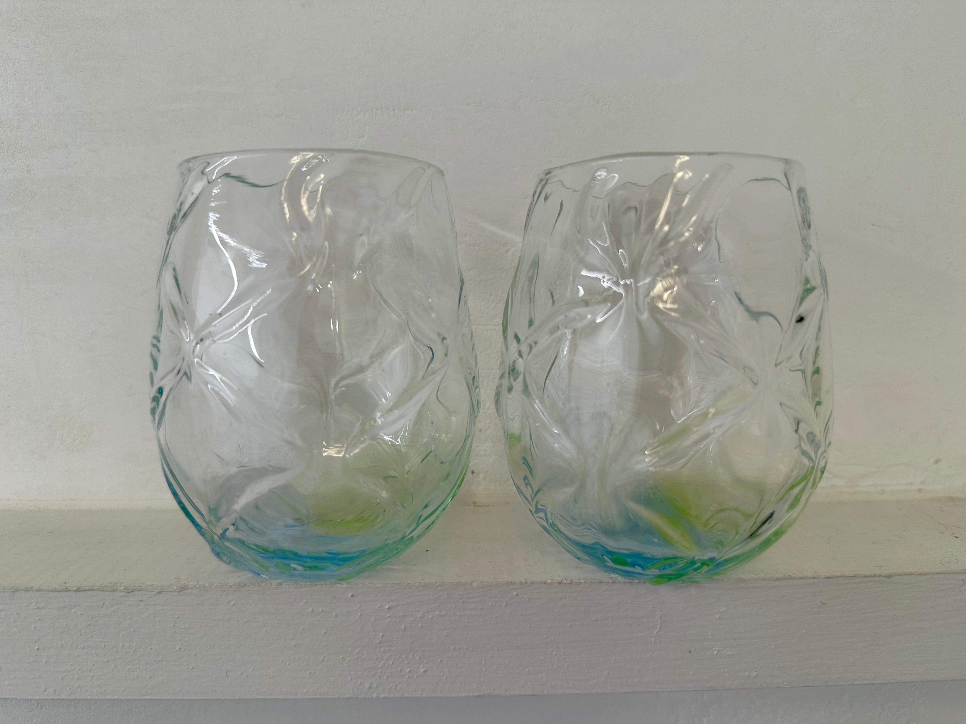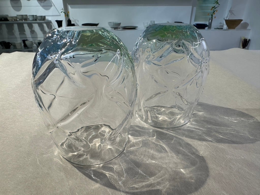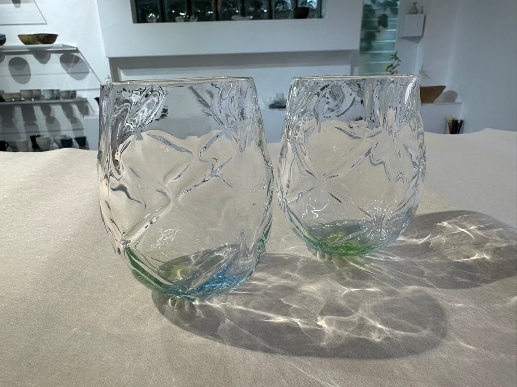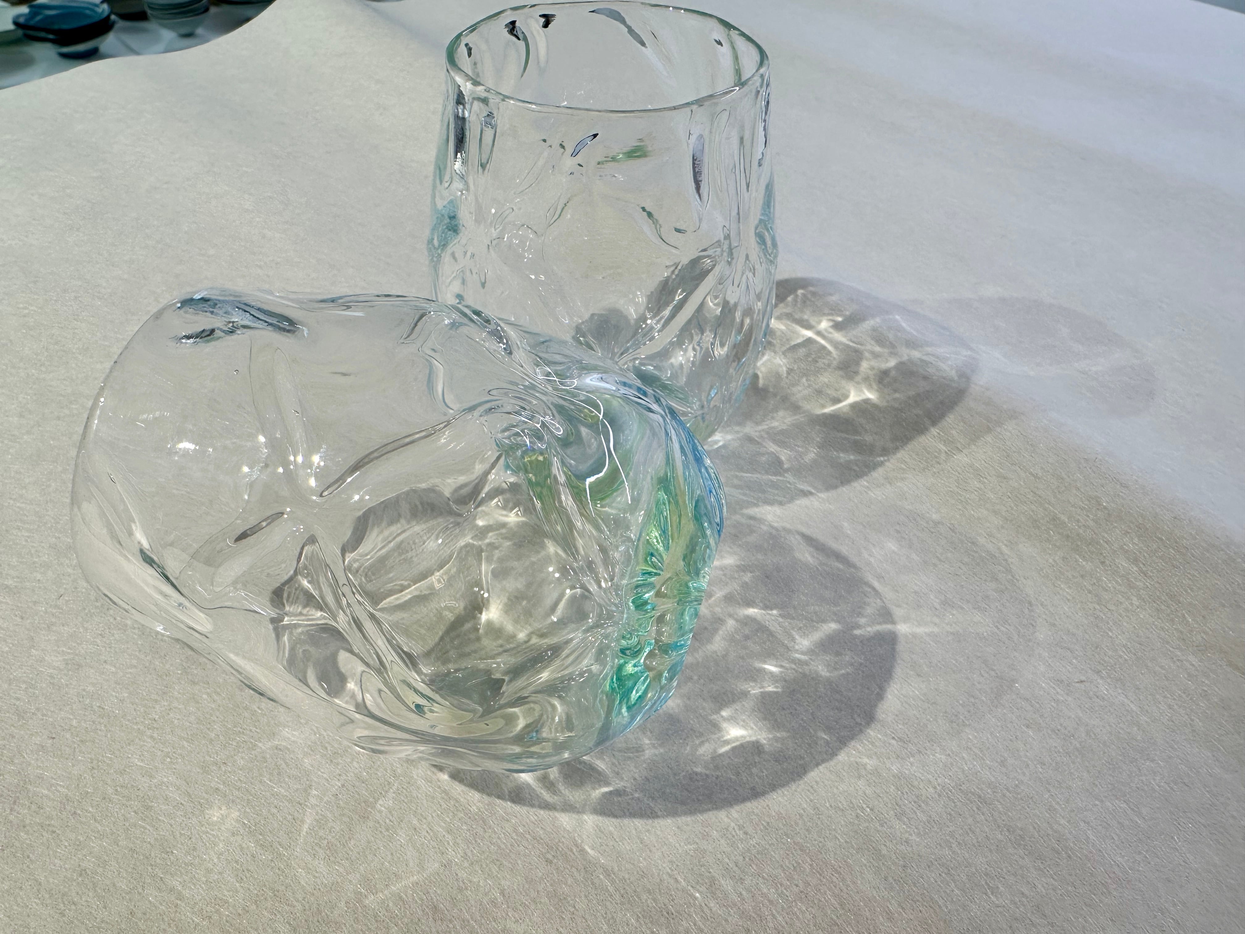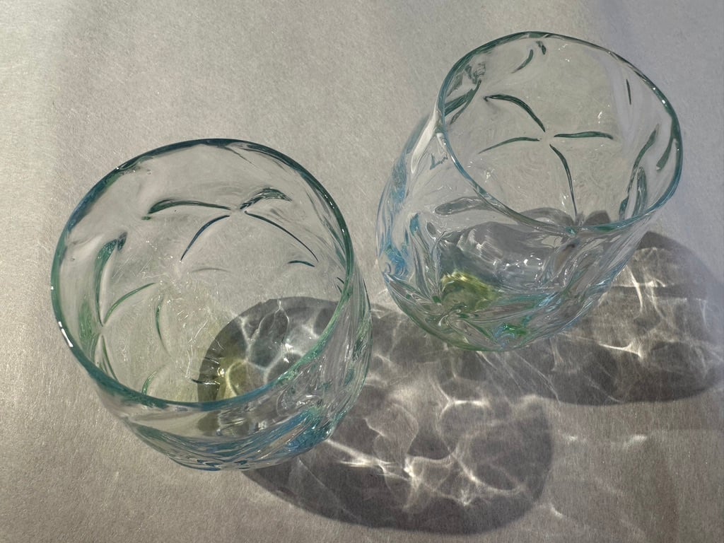 knit-kaleidoscope- は編んだような模様と上から覗きこむと万華鏡のような模様が広がる作品です。底の部分に入れられた淡いブルーと黄色がガラスに溶け込んで美しい影も見せてくれます。2年ほど前に自宅用に求めたグラスは水、炭酸水、ビール、ワインなど 光で揺らめく色も楽しみながら愛用しています。