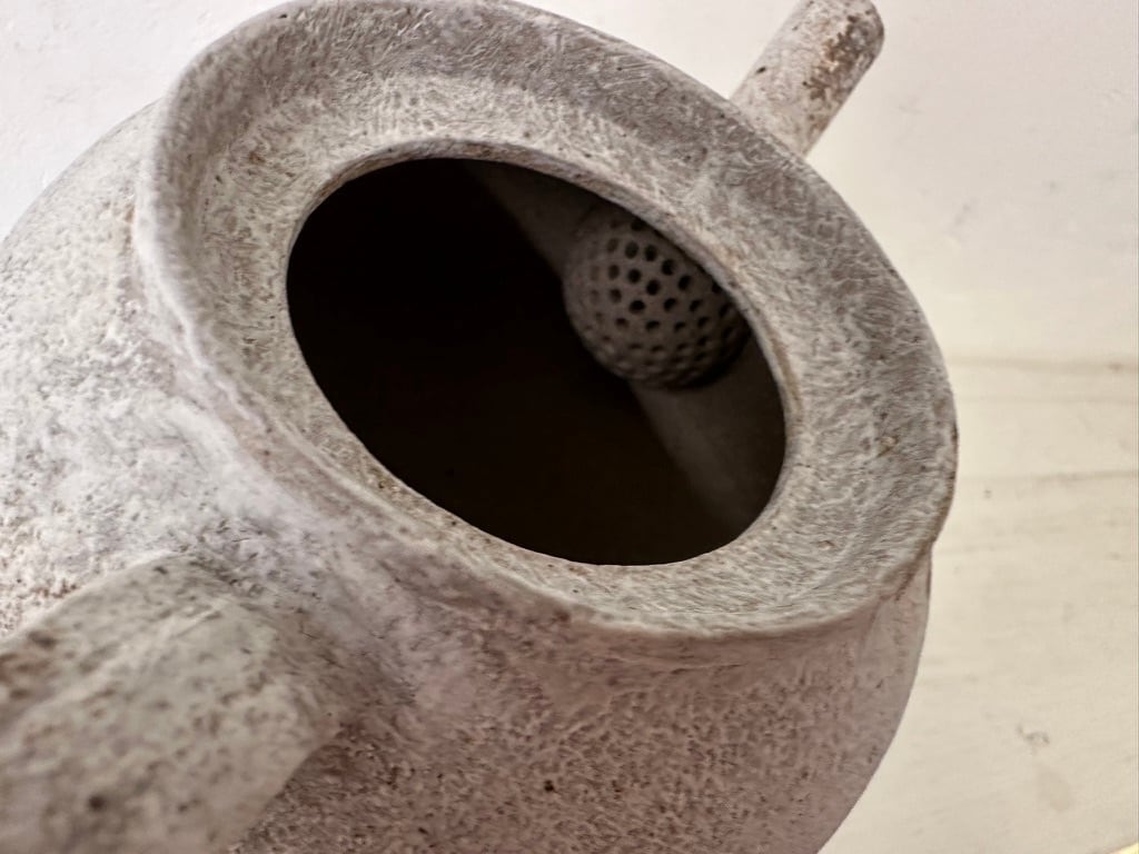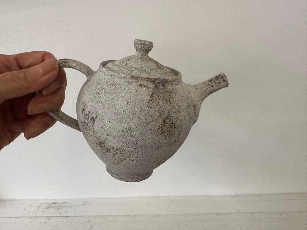 安藤さんは岡山県備前陶芸センターで備前焼を学び橋本和哉に師事しました。2008年に独立して鳴滝窯を築窯しました。備前焼を継承する一方、安藤騎虎(ando kiko)の名前で独自の作品制作もされています。備前白土に出会ったことで伝統に拘らず、現代の焼き〆の表現を模索されています。白マットのポットは備前の原土探しで出会った白土を使った粉引焼き〆になります。化粧土に別の備前土でアクセントを施しています。ざらっとした質感に見えますが、触れるとすべすべと心地よい肌ざわり、軽やかなポットです