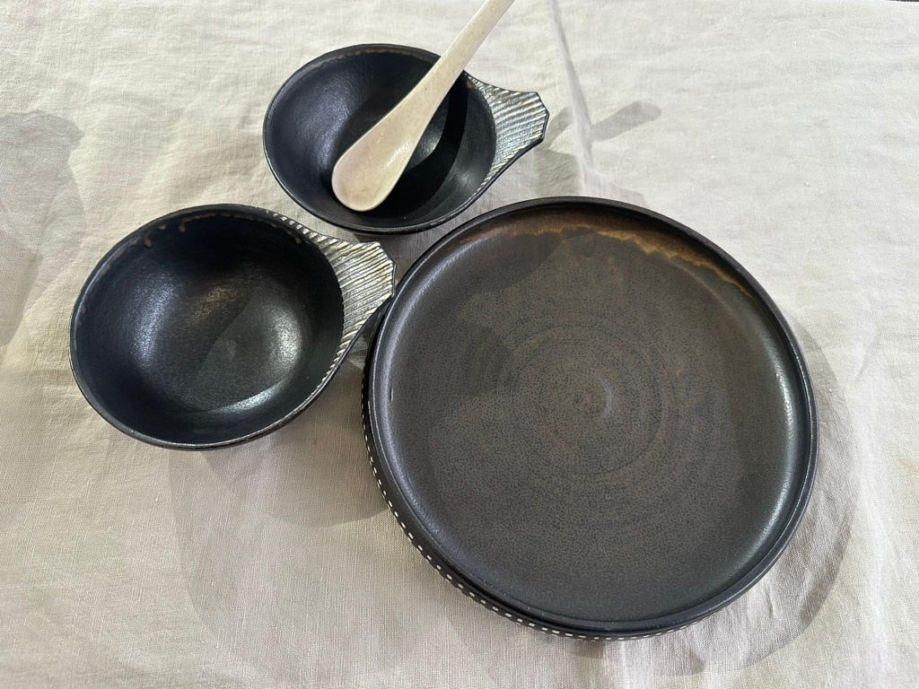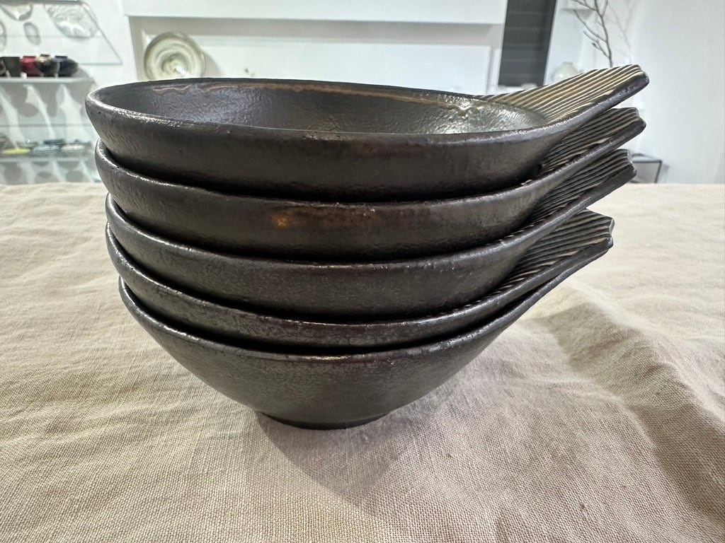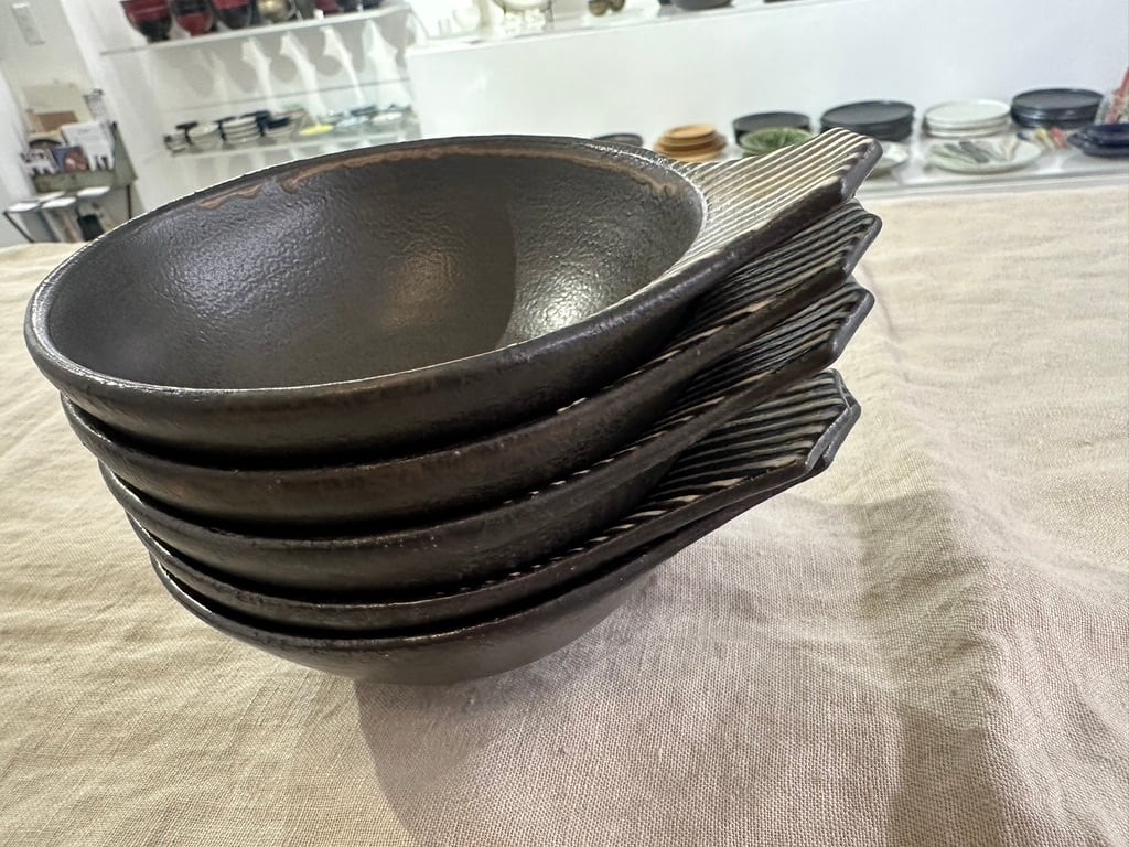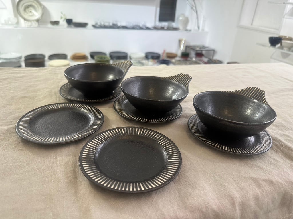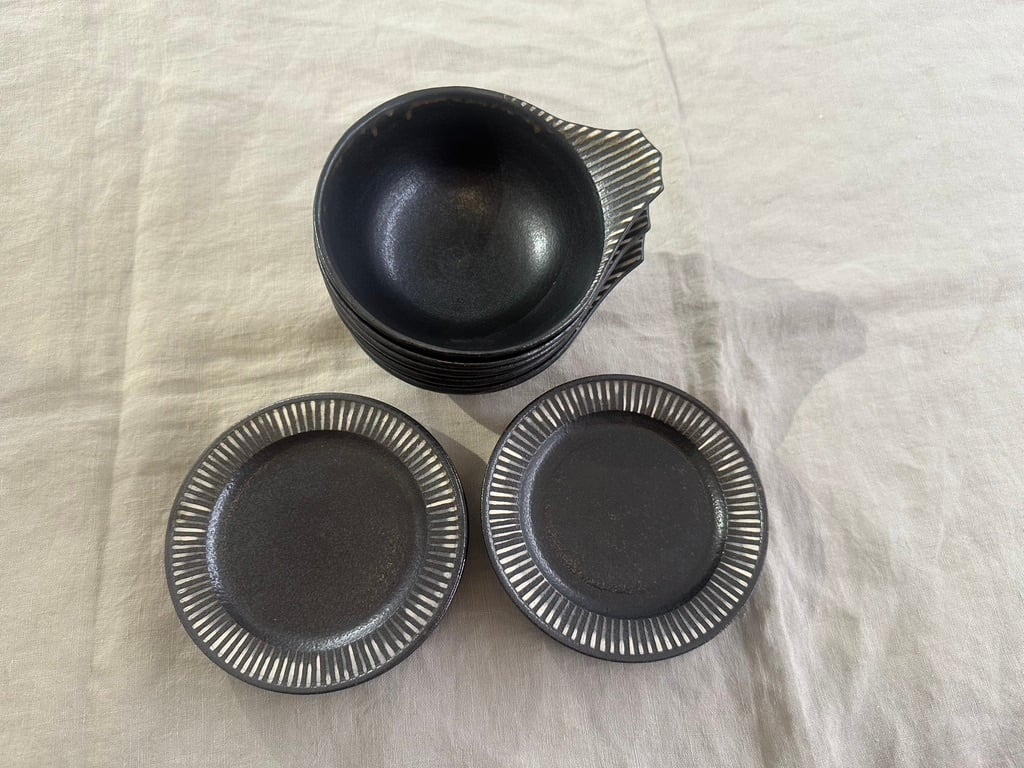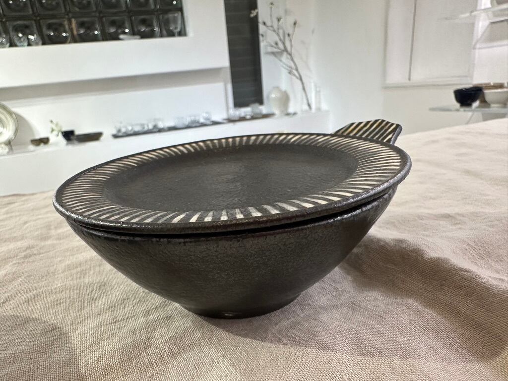 トクサ模様の白と黒のラインの持ち手がアクセント。内側も外側も全てに黒い釉薬がかけられ、流れた表情が一枚ずつ異なります。軽く重なりもきれいです