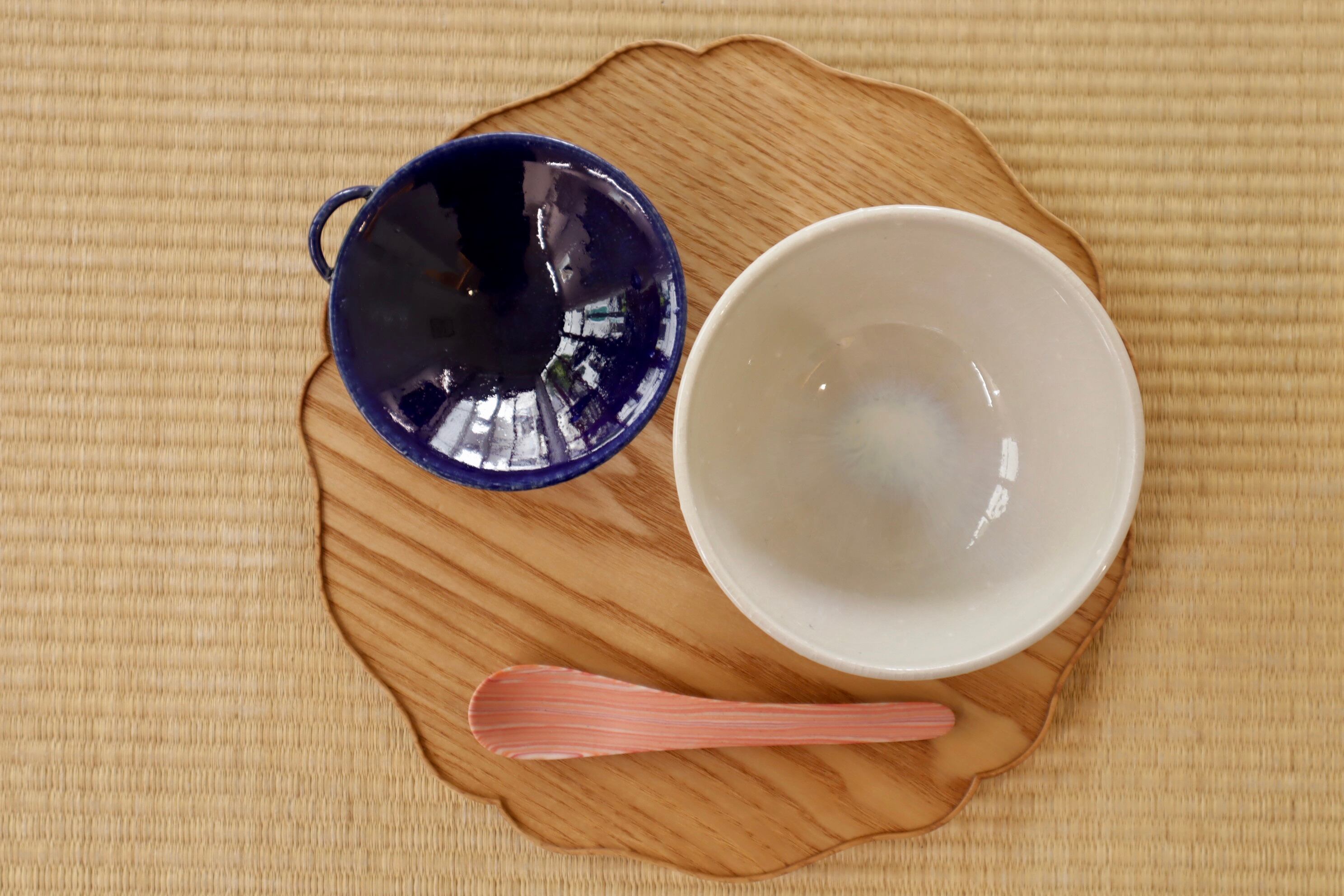 定番で作っている、瑠璃色と柞灰をかけた白いボウルの2種類です