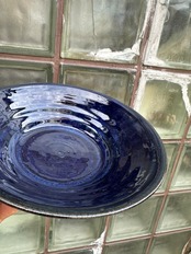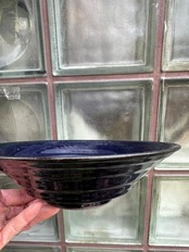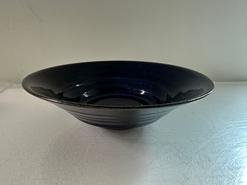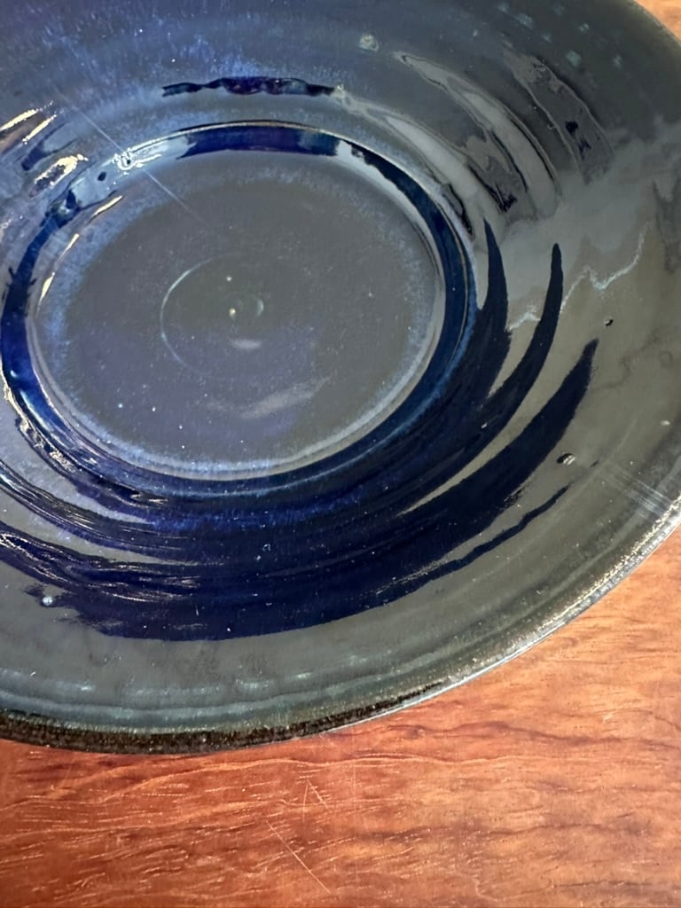 うつわを作り続けられて30年以上、お料理もお得意な臼田さんならではの使い勝手の良さそうなたっぷりとおおらかな形をしています。珍しい紺色の鉢になります。見込みの際の釉薬が結晶のように仕上がっているのが美しいです。見込みから外側に広がったデザインがスタイリッシュで洋食器と組み合わせても似合いそうです