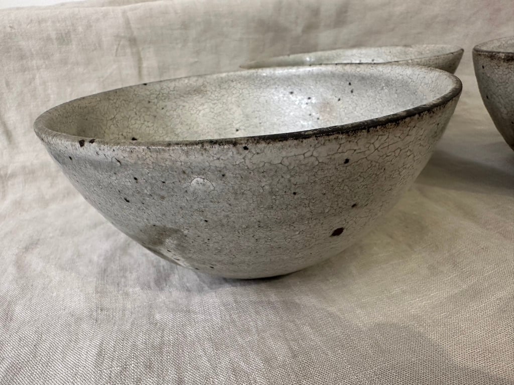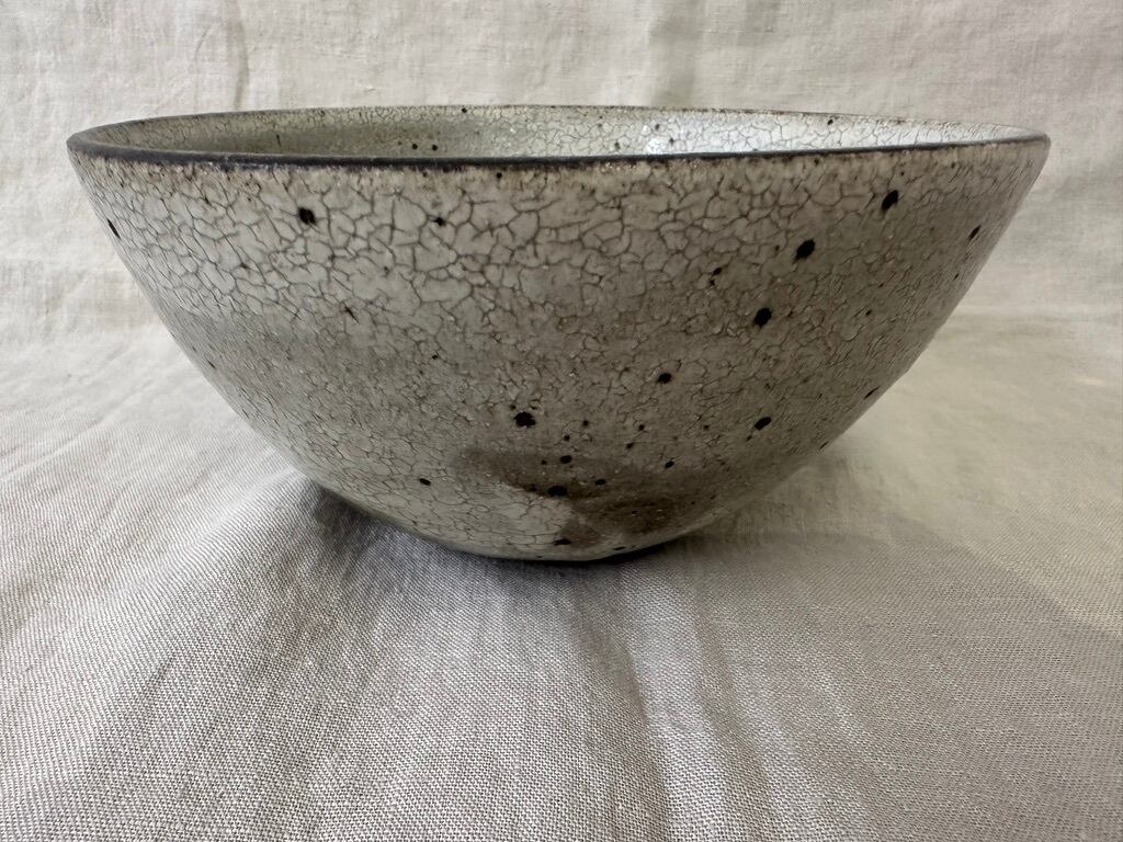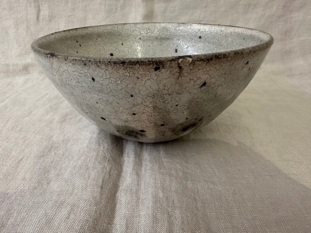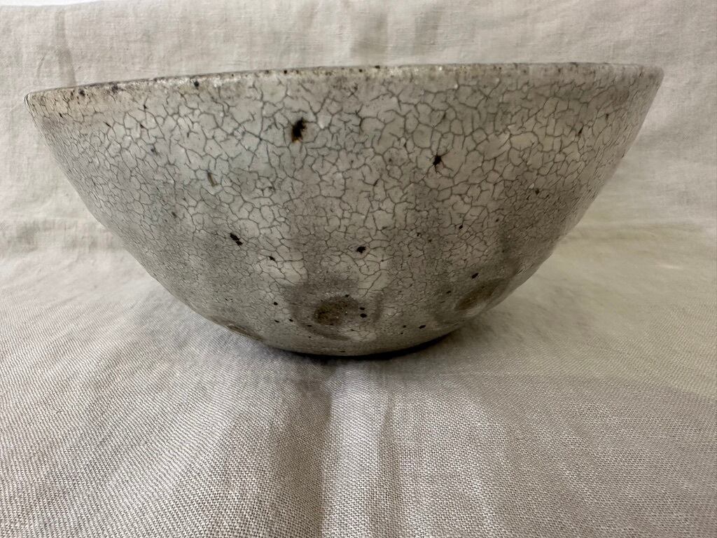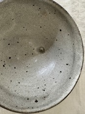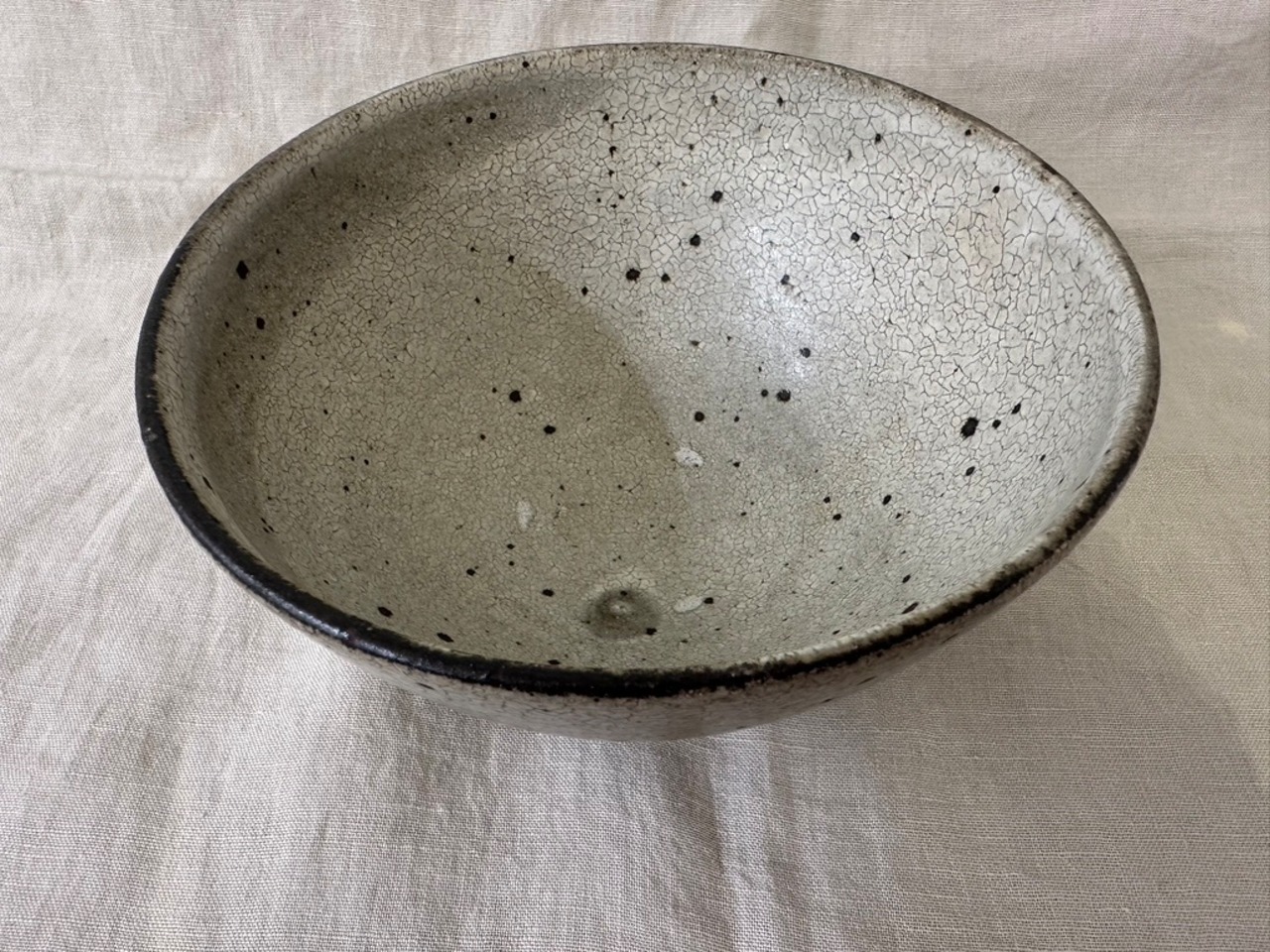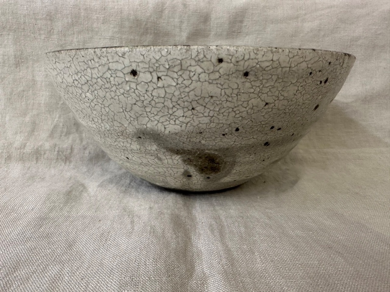 全体に細かな貫入が入っている味のある丸い丼ばちです。口の部分は粉引が薄くなっているので濃い茶色になった部分もアクセントとして面白い味わいです。土の中に含まれている鉄分が焼くことで外に押し出されて、どんぶりの内側にも外側にも黒い点々が出ています。また、釉薬を掛けた時の指痕を敢えて残しています。