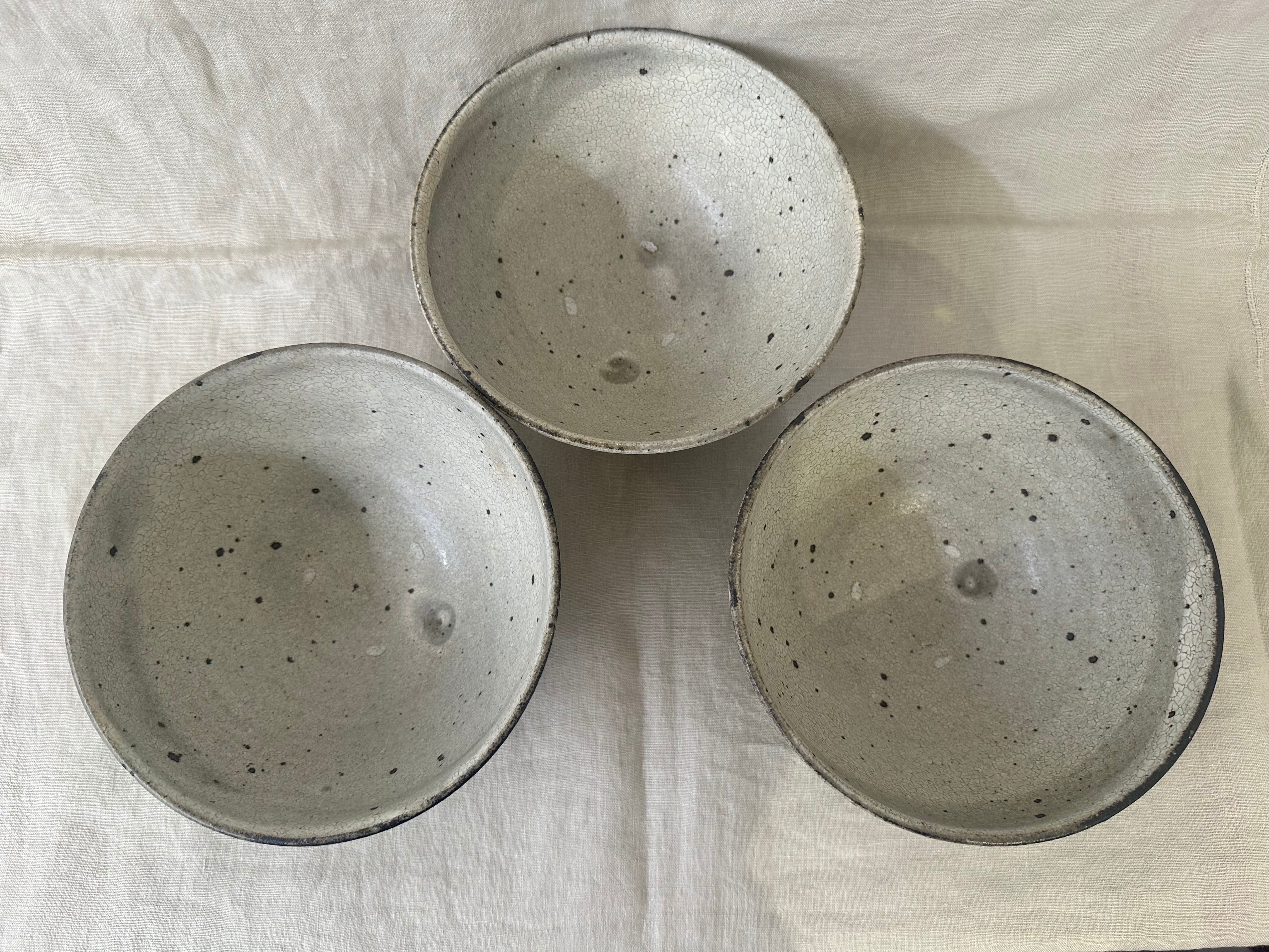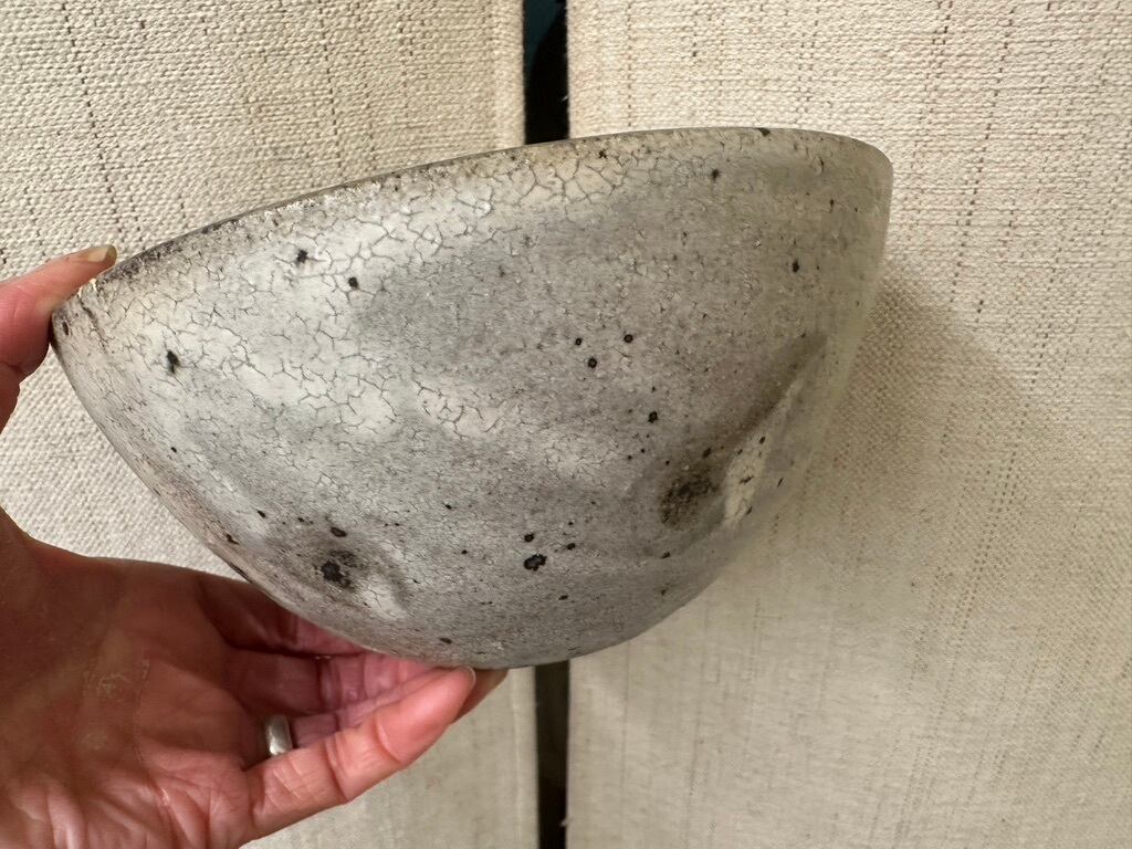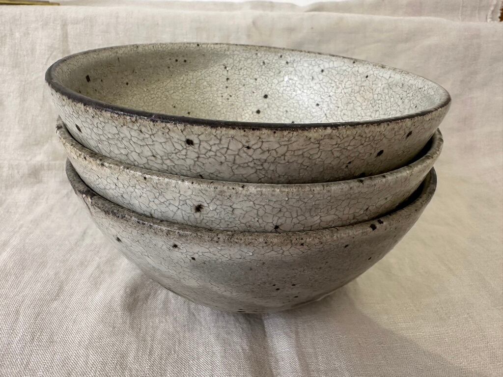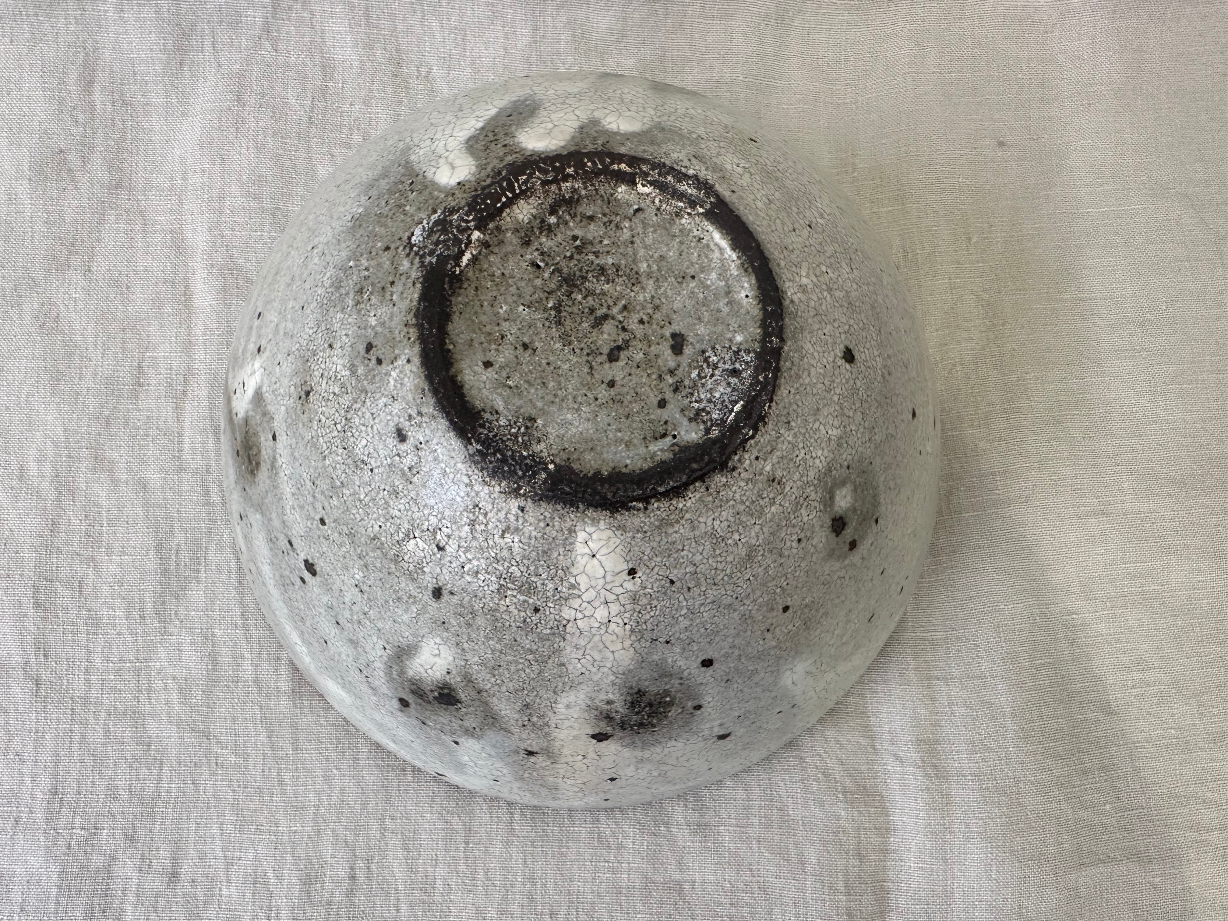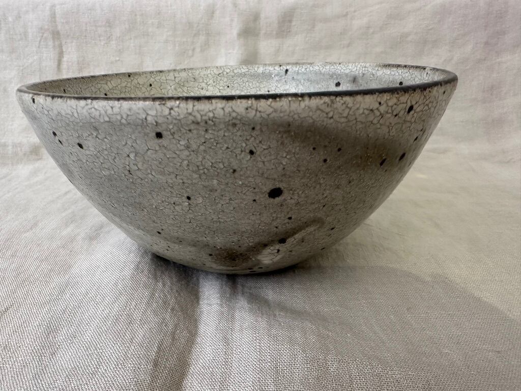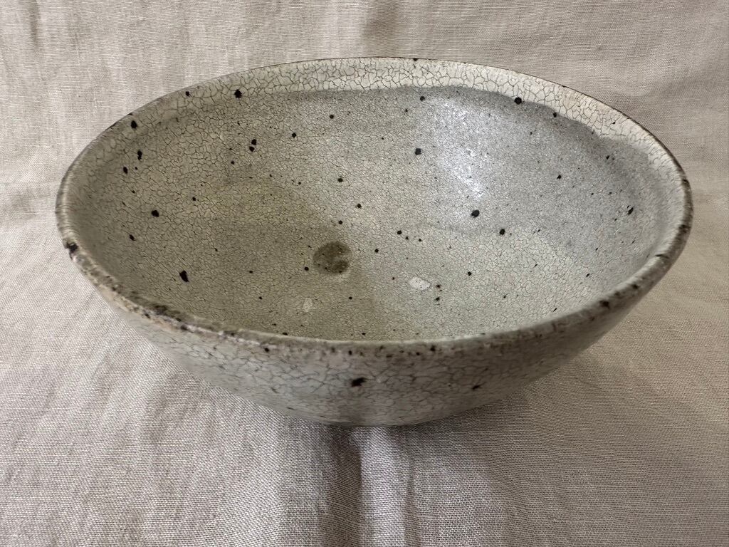 全体に細かな貫入が入っている味のある丸い丼ばちです。口の部分は粉引が薄くなっているので濃い茶色になった部分もアクセントとして面白い味わいです。土の中に含まれている鉄分が焼くことで外に押し出されて、どんぶりの内側にも外側にも黒い点々が出ています。また、釉薬を掛けた時の指痕を敢えて残しています。