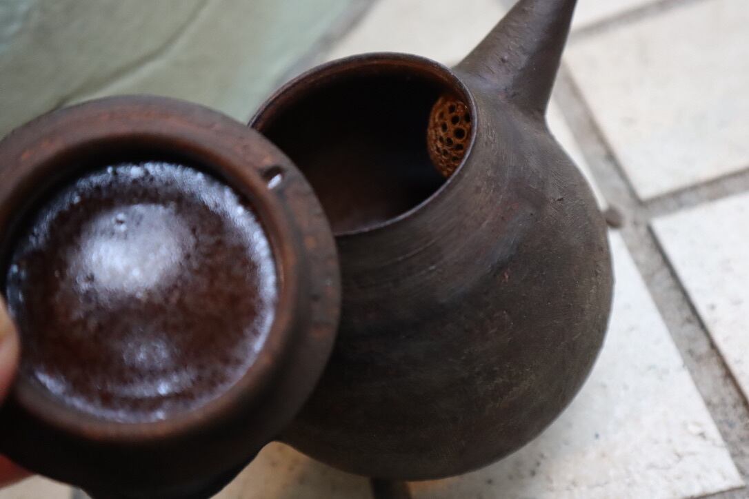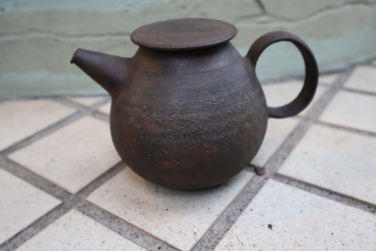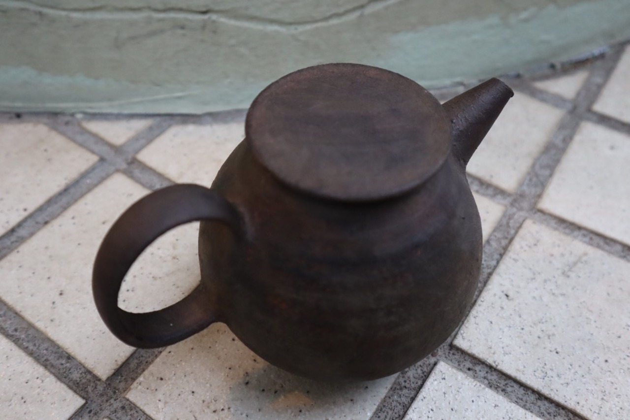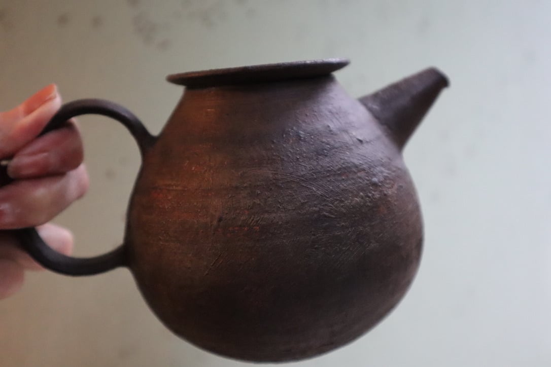 粗めの土を使い、本焼きをした後に漆に粘土や金属などを加えてペースト状にして塗って焼き付けています。焼き上がりを見て、やすったり、漆を重ねることで金属のようにも、土器のようにな風合いも醸し出しています。本来の錆漆ではなく上田さん流の錆漆ポットです