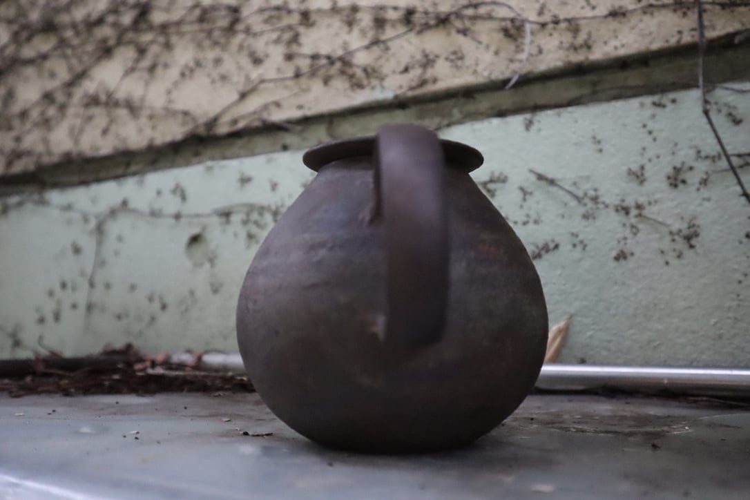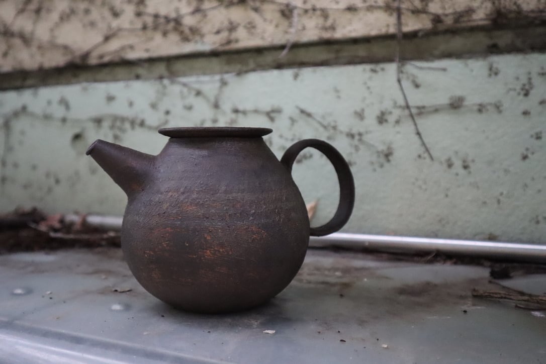 小田原の海に近い工房で製作をしている上田さんの錆漆ポットです