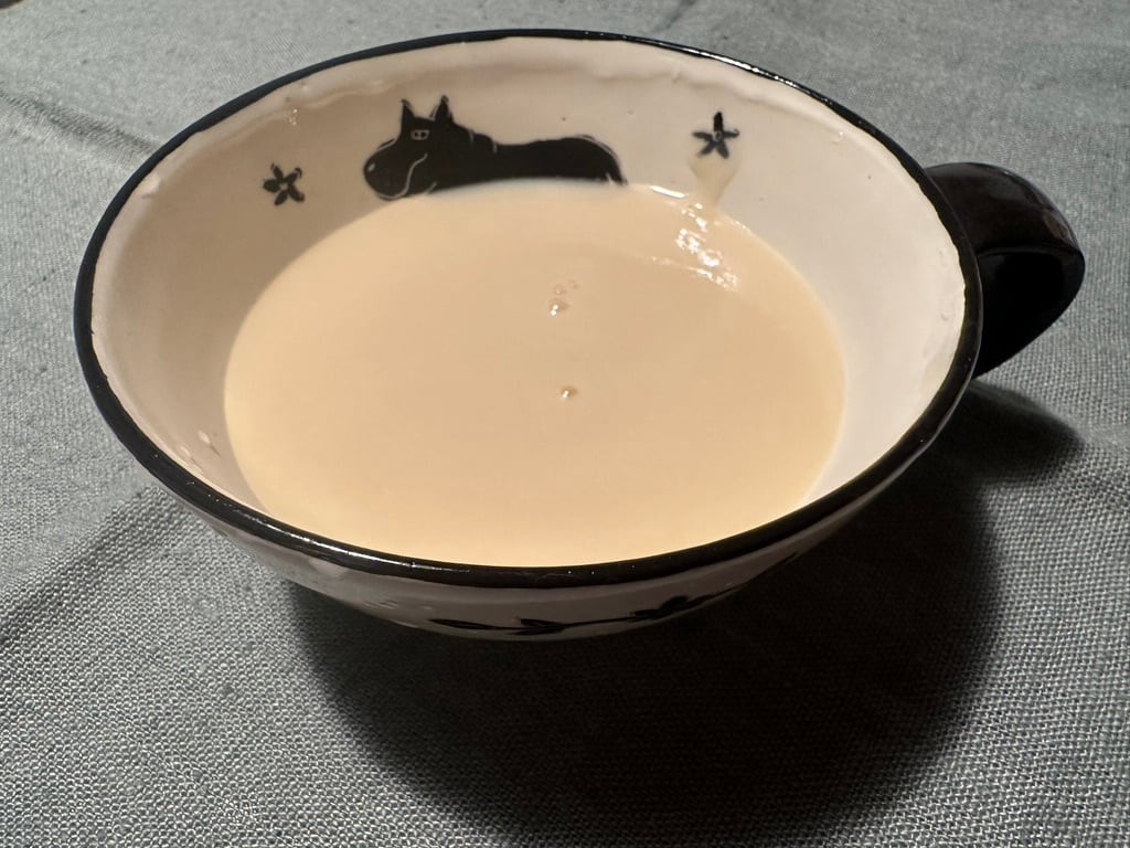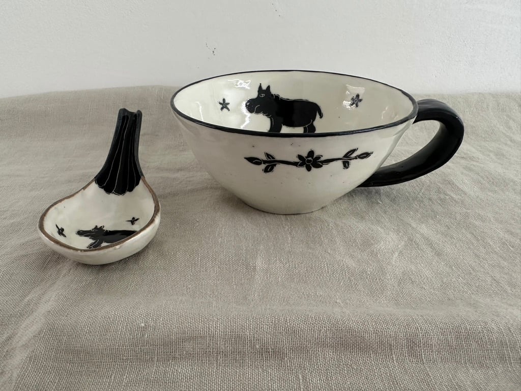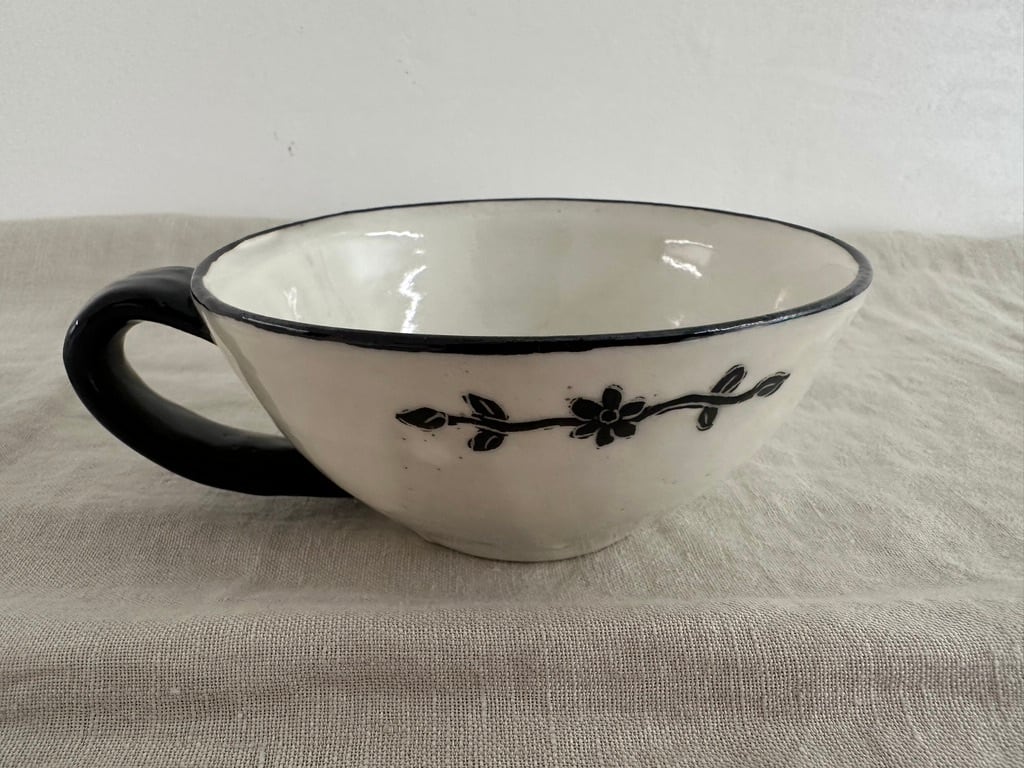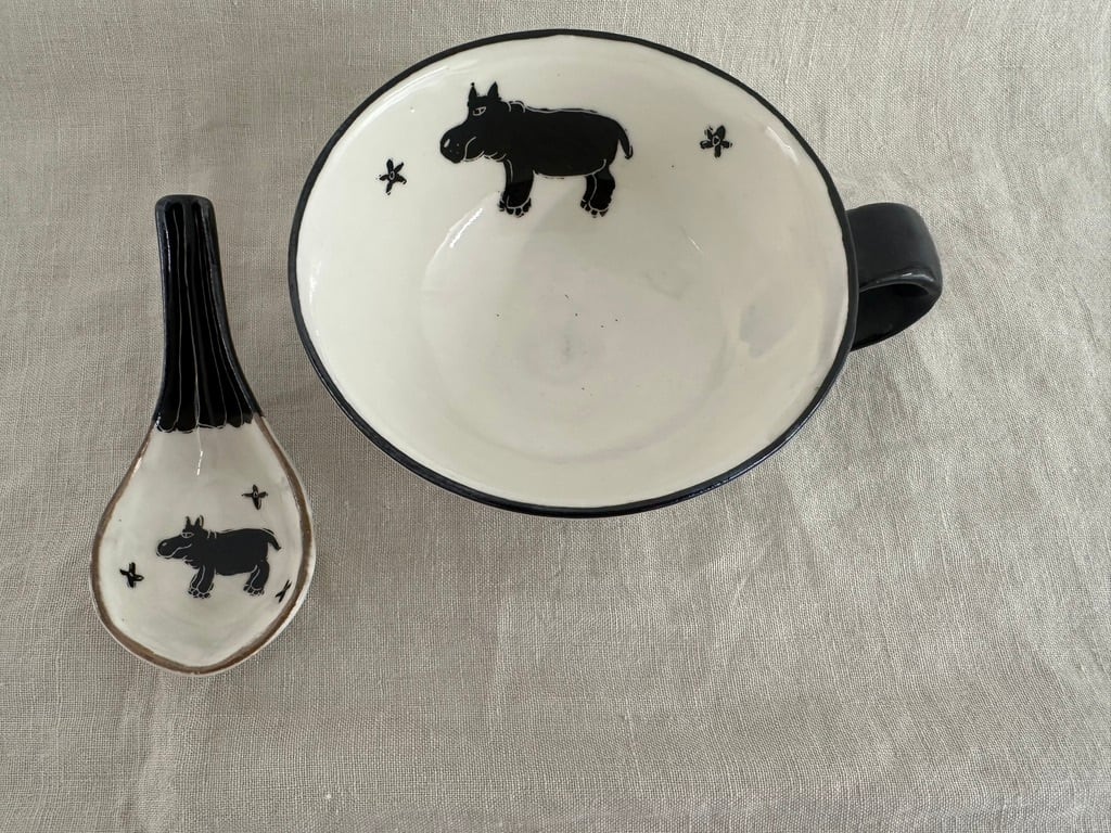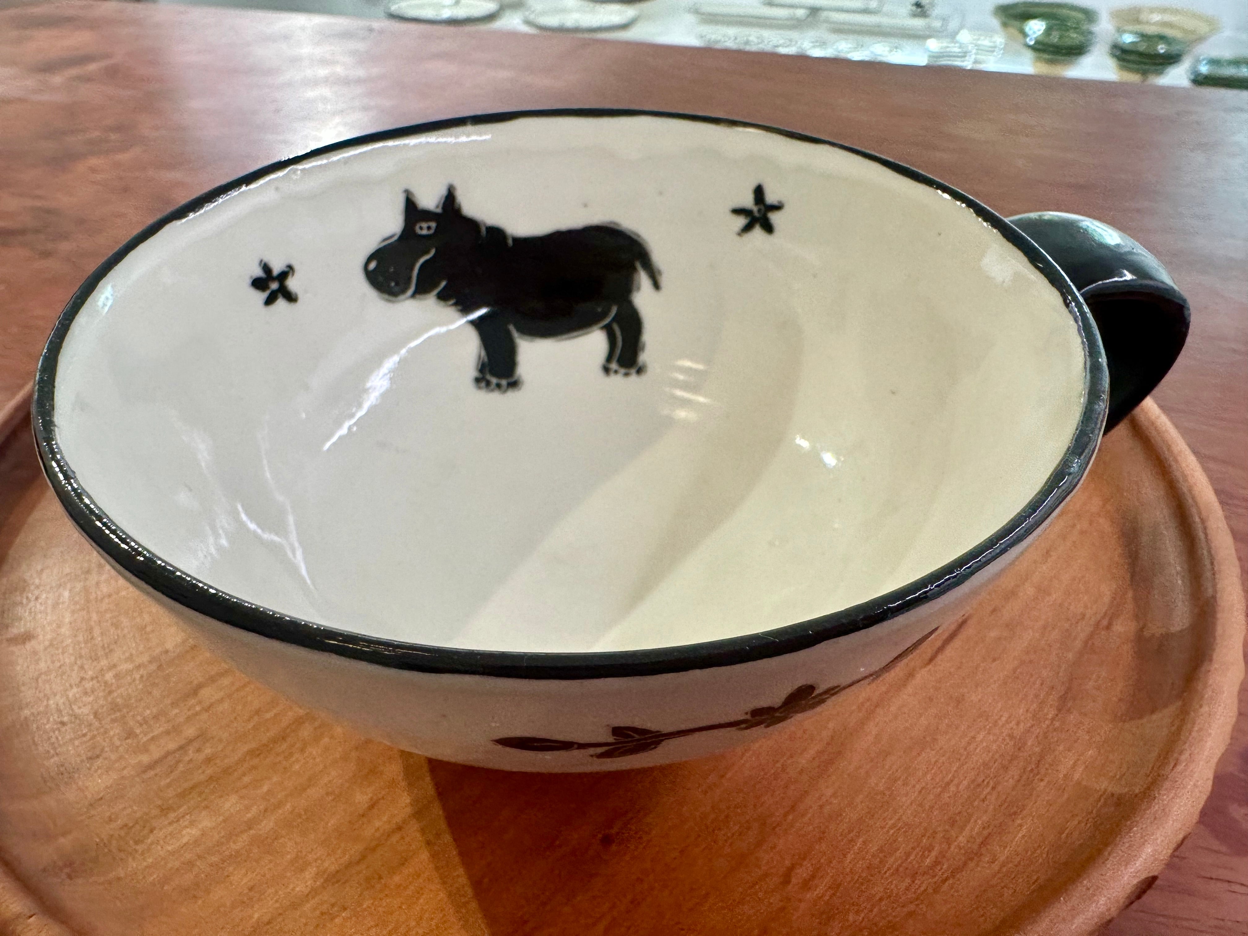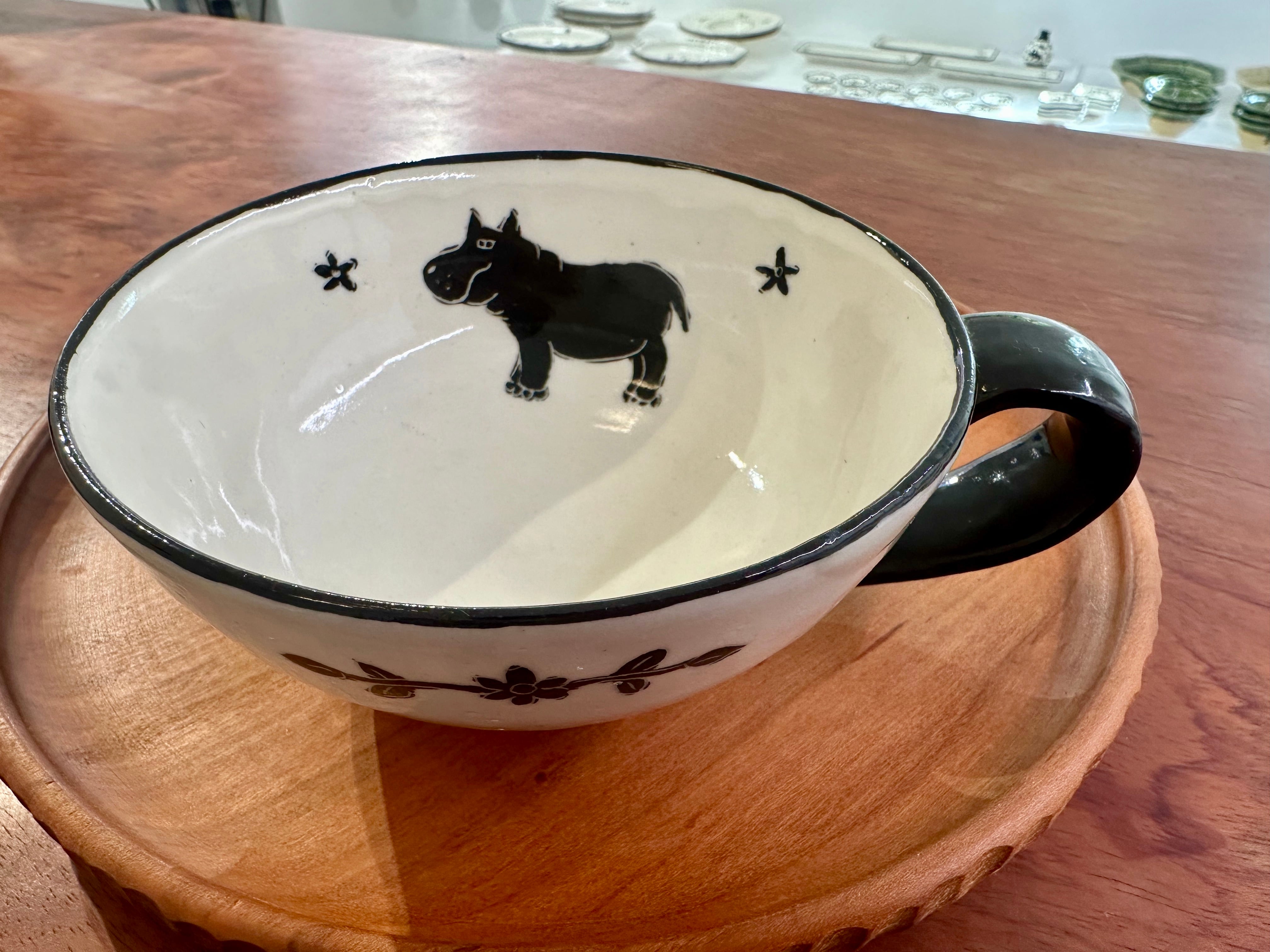 粉引の器に黒い絵具でかばや花を描いてから引っ掻いていく掻き落としの技法で文様をつけています。スープを注ぐとカバが水浴びをしているように見えます