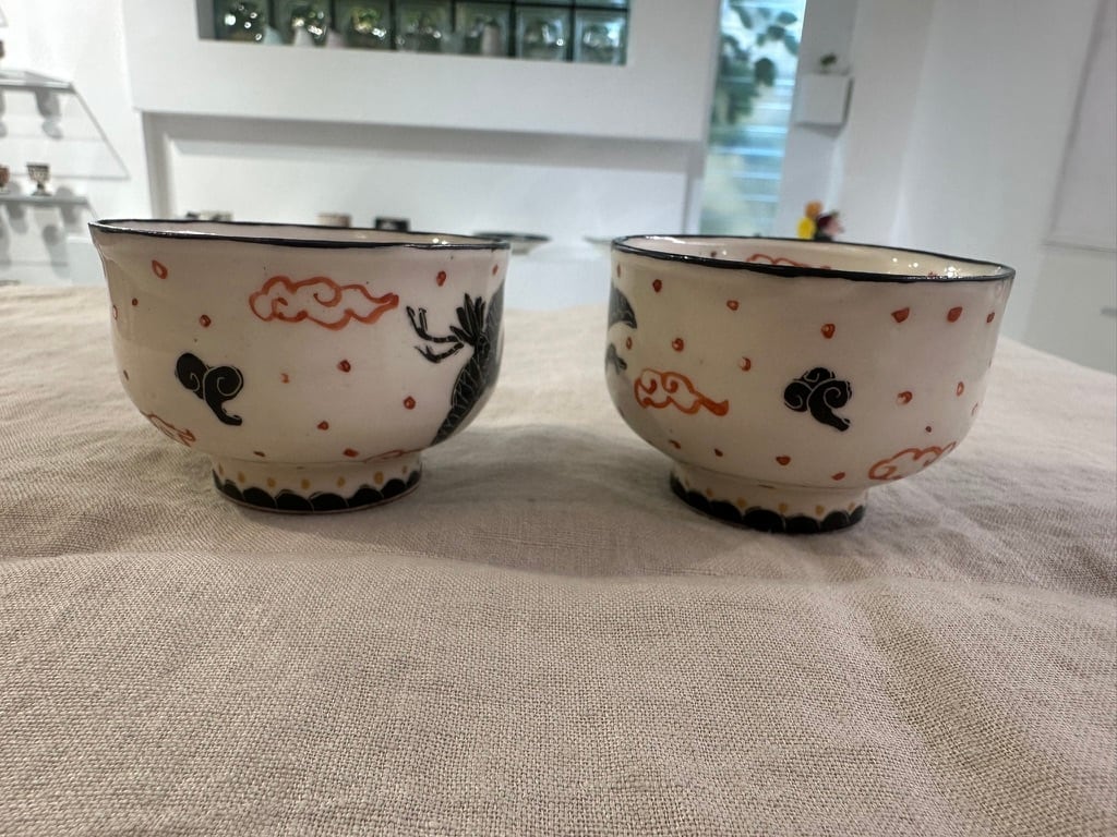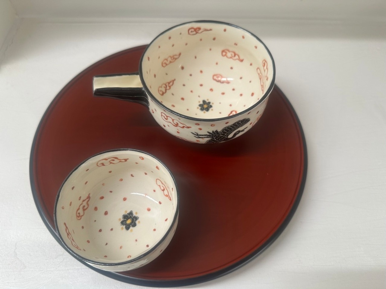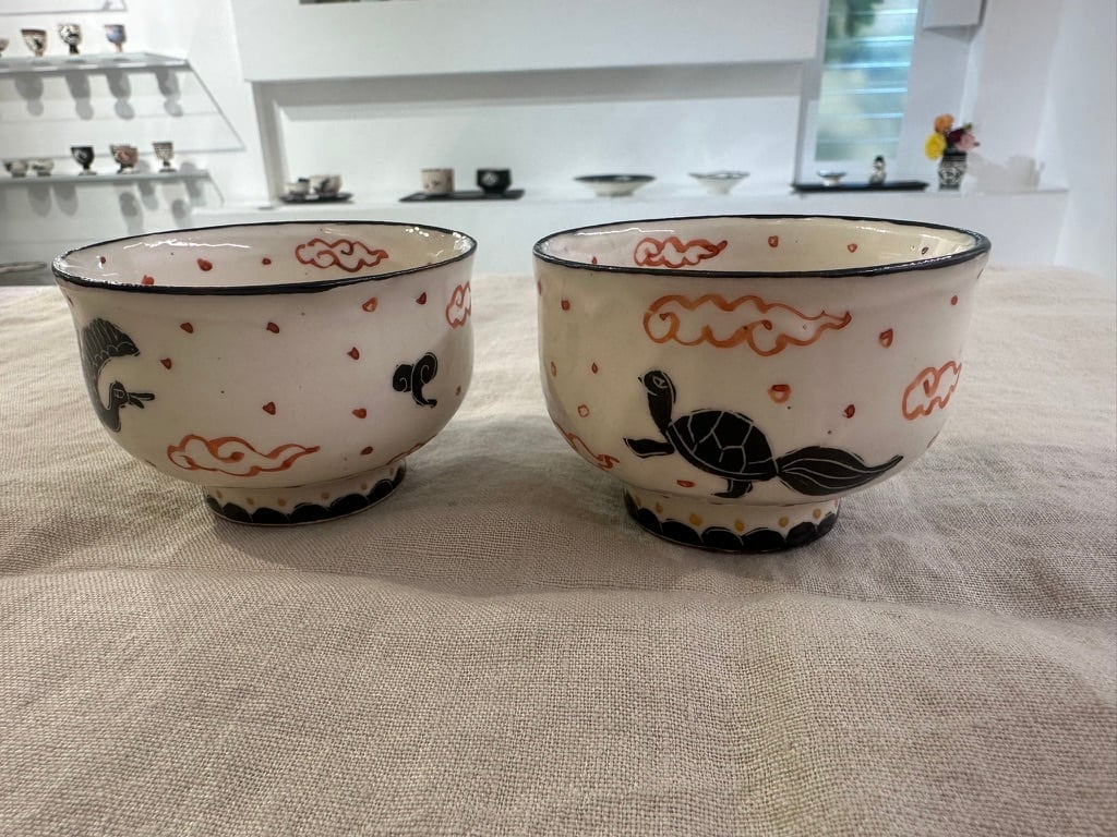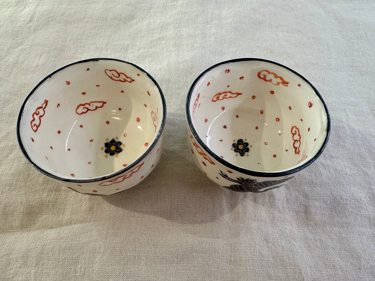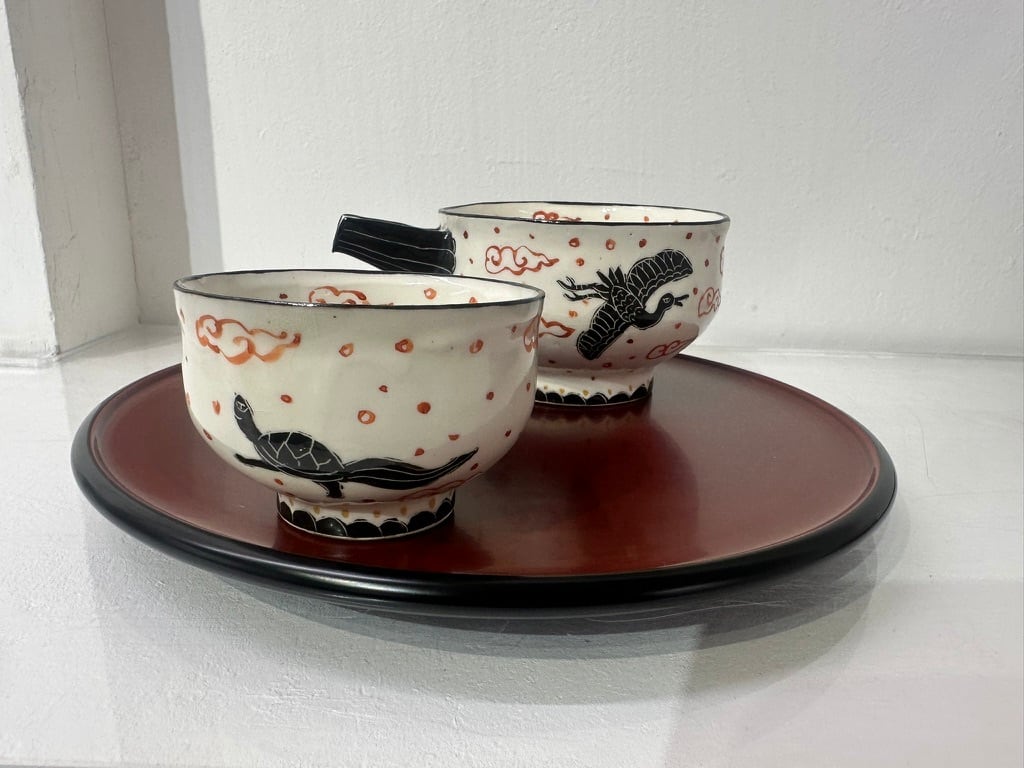 黒い絵具で模様を描き、下地の白化粧の土が細い線で出るように黒い絵具の上から引っ掻く掻き落としで描いた鶴と亀に上絵の赤で仕上げました。おめでたい鶴亀の文様の小さめの碗はお茶にお酒にとお使いください