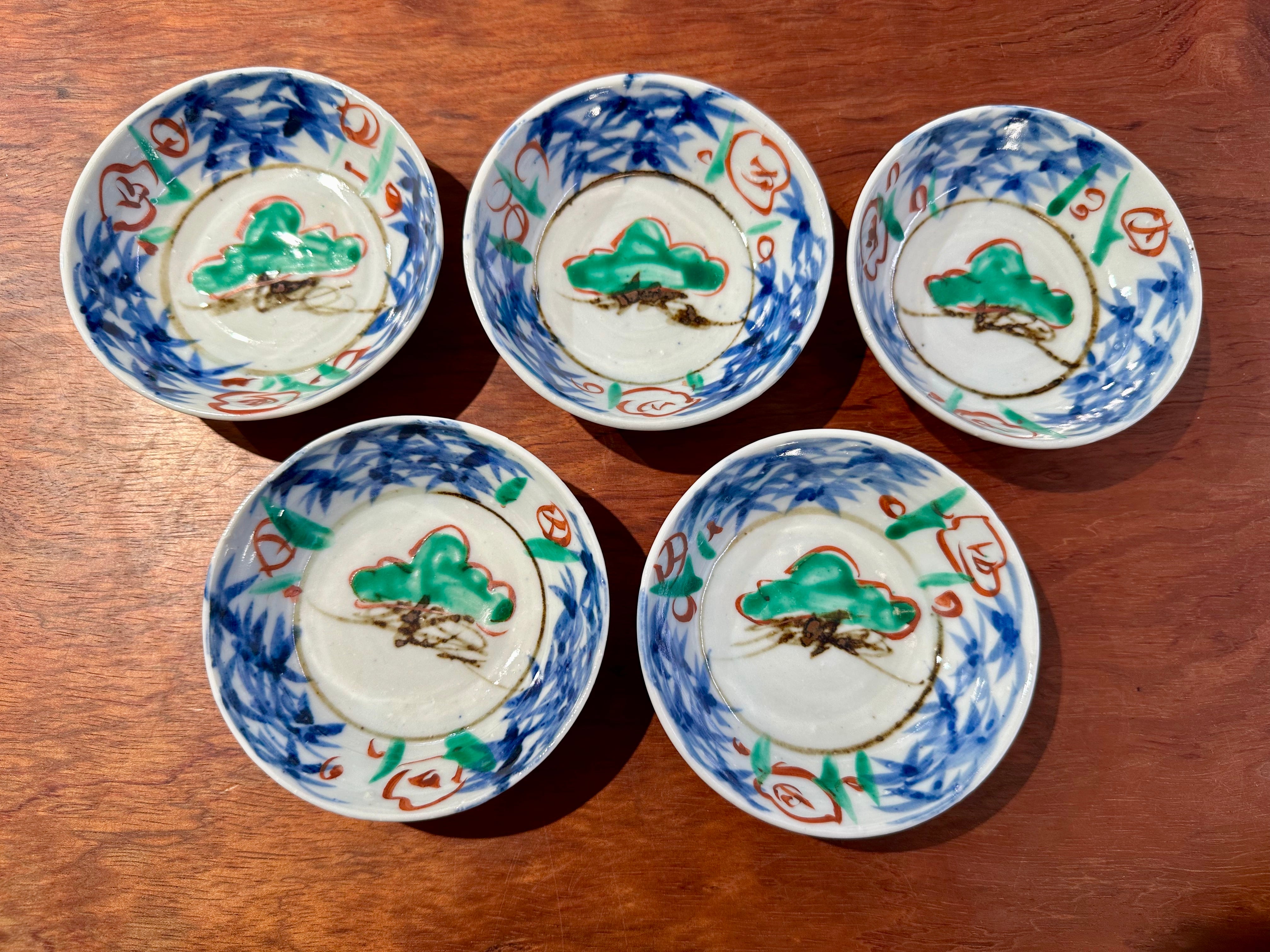 80歳の万作さんが勢いよく小皿に描いた松を囲んで染付と緑の笹と赤い梅の花、