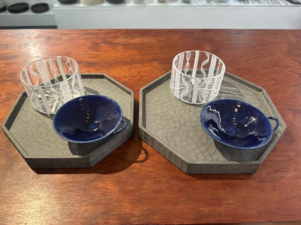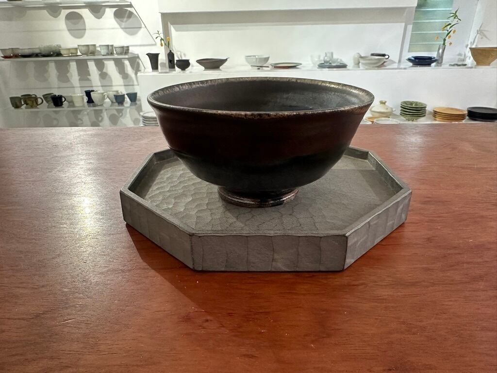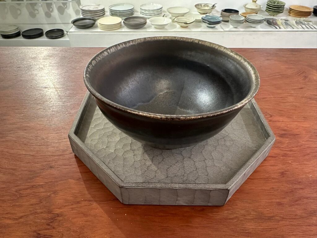 2種類の漆と染料をオリジナルで配合し3~5回ほど塗り重ねて少し青味がかったグレイの上に器を置くと器を引き立ててくれる色です