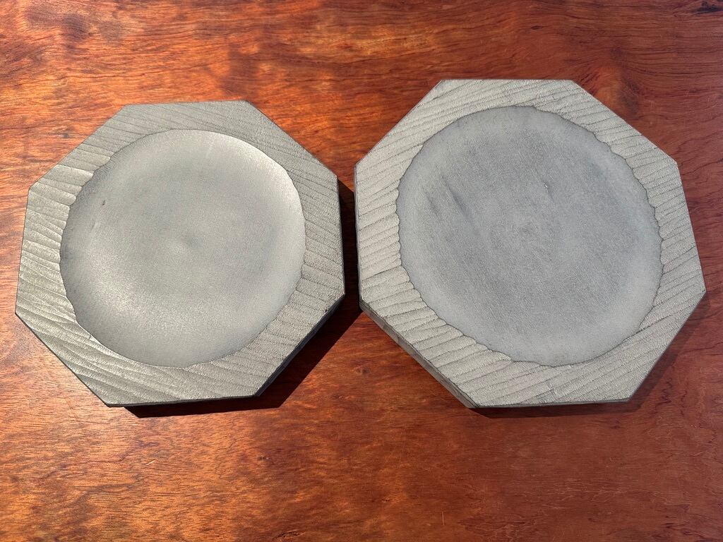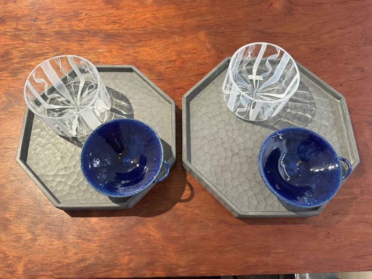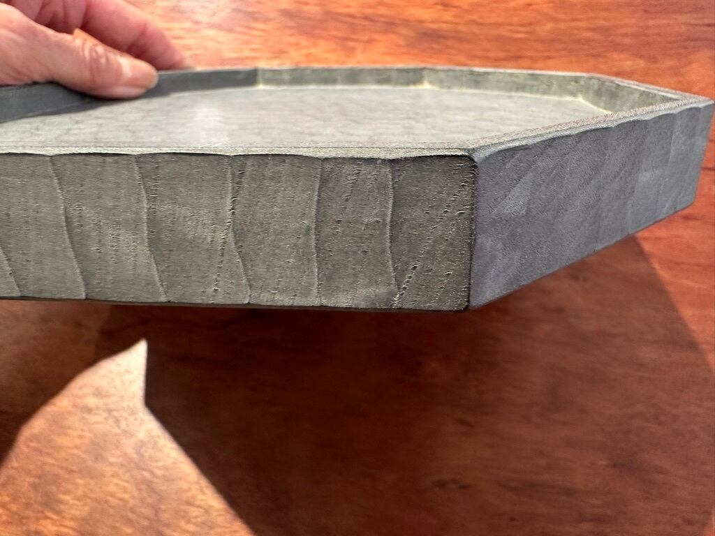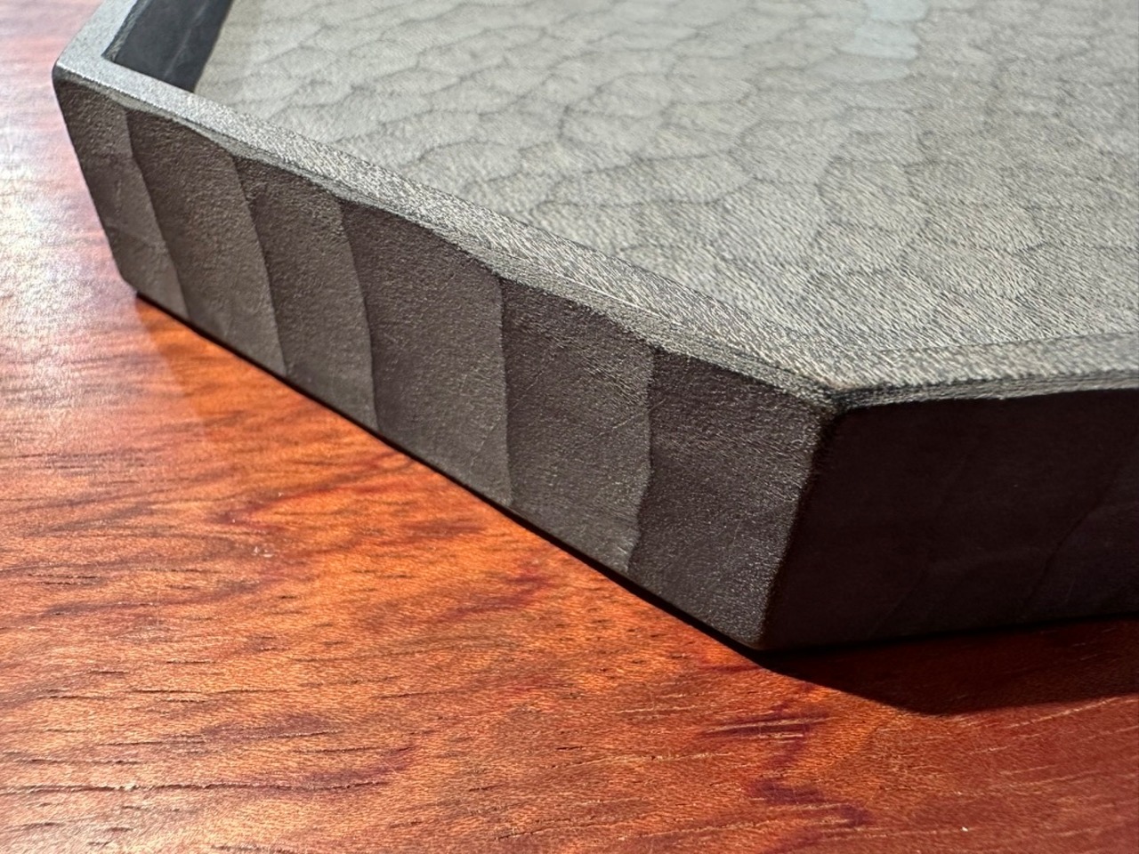 2種類の漆と染料をオリジナルで配合し3~5回ほど塗り重ねて少し青味がかったグレイに仕上げたお盆は側面も彫り込まれて横からの表情も楽しめます。