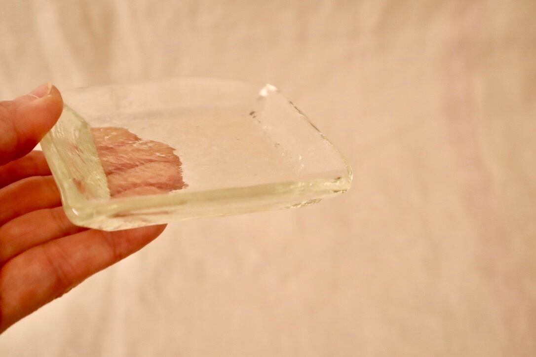ほんのりと琥珀色のガラスを型に吹きいて角皿を作っています
