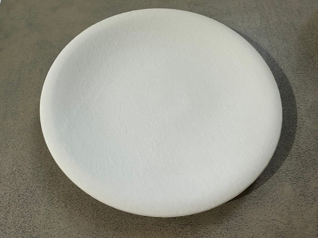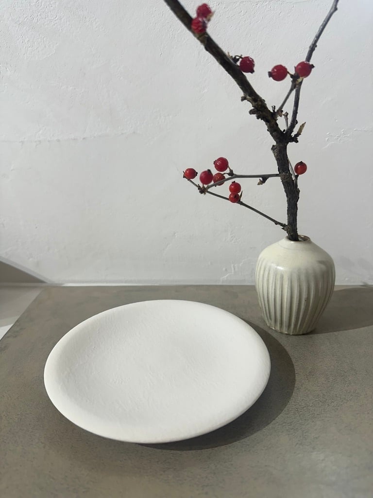 ろくろが大変お上手な村井さんは真っ白な磁器土のお仕事と、磁器にチタン釉を掛けた作品を作られています。こちらの5寸皿は磁器の焼き〆で釉薬をかけてありません。柔らかな磁土を全体に表情が出るように叩きつけています。端正なたたずまいと質感が美しいマットなお皿ですが、お料理の色や匂いの染み込みがないので普段使いにもおすすめです