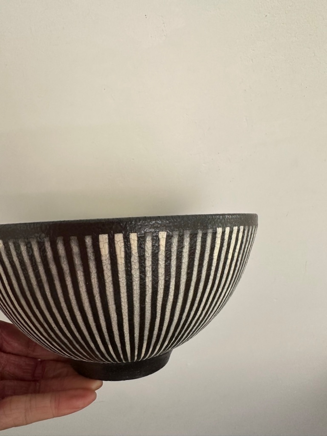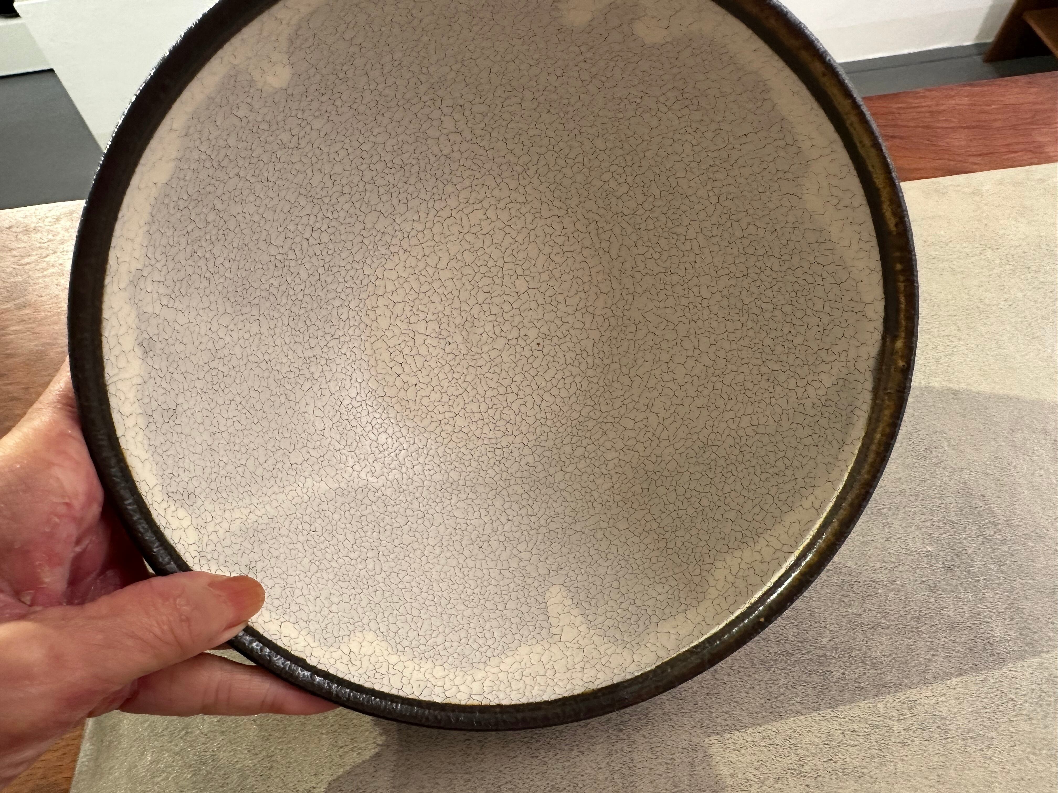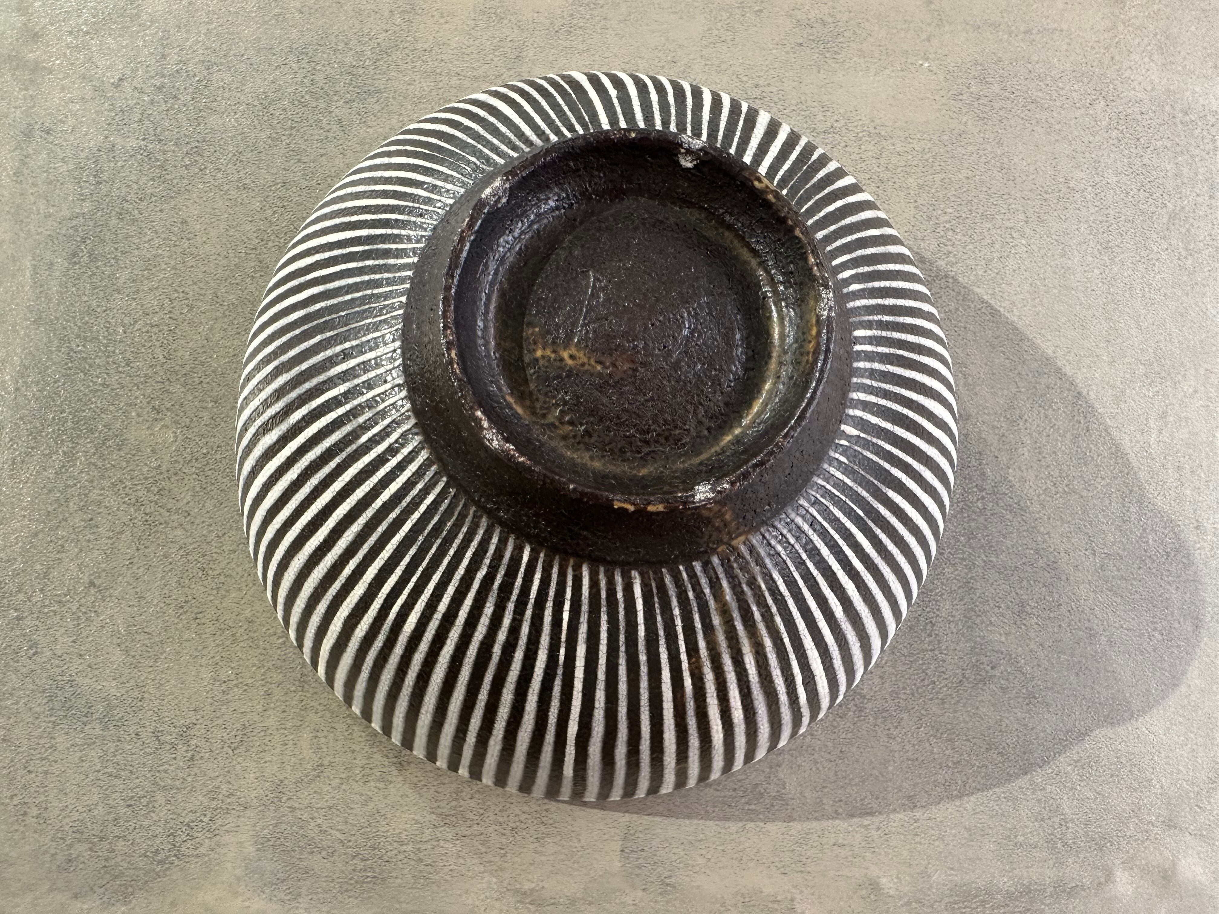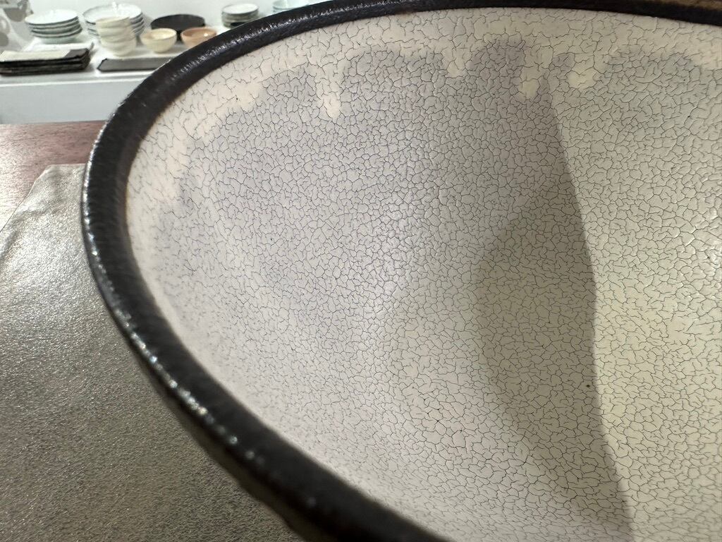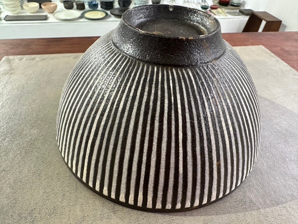 内側が白く、細かな貫入のひび模様が味のある丸どんぶりです。口元の黒、外側のトクサ模様との対比も美しいです。高台がしっかりとあり持ちやすいデザインもありがたいです
