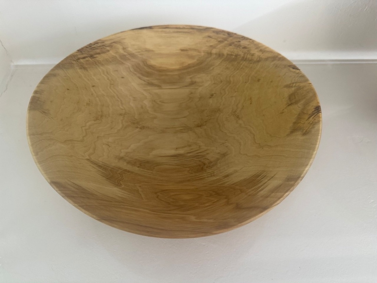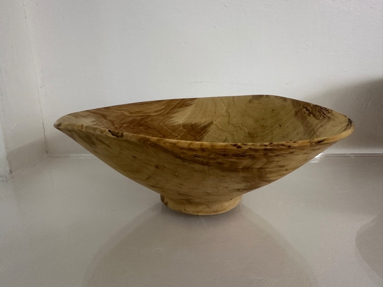 生木はろくろでボウルの形に挽いた後、乾燥の段階で木が動いて変形していきます。自然に動いて楕円状になる形を生かしてしっかり乾燥させた後に、高台を調整します。木目や質感が楽しめるオイル仕上げになっています。木が育つ過程で気候や環境で枝が折れたりする事で木目の動きがとても面白く出ている鉢になります